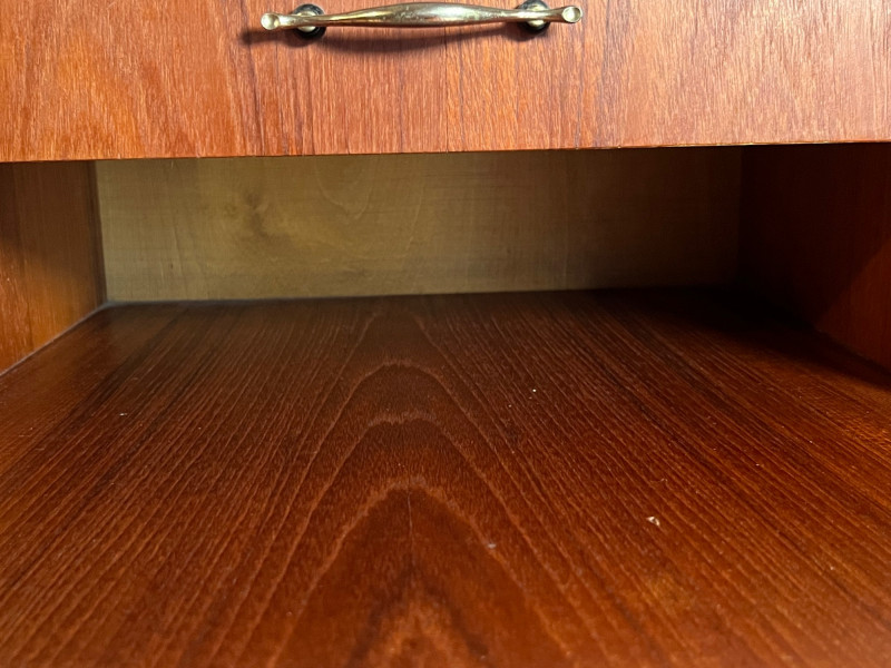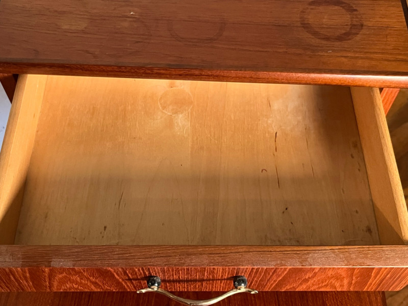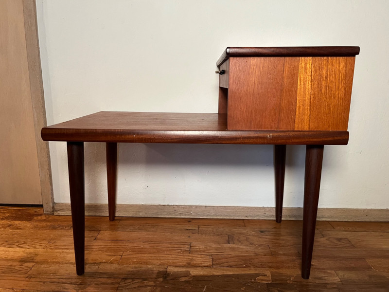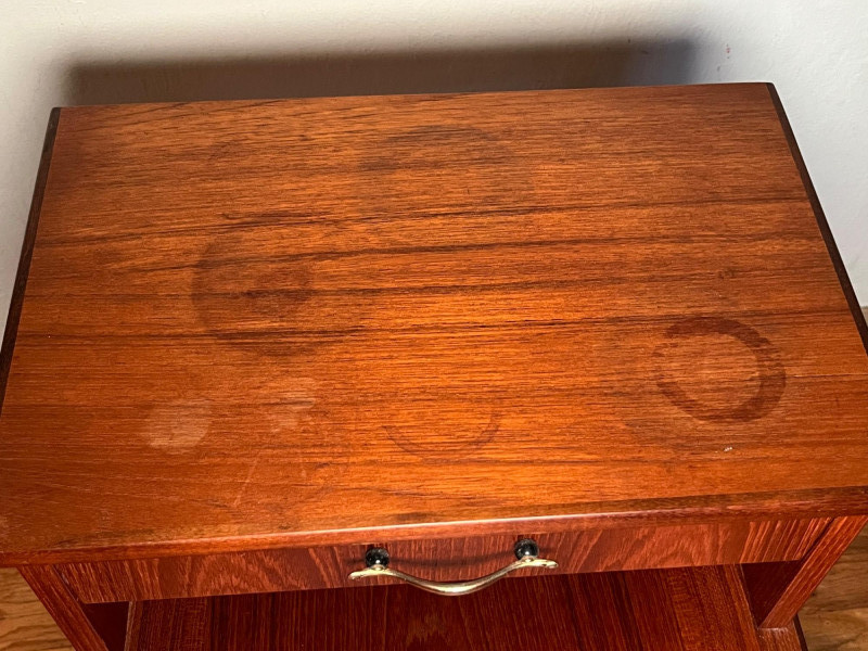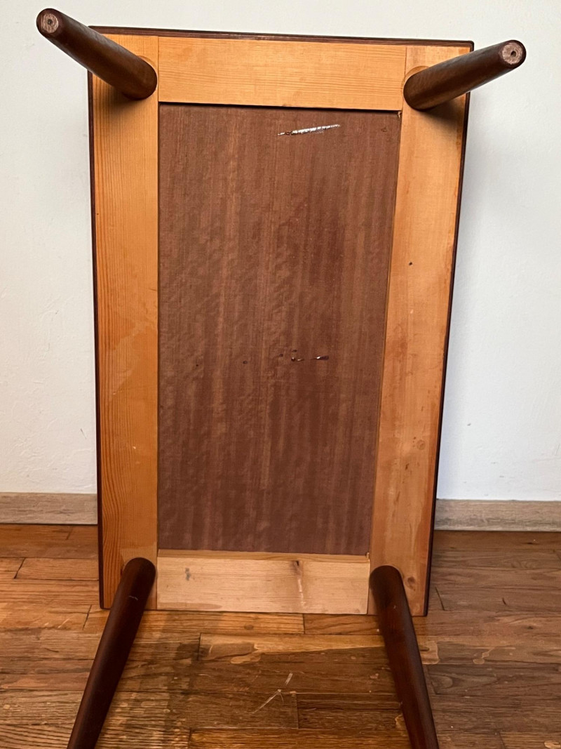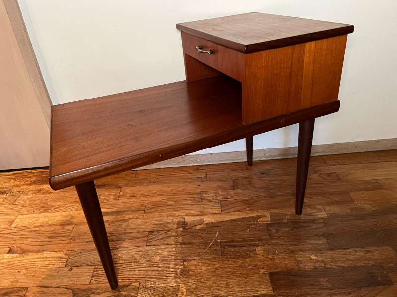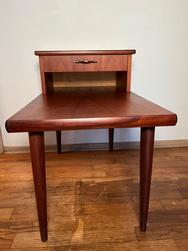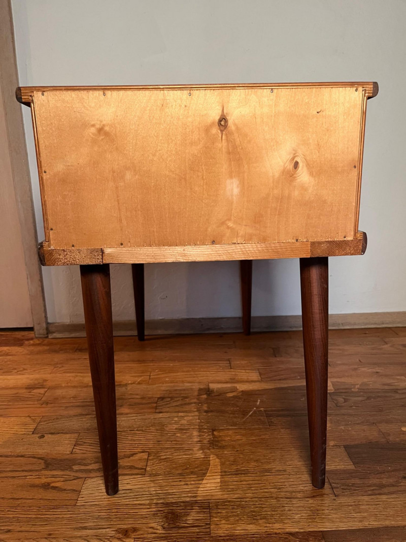 Warm, classic mid‑century wooden side table featuring a single drawer and an elevated upper shelf. The piece showcases the era’s clean lines, tapered legs, and functional design, offering both display space and practical storage. Details & Condition: Solid wood construction with mid‑century styling Single drawer with original pull; opens and closes smoothly Raised top shelf ideal for books, décor, or bedside use Stable structure with firmly attached legs Surface wear consistent with age, including circular marks and finish wear on the top Drawer interior clean with expected vintage patina Underside and joinery photographed for transparency Notes: