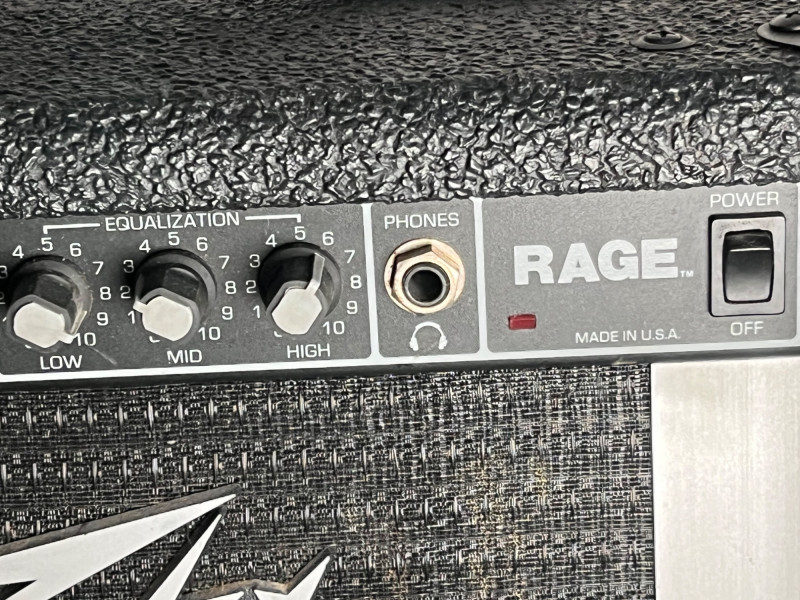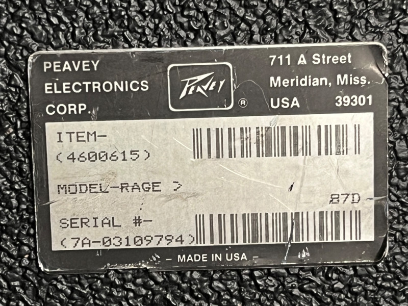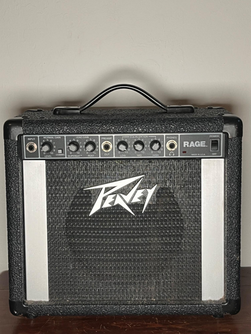 Peavey Rage electric guitar amplifier, Model Rage 2, made in the USA. Classic compact practice amp with front‑panel controls for Preamp Gain, Master Level, and 3‑band EQ (Low, Mid, High). Features original Peavey 4Ω speaker (70777079) and factory labels intact. Serial number visible on rear panel. Tested for power and basic functionality. Features & Details: Model: Peavey Rage / Rage 2 Power: 12 Watts, 120V, 60Hz Speaker: Peavey 4Ω (70777079) Controls: Preamp Gain, Master Level, Low/Mid/High EQ Inputs/Outputs: Standard instrument input Rear panel includes original manufacturer label and serial number Made in Meridian, Mississippi, USA Patent pending marking on cabinet badge Condition: