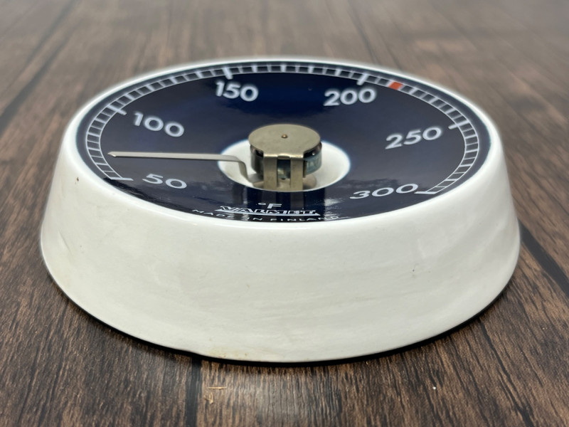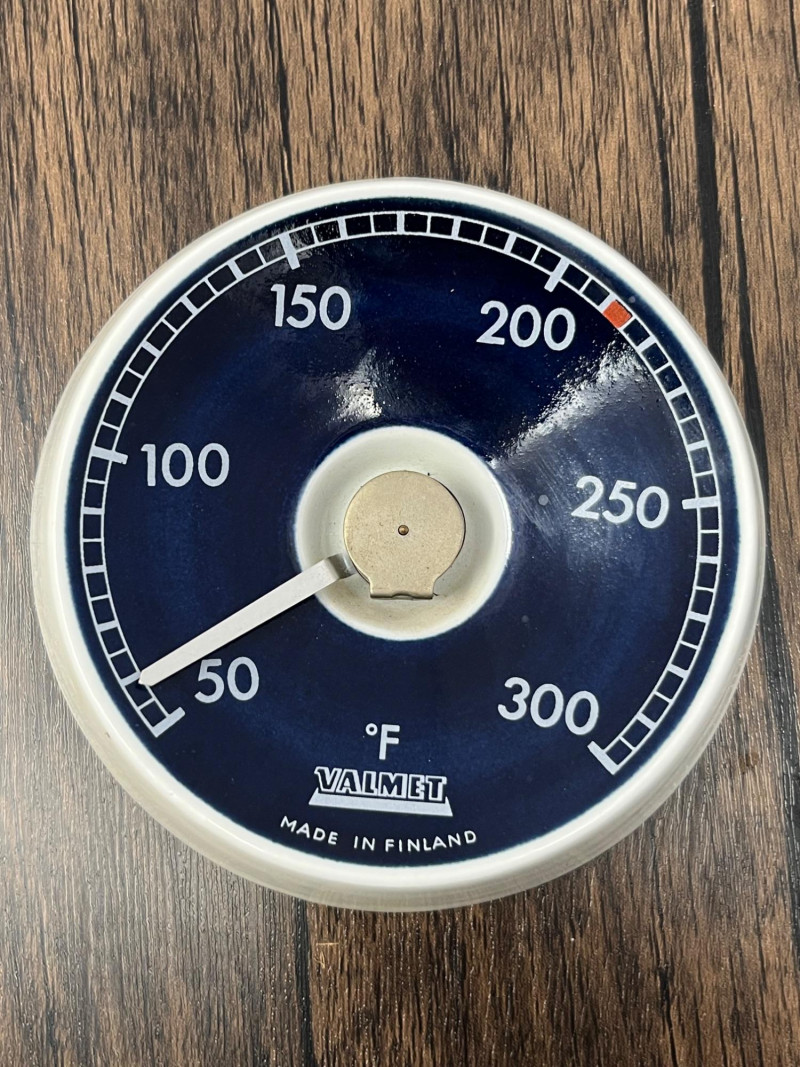 Vintage Finnish sauna thermometer featuring a VALMET dial mounted on a sculptural ceramic base marked ARABIA – Finnish Design – Made in Finland. The thermometer displays temperatures from 50°F to 300°F and retains its original blue face with crisp white numerals. A well-made, functional, and collectible example of mid‑century Finnish sauna design. The ceramic housing shows Arabia’s characteristic clean lines and quality craftsmanship. Backside markings include SAUNA THERMOMETER, FINNISH DESIGN, ARABIA, and MADE IN FINLAND, confirming authentic production. A great piece for collectors of Scandinavian design, sauna accessories, or Arabia ceramics. Condition: