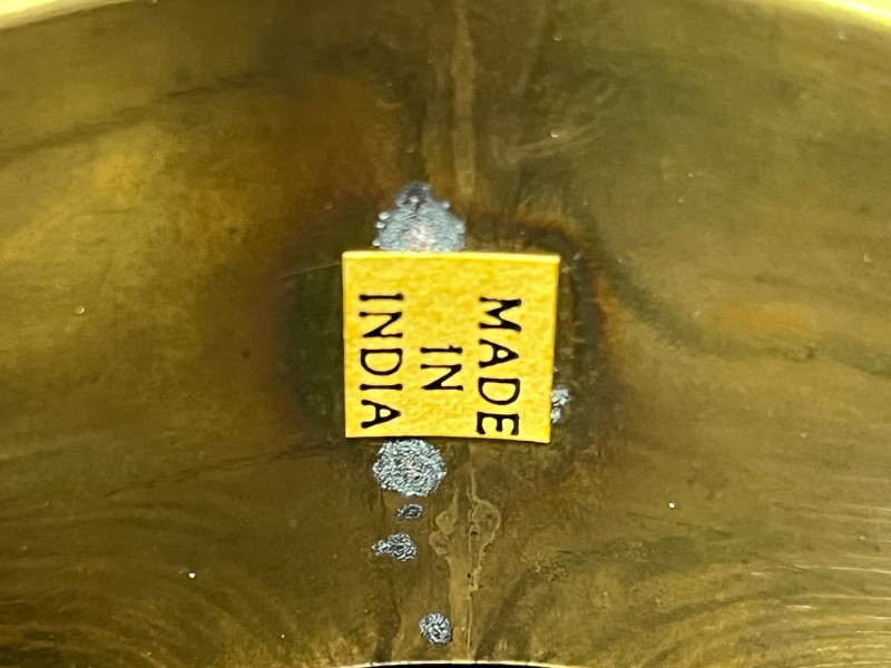 A mid‑20th‑century Indian cuff bracelet featuring traditional workshop craftsmanship from the 1960s–70s export era. The piece is hand‑etched with repeating geometric and stylized motifs, executed in mixed‑metal tones including brass, copper, and darkened accents. Patterns show the irregularities and depth characteristic of individually tooled designs rather than later machine‑pressed production. Interior marked “Made in India.” Dimensions: