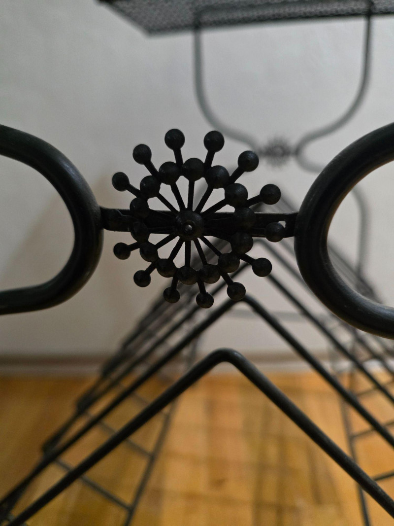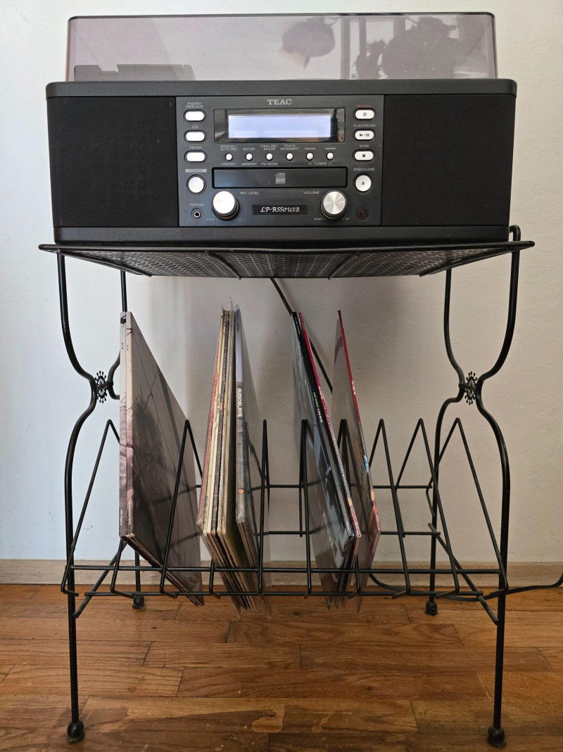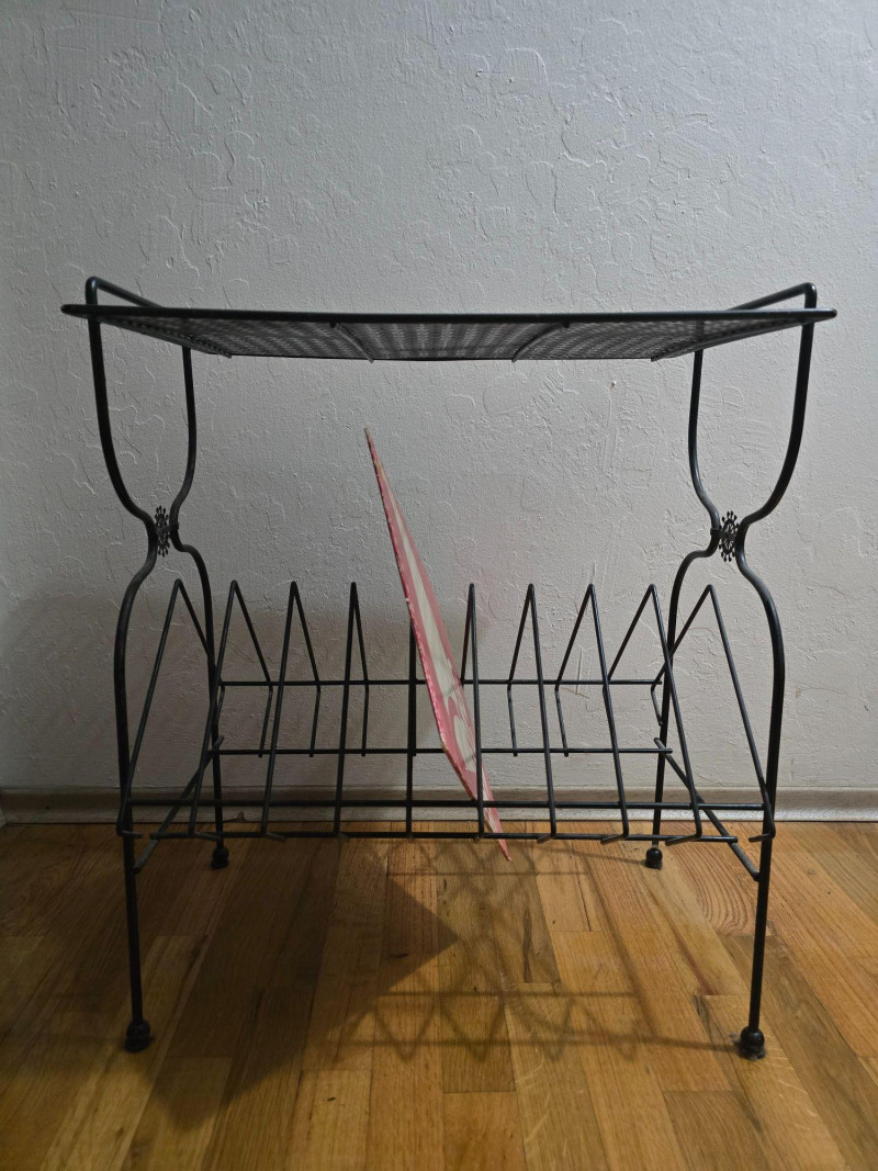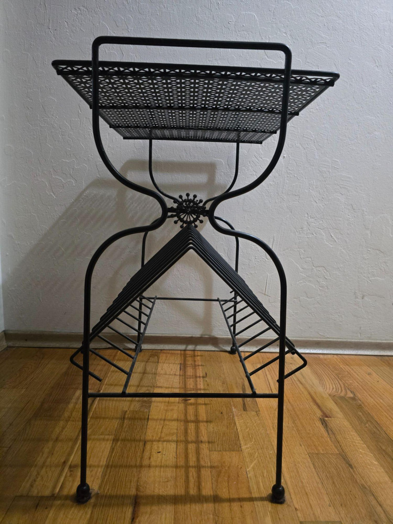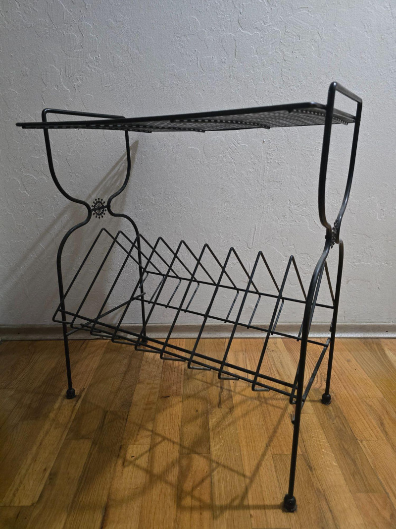 Metal side table featuring an integrated lower rack designed for storing and displaying vinyl records. The piece has a decorative curved‑rod construction with a flat upper surface suitable for use as a small table, plant stand, or display platform. Lightweight, sturdy, and visually appealing, it works well in listening rooms, living spaces, or as a functional accent piece. The vinyl records & Record System shown in the photos is not included and is used only to demonstrate how the storage area displays and holds LPs. Condition: