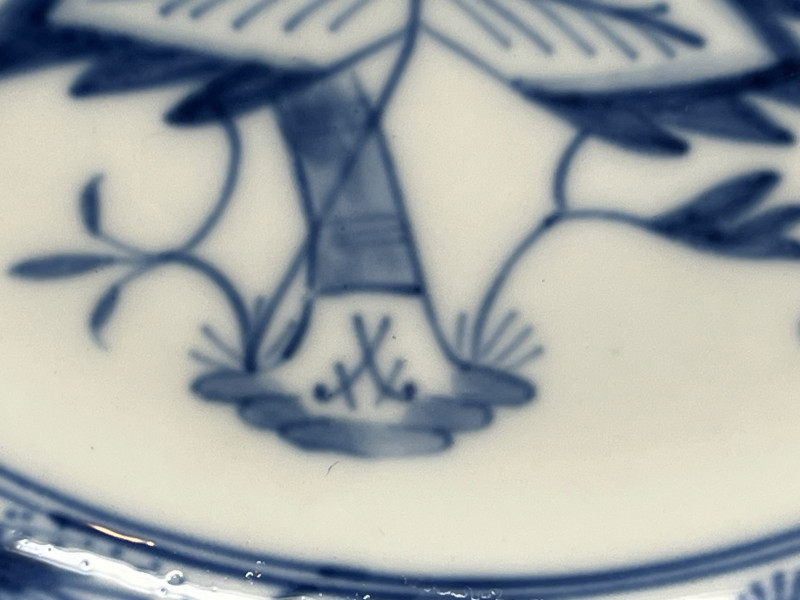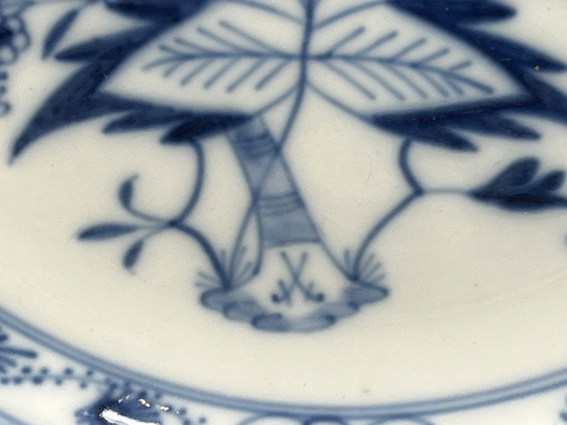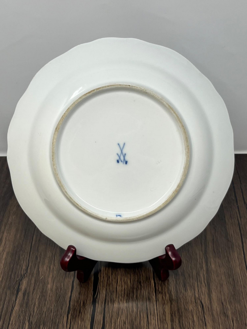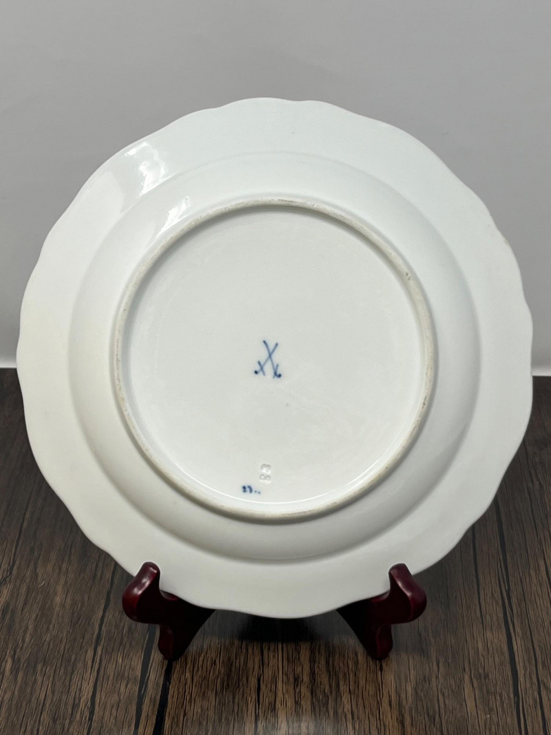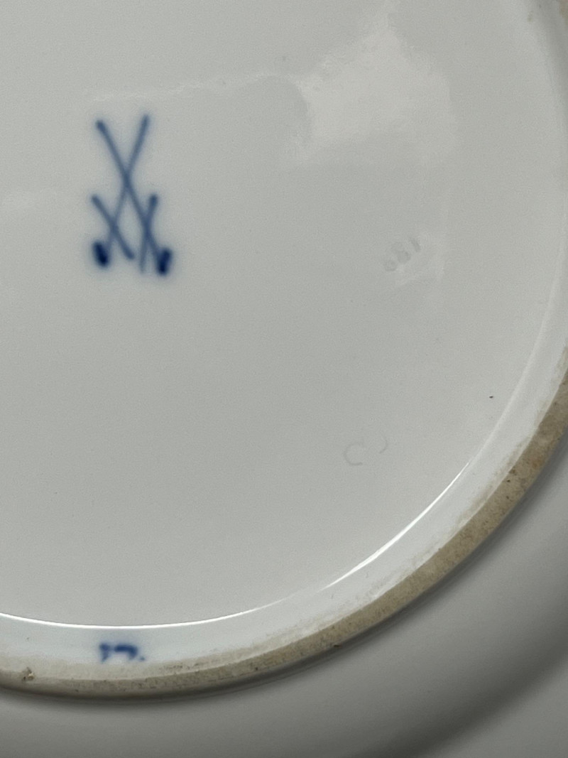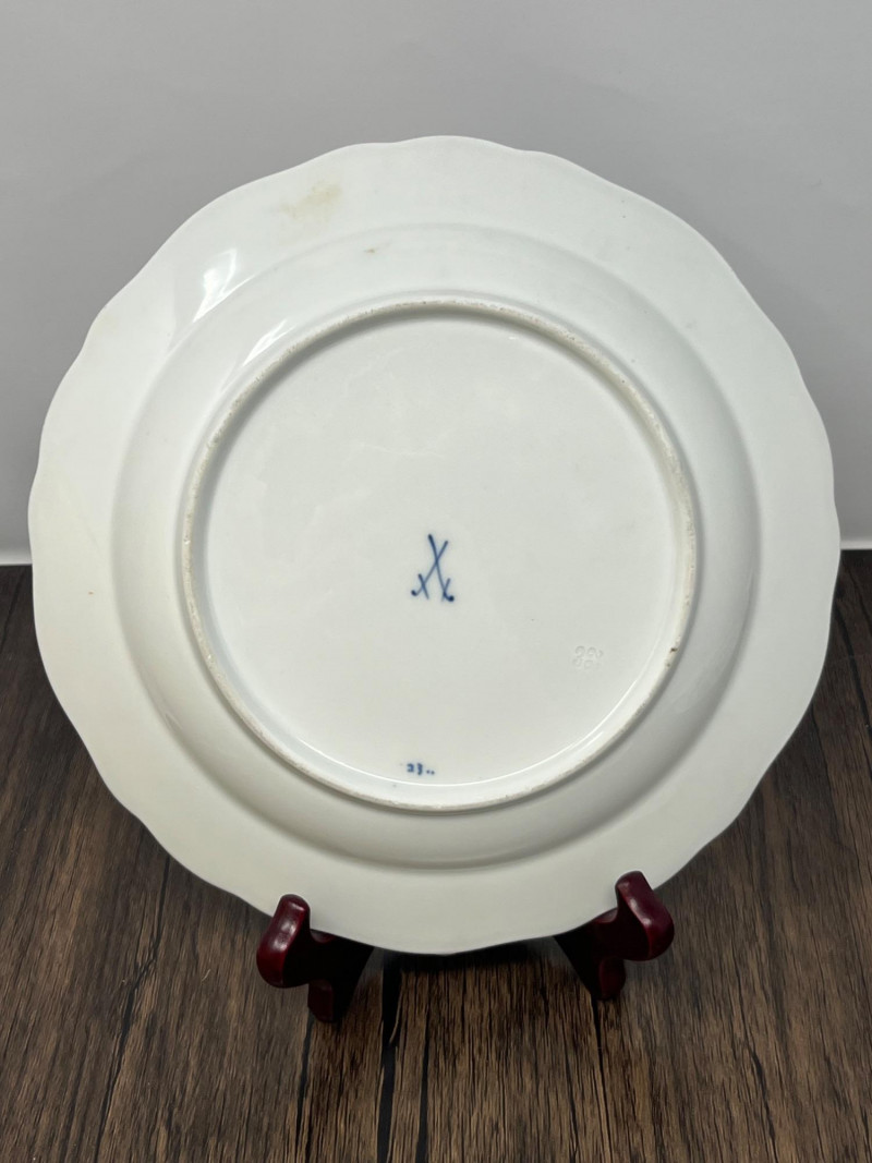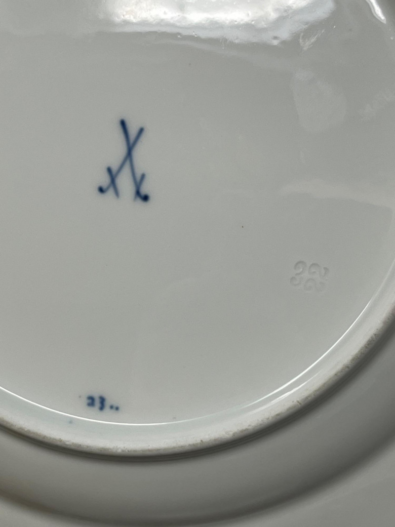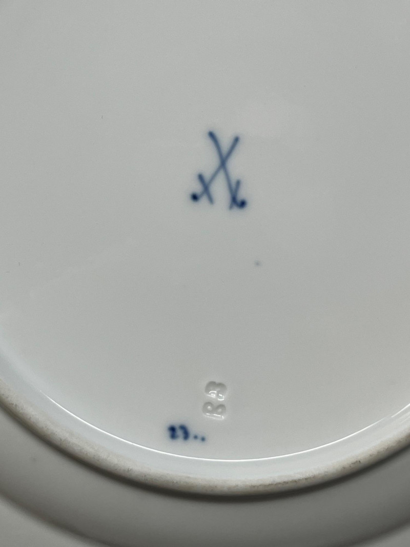 Set of three blue‑and‑white porcelain plates attributed to Meissen, each bearing hand‑painted crossed‑swords marks on both the decorated face and the underside. The marks are loosely rendered with visible brush irregularities, consistent with sloppy or decorator‑applied versions of the Meissen crossed‑swords emblem, a motif first introduced by the Meissen manufactory in the early 18th century and still used—always in cobalt—across its porcelain output. The plates feature traditional Meissen‑style floral decoration in cobalt blue, with each piece showing slight variations in brushwork typical of hand‑painted porcelain. Undersides include impressed numerals and painter’s marks often associated with production tracking within the Meissen workshop system. The group presents well as a cohesive decorative set. Meissen Mark Notes (General, Verifiable) The crossed‑swords emblem is the longest‑used porcelain trademark in Europe, adopted by Meissen around 1720. Authentic Meissen marks are always applied in cobalt underglaze. Variations in sword shape, hilt form, and line precision occur across periods, painters, and production tiers; sloppy or uneven marks are documented on later‑period and decorator‑applied pieces. Impressed or incised numbers typically indicate mold or form numbers used by the manufactory. Condition Sloppy hand‑painted crossed‑swords marks on face and underside of all three plates Cobalt floral decoration intact with expected age‑related wear Minor firing marks and small production imperfections visible No major structural issues observed