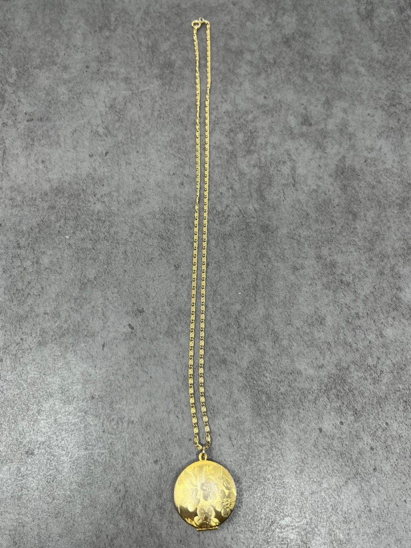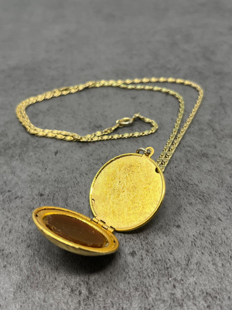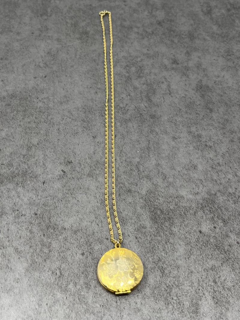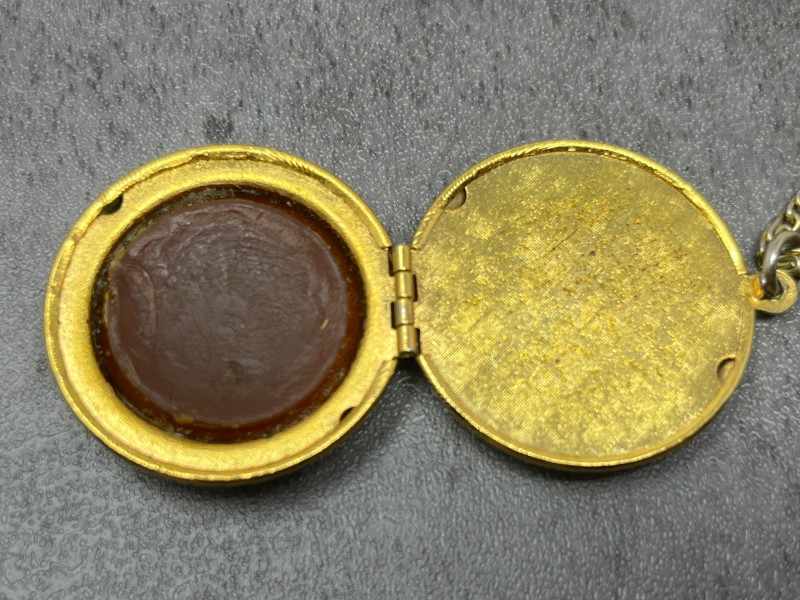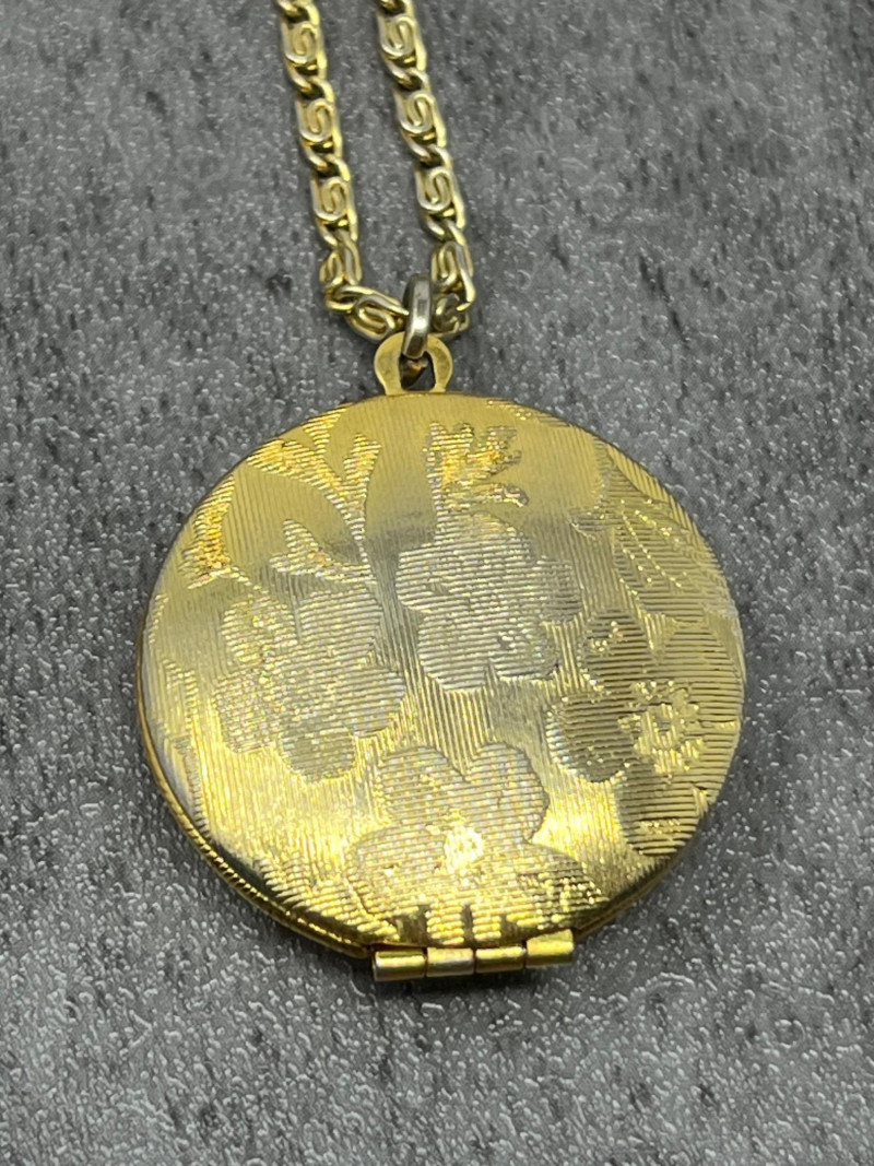 A charming vintage perfume locket featuring a round, gold‑tone case with an ornate engraved floral motif on the front. The locket opens smoothly to reveal its original interior perfume compartment, complete with the classic reddish-toned insert typical of mid‑century scent lockets. Designed to hold solid perfume or a scented pad, this piece blends function with decorative appeal. The exterior shows gentle, age‑appropriate wear consistent with vintage use, while the engraved detailing remains crisp and visually appealing. The attached chain is included and presents well, offering a ready‑to‑wear presentation for collectors or those who appreciate nostalgic jewelry with a practical twist. Features: Vintage gold‑tone perfume locket Engraved floral front design Original interior perfume compartment Includes matching chain Smooth hinge and secure closure Estate‑fresh condition with light, expected wear A lovely addition for collectors of vintage jewelry, scent lockets, or mid‑century accessories.