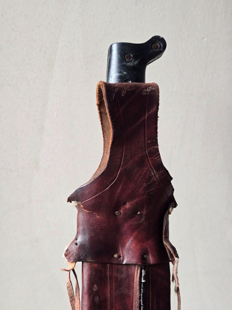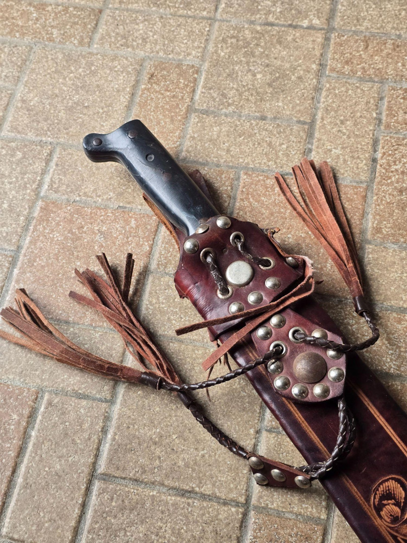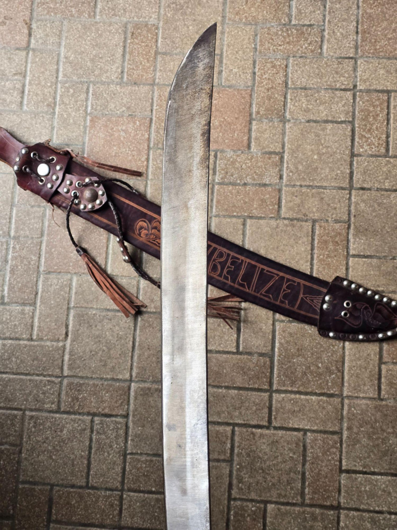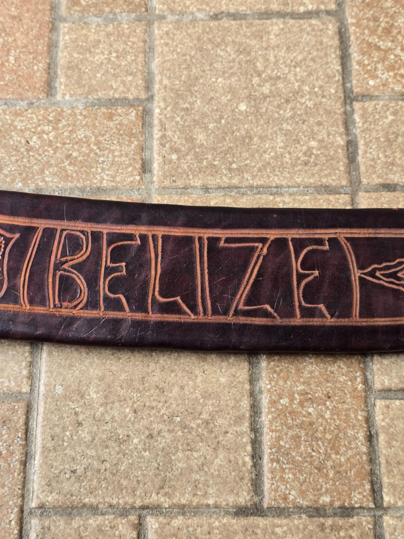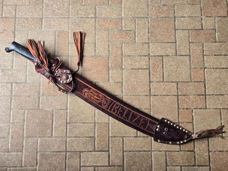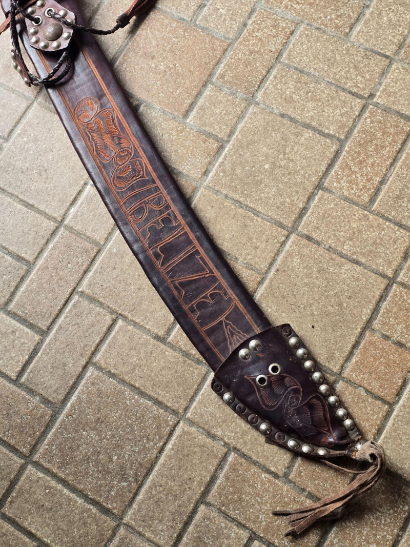 A vintage Belizean machete paired with its original hand‑tooled leather sheath. The sheath features decorative embossing, metal studs, tassel accents, and “BELIZE” prominently tooled into the leather. The machete fits securely inside and is included with the lot. Estate‑kept piece with traditional styling and rustic character—ideal for collectors of cultural artifacts, travel memorabilia, or vintage blades. Condition consistent with age and handling. Sheath shows expected wear to leather surfaces and hardware. Machete exhibits age‑appropriate patina.