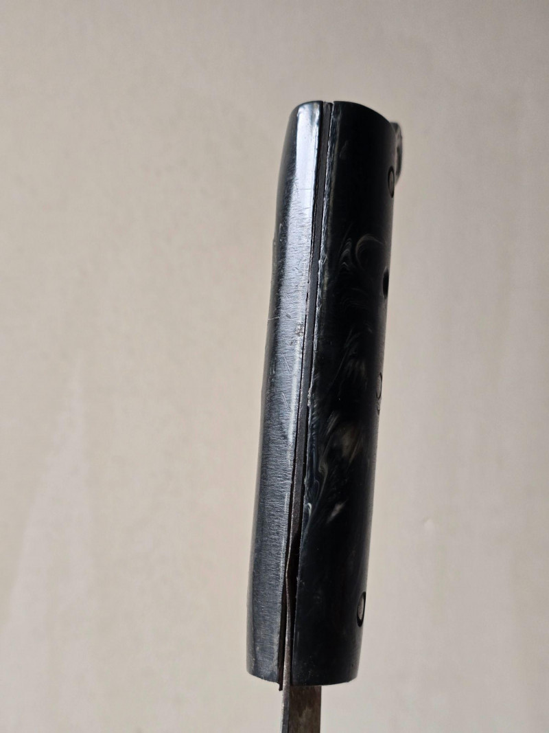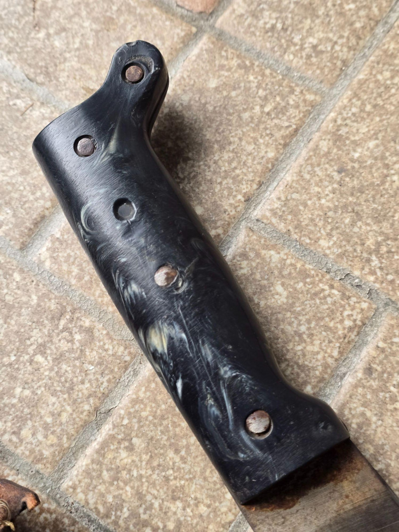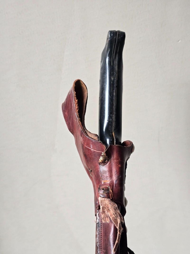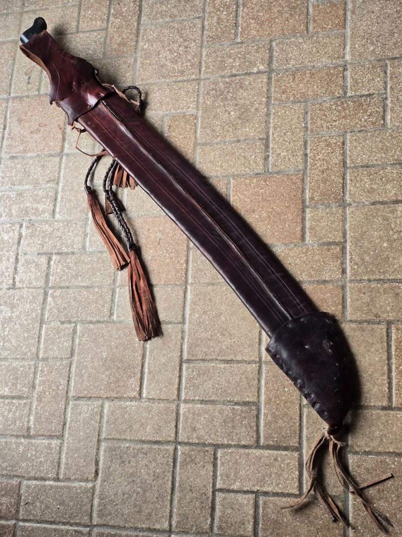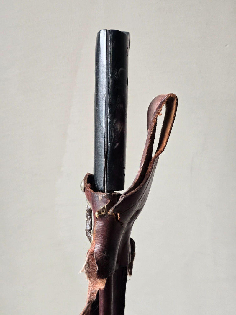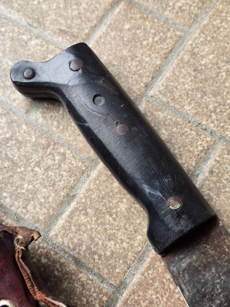 A vintage Belizean machete paired with its original hand‑tooled leather sheath. The sheath features decorative embossing, metal studs, tassel accents, and “BELIZE” prominently tooled into the leather. The machete fits securely inside and is included with the lot. Estate‑kept piece with traditional styling and rustic character—ideal for collectors of cultural artifacts, travel memorabilia, or vintage blades. Condition consistent with age and handling. Sheath shows expected wear to leather surfaces and hardware. Machete exhibits age‑appropriate patina.