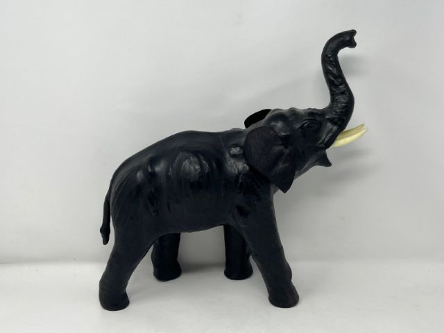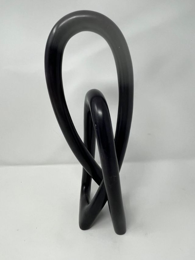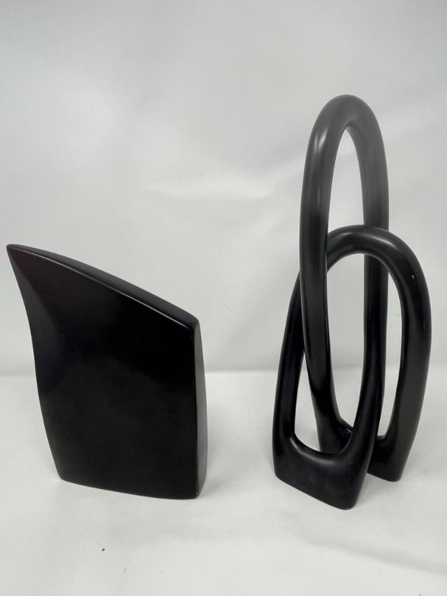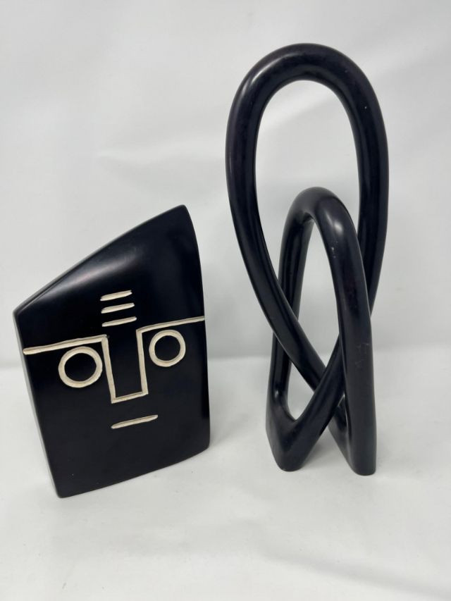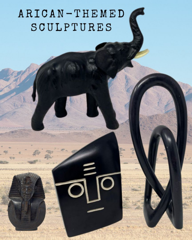 A grouped lot of four African‑themed sculptures in black or dark finishes, each with distinct stylistic character and varying origins. Forms include a stylized elephant, a modern abstract loop sculpture, a minimalist face sculpture, and a pharaoh‑style bust. The face sculpture retains a faded “Made in Kenya” sticker on the underside. The pharaoh sculpture bears a worn, illegible signature on one side. The elephant and modern abstract sculpture show no maker’s marks or country of origin. Sizes range approximately 7"–13" tall and 4"–13" wide. A visually cohesive decorative grouping suitable for display, staging, or collectors of African‑inspired art. Condition: