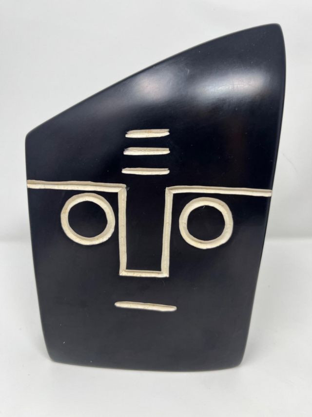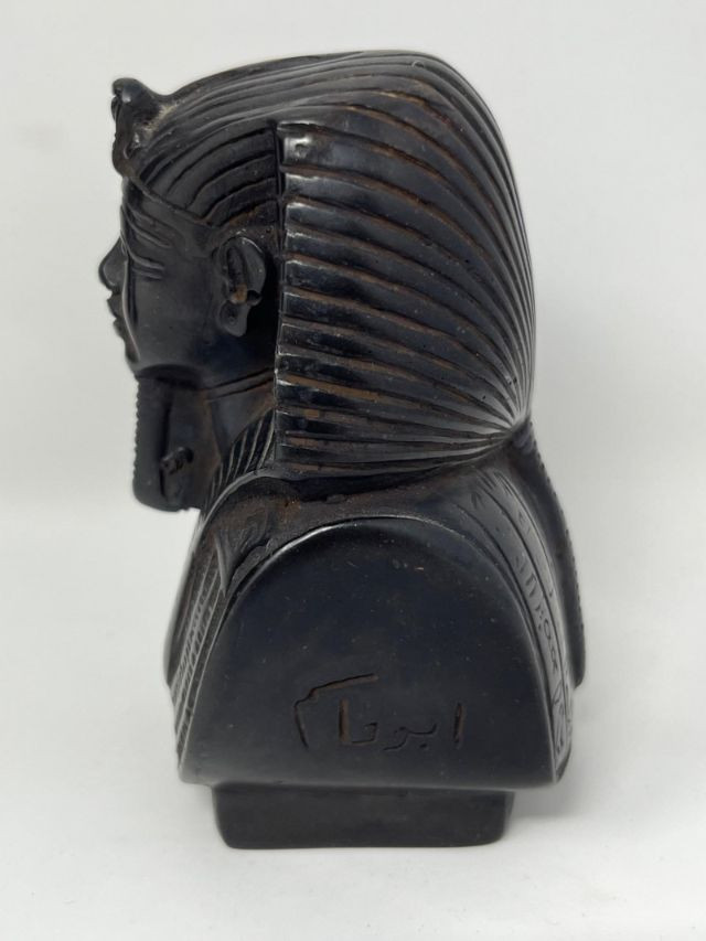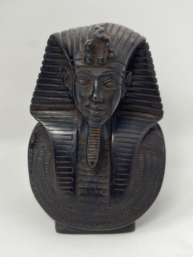General surface wear consistent with age and handling. Sticker on face sculpture is faded; signature on pharaoh sculpture is worn and not legible. No cracks or structural damage observed. Includes:
