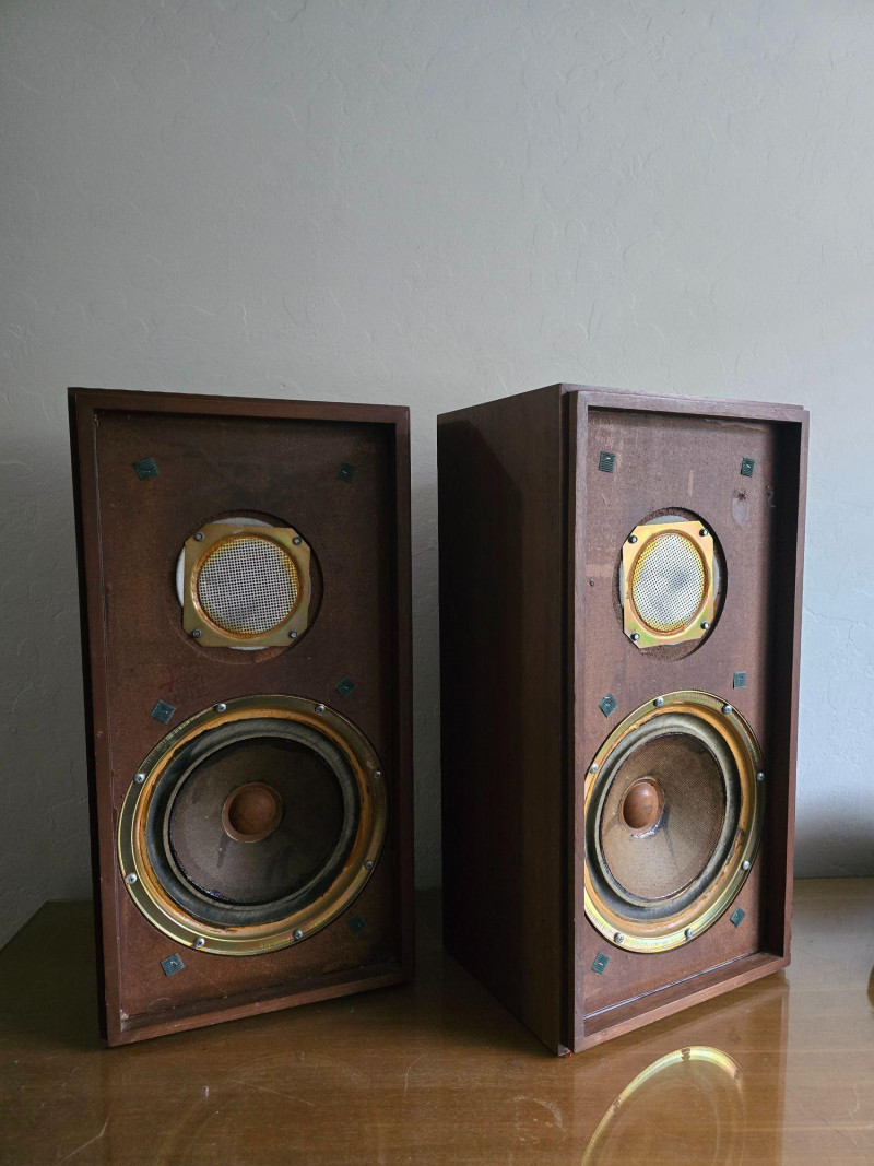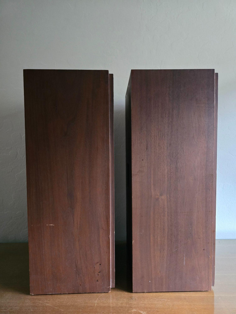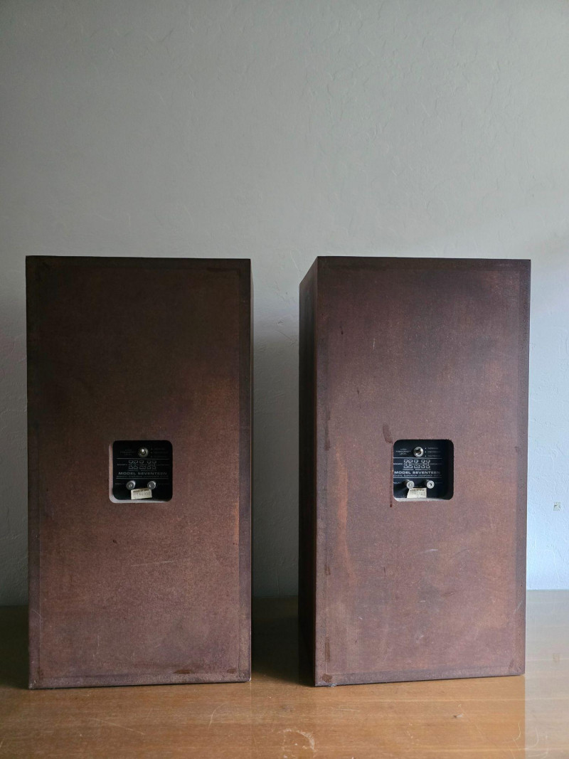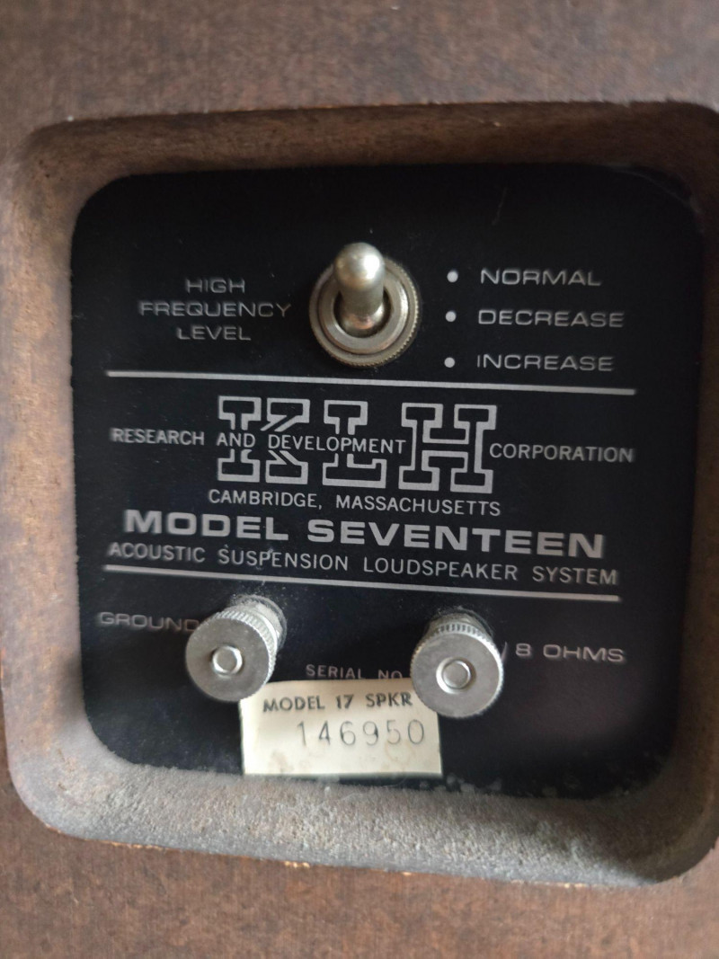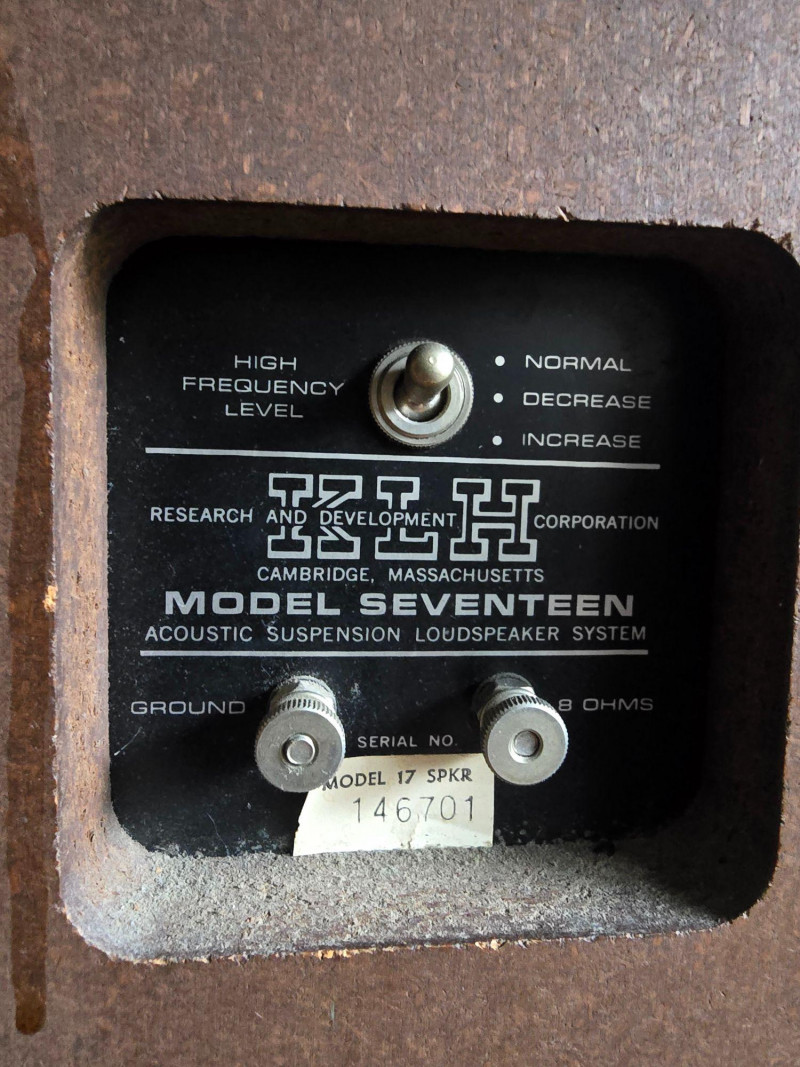Classic pair of KLH Model Seventeen acoustic‑suspension loudspeakers, produced by KLH Research & Development Corp. of Cambridge, Massachusetts. Designed in the late 1960s, the Model Seventeen is one of KLH’s most respected bookshelf speakers, known for its warm, balanced sound and efficient 8‑ohm performance. These units feature the original cloth grilles with KLH badges, rear connection panels with factory markings, and walnut veneer cabinets. The Model Seventeen was engineered as a two‑way sealed system using KLH’s well‑regarded acoustic‑suspension design, offering smooth midrange response and tight low‑frequency control. Cabinets are constructed with real wood veneer over solid, well‑braced enclosures. Both speakers retain their original KLH drivers and crossover network. Visible serial number on one unit: 173844. Historical Note: KLH was founded in 1957 by Henry Kloss, Malcolm Low, and Josef Hofmann—three influential figures in early American hi‑fi development. Throughout the 1960s, KLH became known for its innovative acoustic‑suspension loudspeakers, which helped define the sound of the era. The Model Seventeen was one of the company’s most successful designs, valued for its reliability, musicality, and approachable size, making it a staple in mid‑century home audio systems. Dimensions (each):12" L × 9" W × 23" H Condition: Cabinets show surface wear, scuffs, and finish loss consistent with age. Grille cloths intact. Rear panels and terminals present with clear factory labeling. Sold as-is and tested for functional audio performance.