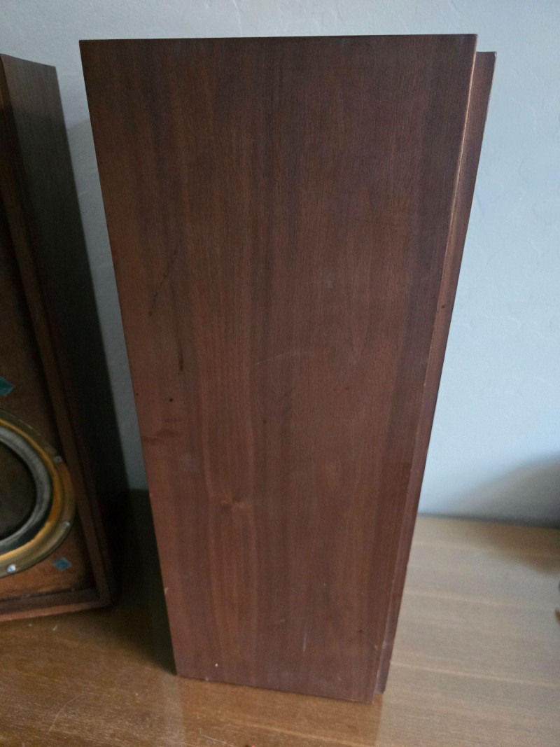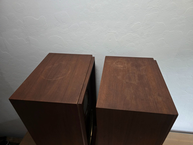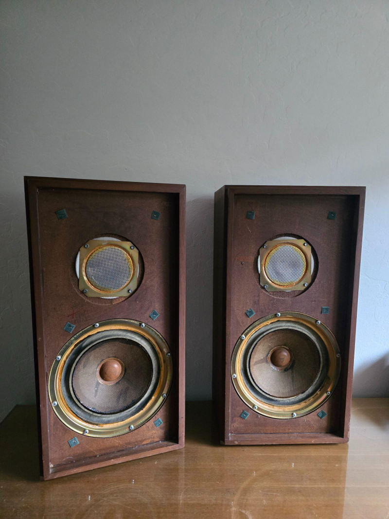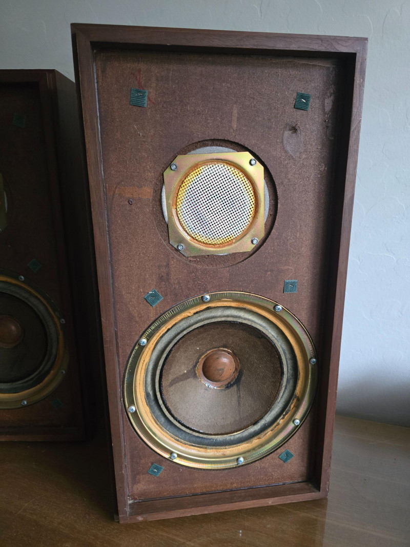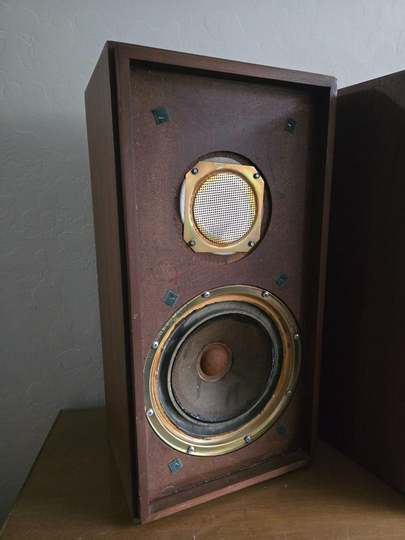 Classic pair of KLH Model Seventeen acoustic‑suspension loudspeakers, produced by KLH Research & Development Corp. of Cambridge, Massachusetts. Designed in the late 1960s, the Model Seventeen is one of KLH’s most respected bookshelf speakers, known for its warm, balanced sound and efficient 8‑ohm performance. These units feature the original cloth grilles with KLH badges, rear connection panels with factory markings, and walnut veneer cabinets. The Model Seventeen was engineered as a two‑way sealed system using KLH’s well‑regarded acoustic‑suspension design, offering smooth midrange response and tight low‑frequency control. Cabinets are constructed with real wood veneer over solid, well‑braced enclosures. Both speakers retain their original KLH drivers and crossover network. Visible serial number on one unit: 173844. Historical Note: KLH was founded in 1957 by Henry Kloss, Malcolm Low, and Josef Hofmann—three influential figures in early American hi‑fi development. Throughout the 1960s, KLH became known for its innovative acoustic‑suspension loudspeakers, which helped define the sound of the era. The Model Seventeen was one of the company’s most successful designs, valued for its reliability, musicality, and approachable size, making it a staple in mid‑century home audio systems. Dimensions (each):12" L × 9" W × 23" H Condition: Cabinets show surface wear, scuffs, and finish loss consistent with age. Grille cloths intact. Rear panels and terminals present with clear factory labeling. Sold as-is and tested for functional audio performance.