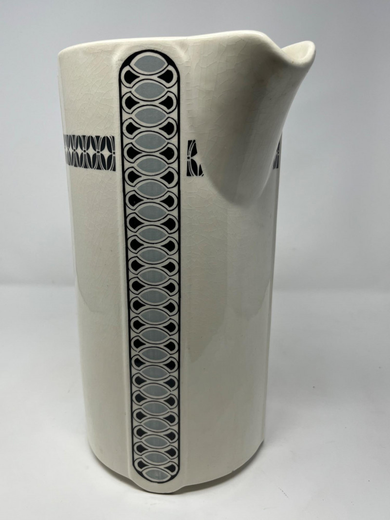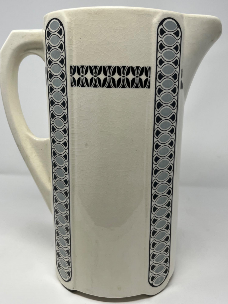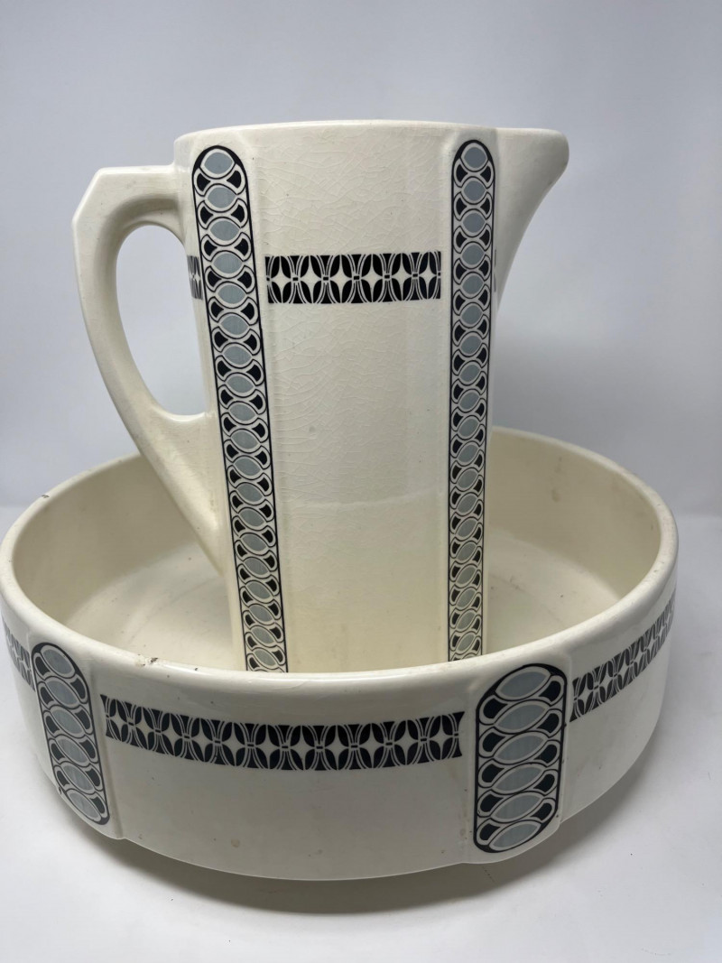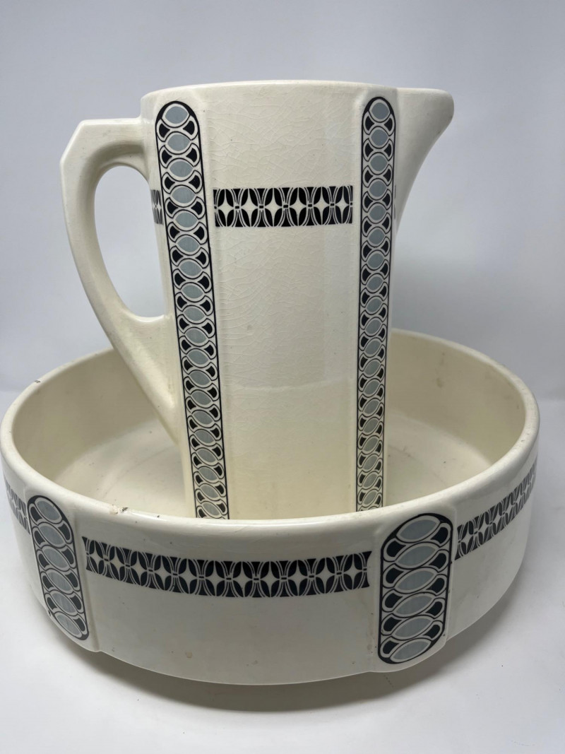 Antique ceramic pitcher and wash bowl set dating to the early 20th century, displaying strong Art Deco‑era influence in its vertical black and gray geometric banding. The cream‑glazed body, stepped motif, and linear decoration reflect the streamlined aesthetic popular from the 1920s into the 1930s. The pitcher features a classic curved handle and shaped spout, paired with a wide matching bowl in the same coordinated pattern. Underside of pitcher marked “CLAY” with impressed production number 1158, along with a faint secondary impressed mark—typical of small‑batch or regional ceramic houses of the period. A striking example of early Deco‑period utilitarian ceramics, offering both decorative appeal and historical character. Condition:
