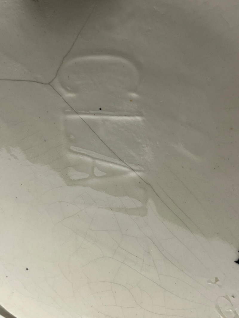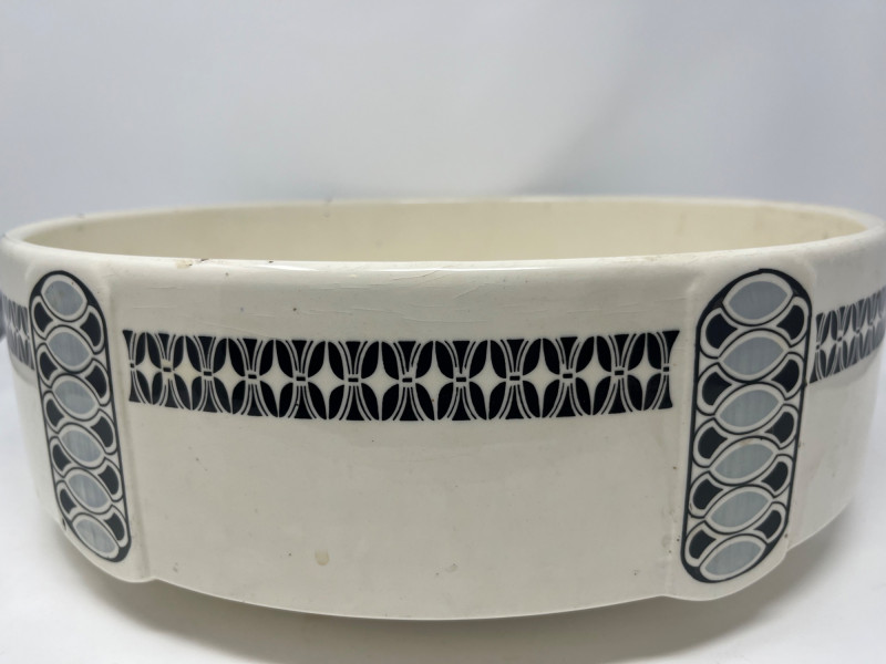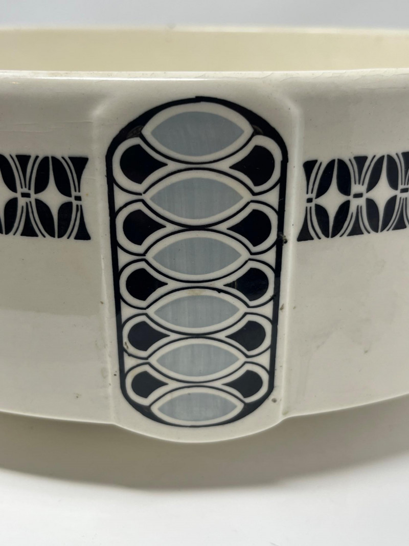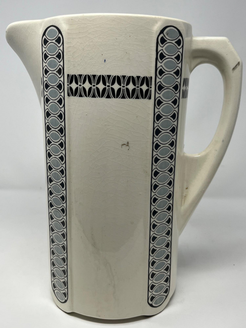Antique ceramic pitcher and wash bowl set dating to the early 20th century, displaying strong Art Deco‑era influence in its vertical black and gray geometric banding. The cream‑glazed body, stepped motif, and linear decoration reflect the streamlined aesthetic popular from the 1920s into the 1930s. The pitcher features a classic curved handle and shaped spout, paired with a wide matching bowl in the same coordinated pattern. Underside of pitcher marked “CLAY” with impressed production number 1158, along with a faint secondary impressed mark—typical of small‑batch or regional ceramic houses of the period. A striking example of early Deco‑period utilitarian ceramics, offering both decorative appeal and historical character. Condition: