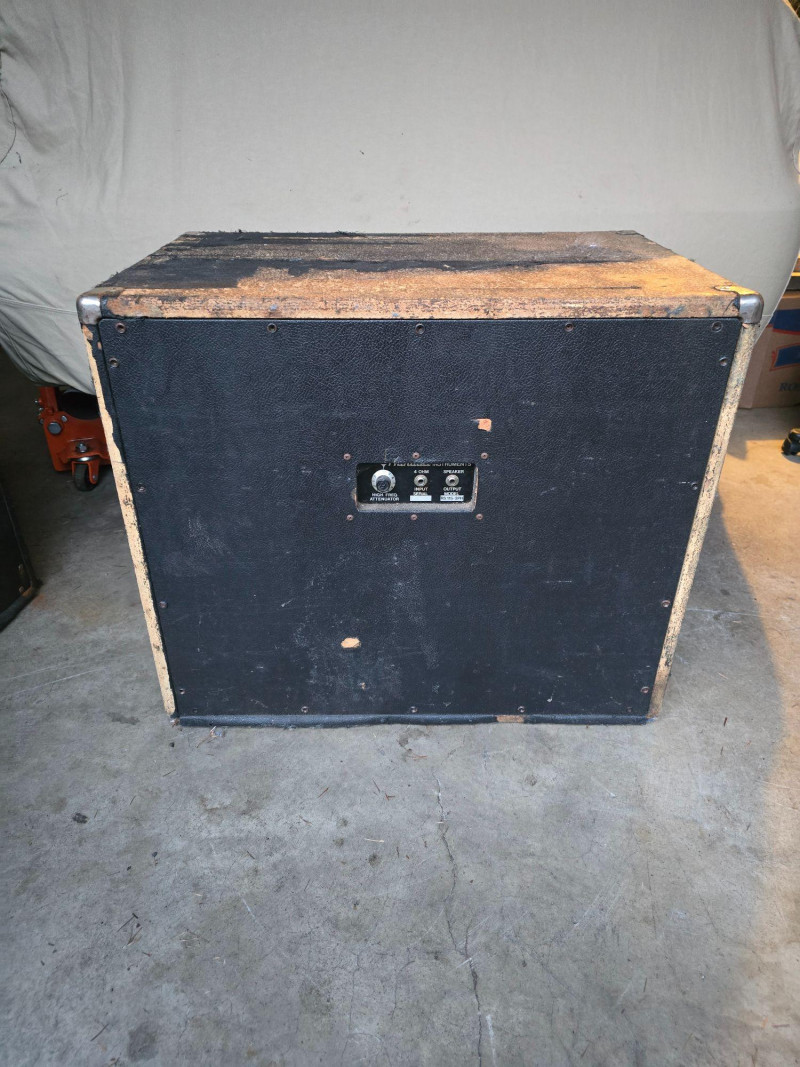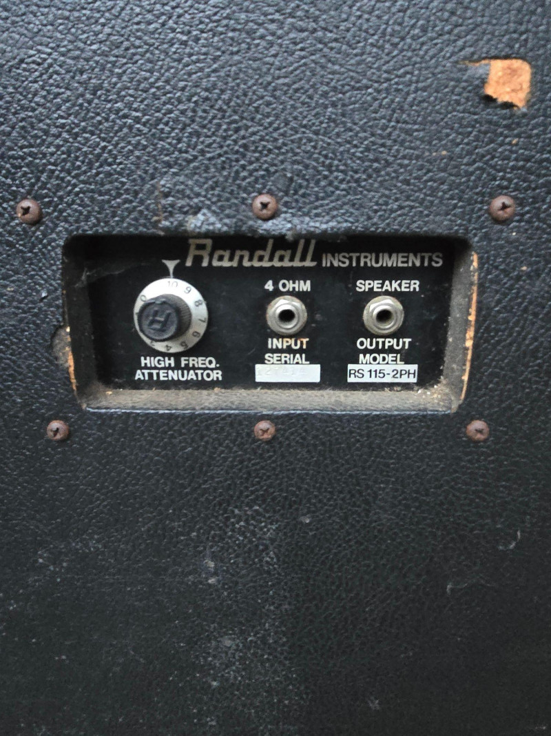 Randall RS115‑2PH speaker cabinet, a rugged 1×15 front‑ported enclosure suitable for bass guitar, PA reinforcement, or use as a donor cabinet for parts. This unit has been tested and is functional. Much of the original tolex has been stripped, leaving the wood exposed in several areas; exterior wear, scuffs, and edge wear are present throughout. The cabinet includes a 15" driver, rear high‑frequency attenuator, and serial input/output options. Interior wiring, driver, and components are photographed for transparency. Details & Notes: Model: RS115‑2PH Impedance: 4 Ohm Tested and functional Works well as PA, bass cabinet, or parts unit Front‑ported design Rear panel with Input, Serial Output, and High‑Freq Attenuator 15" speaker driver installed (manufacturer code visible in photos) Internal wiring, jack plate, and components shown in gallery Metal side handles Most of the tolex has been stripped; exterior shows significant wear from age and use