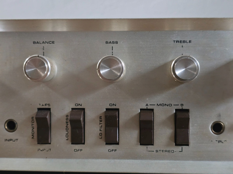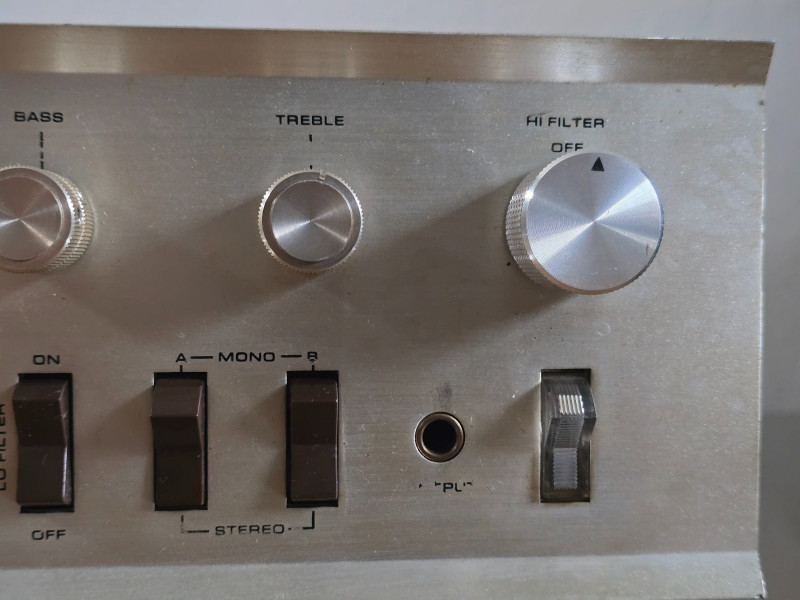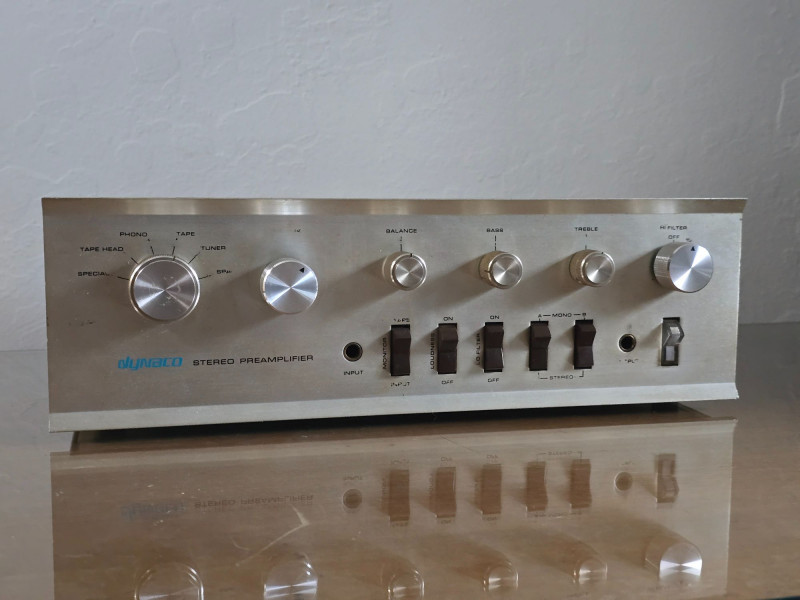 Country of Manufacture: USA Features & Specifications: Solid‑state stereo preamplifier design Front‑panel controls: Bass, Treble, Volume, Balance, Loudness, Filters, Tape Monitor Input selector for Phono, Tuner, Aux, and Tape Rear‑panel RCA connections: Phono, Tuner, Aux, Tape In/Out, Left/Right Outputs Switched and unswitched AC convenience outlets (200W max each) 120V AC, 50/60 Hz Classic Dynaco brushed‑aluminum faceplate with rotary controls Designed for clean, low‑distortion signal handling Condition Notes: Used, tested, and functional Exterior shows normal vintage wear No further testing performed Sold as found Stereo 120 amplifier is not included A solid example of Dynaco’s popular PAT‑4 preamplifier, suitable for collectors, restorers, and vintage audio enthusiasts.