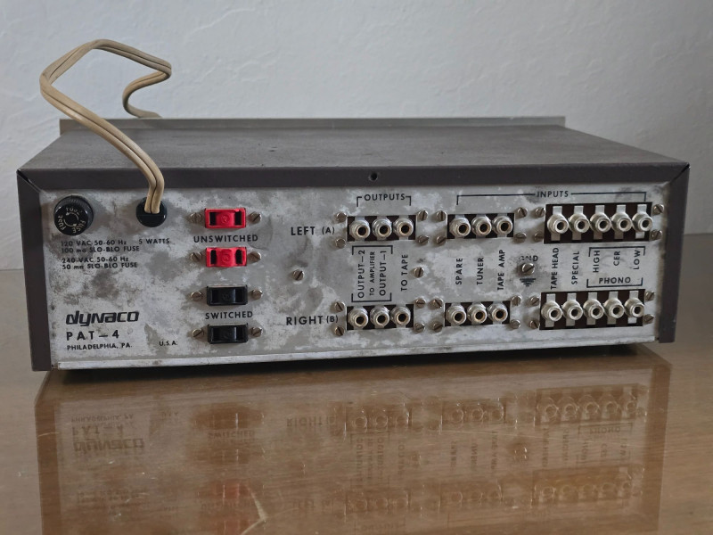 Vintage Dynaco PAT‑4 solid‑state stereo preamplifier. Clean, well‑preserved example with expected cosmetic wear from age and use. All front‑panel controls and rear‑panel inputs/outputs are present. Known for its low‑noise circuitry, straightforward signal path, and compatibility with a wide range of power amplifiers of the era. Does not include amplifier unit. Model: Dynaco PAT‑4