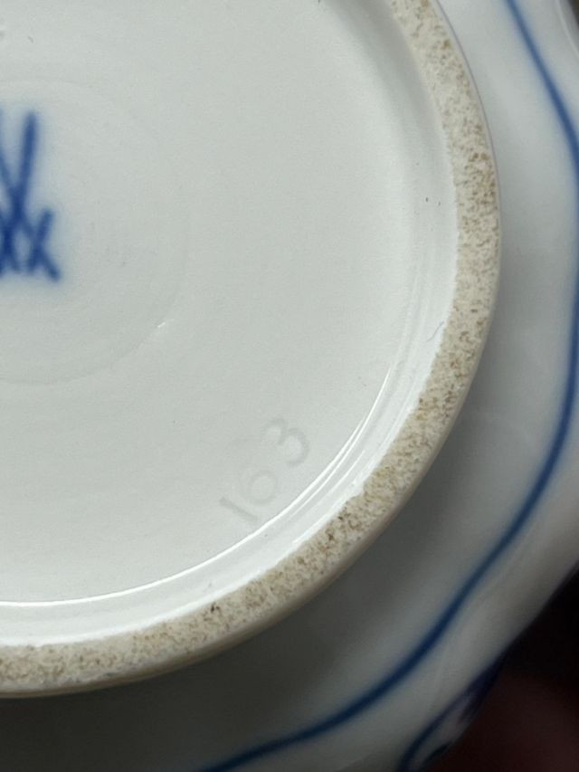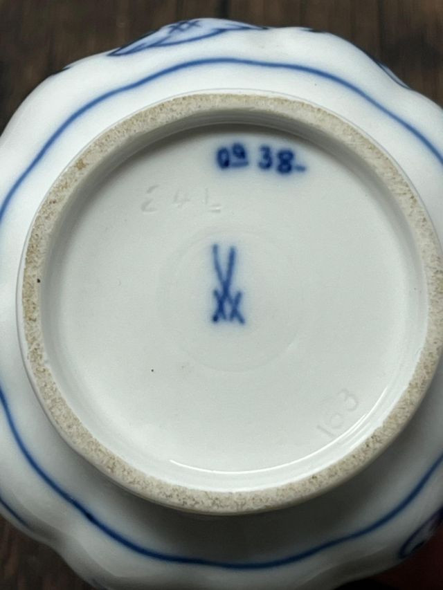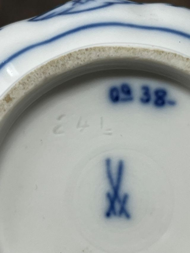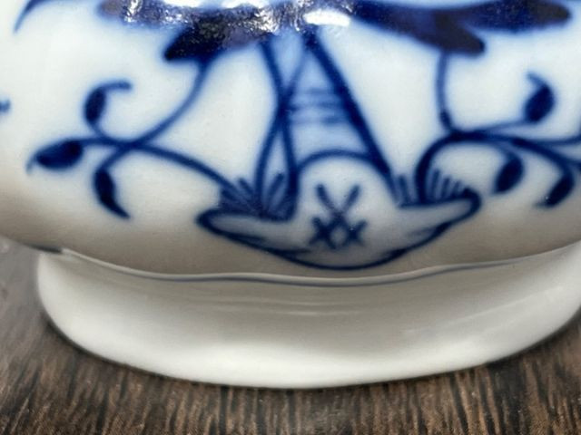 A finely crafted Meissen porcelain creamer featuring blue‑and‑white floral decoration, shaped with a scalloped rim, a graceful curved handle, and a rounded body typical of Meissen’s refined tableware forms. The cobalt work is clean and well‑executed, reflecting the hand‑painted tradition associated with Meissen’s long history of porcelain production. The piece carries the Meissen crossed‑swords mark on the exterior and again on the underside, accompanied by impressed and painted numbers that support authenticity and help place it within Meissen’s 19th–20th century output. Authentic Meissen porcelain creamer pitcher Blue‑and‑white floral decoration Scalloped rim and elegant handle Crossed‑swords marks visible on body and underside Impressed and painted production numbers present Estate‑fresh example from a long‑held local collection No chips, cracks, or repairs observed Light surface wear consistent with age and display Markings remain clear and legible The crossed‑swords mark is one of the oldest and most recognized porcelain marks in Europe. Creamers with strong cobalt decoration and classic Meissen shaping remain desirable for collectors of early European porcelain and blue‑and‑white tableware.Features & Details