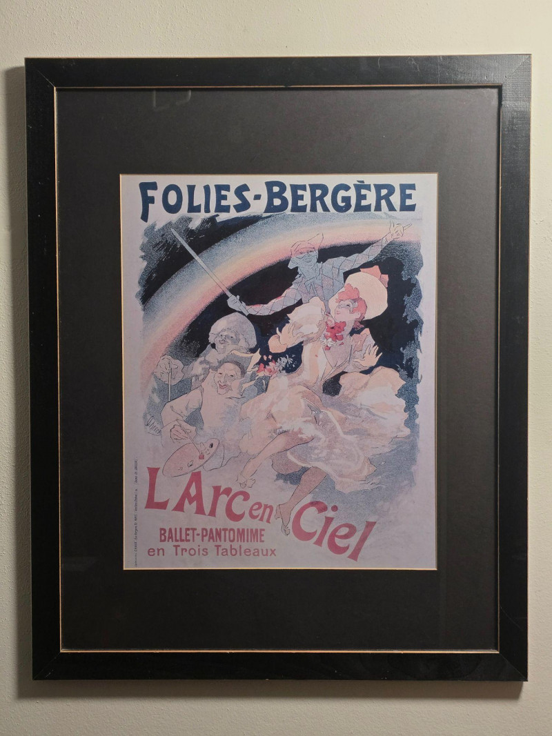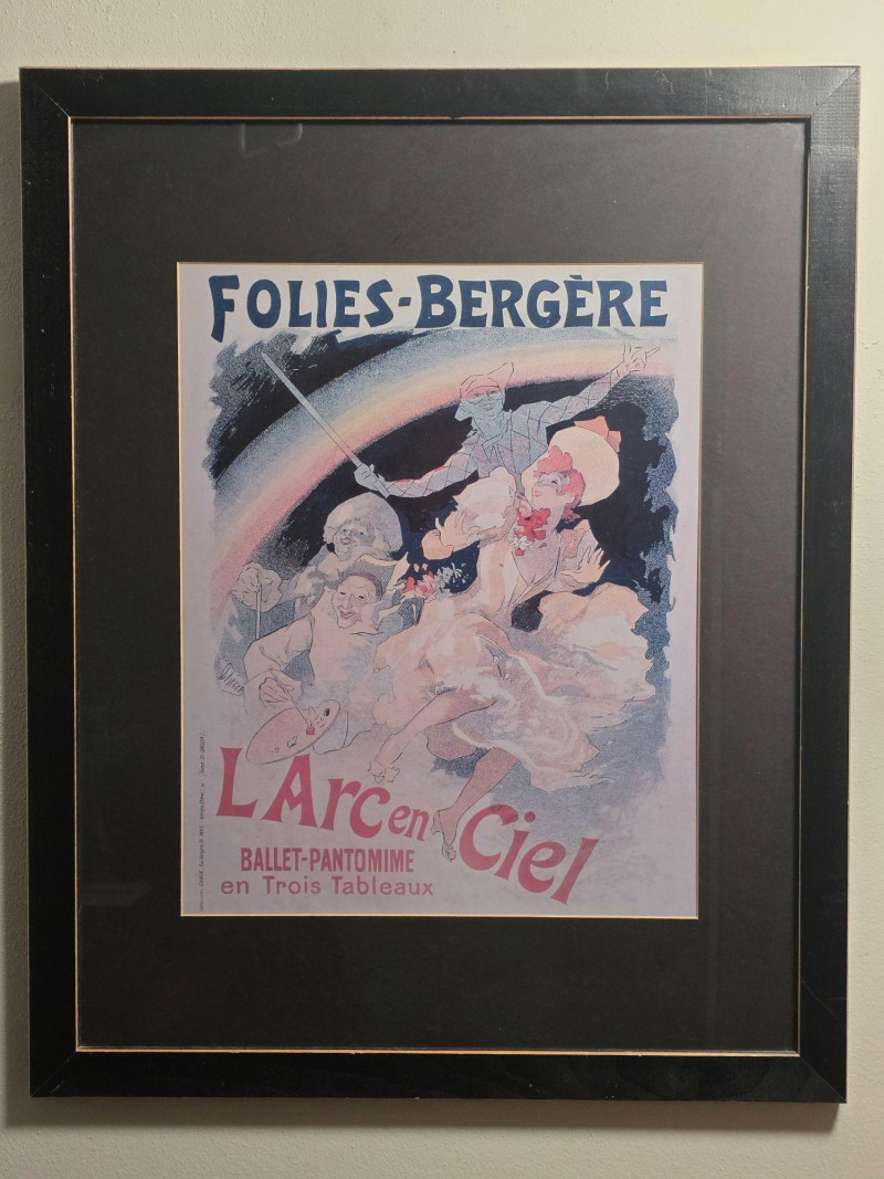 Framed reproduction print of the classic Folies‑Bergère – L’Arc en Ciel ballet‑pantomime poster, featuring bold period‑style typography and theatrical imagery. The print displays the full title block clearly: “FOLIES‑BERGÈRE – L’Arc en Ciel – Ballet‑Pantomime en Trois Tableaux.” Colors appear strong and well‑defined, with no visible fading in the photographed examples. The piece is presented behind glass in a simple contemporary frame. The frame shows light wear along the edges, consistent with normal handling and display, but remains structurally sound and visually presentable. A striking decorative piece for collectors of French theatre ephemera, vintage poster art, or Parisian cabaret imagery. DETAILS: