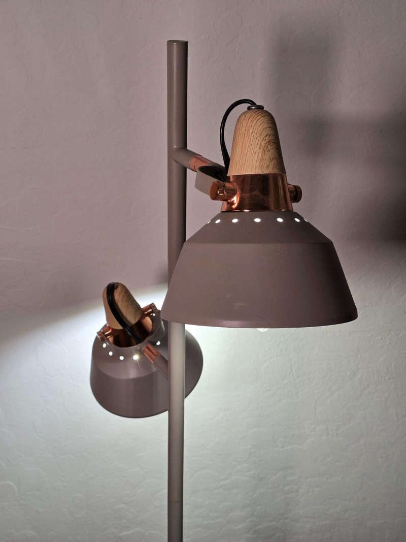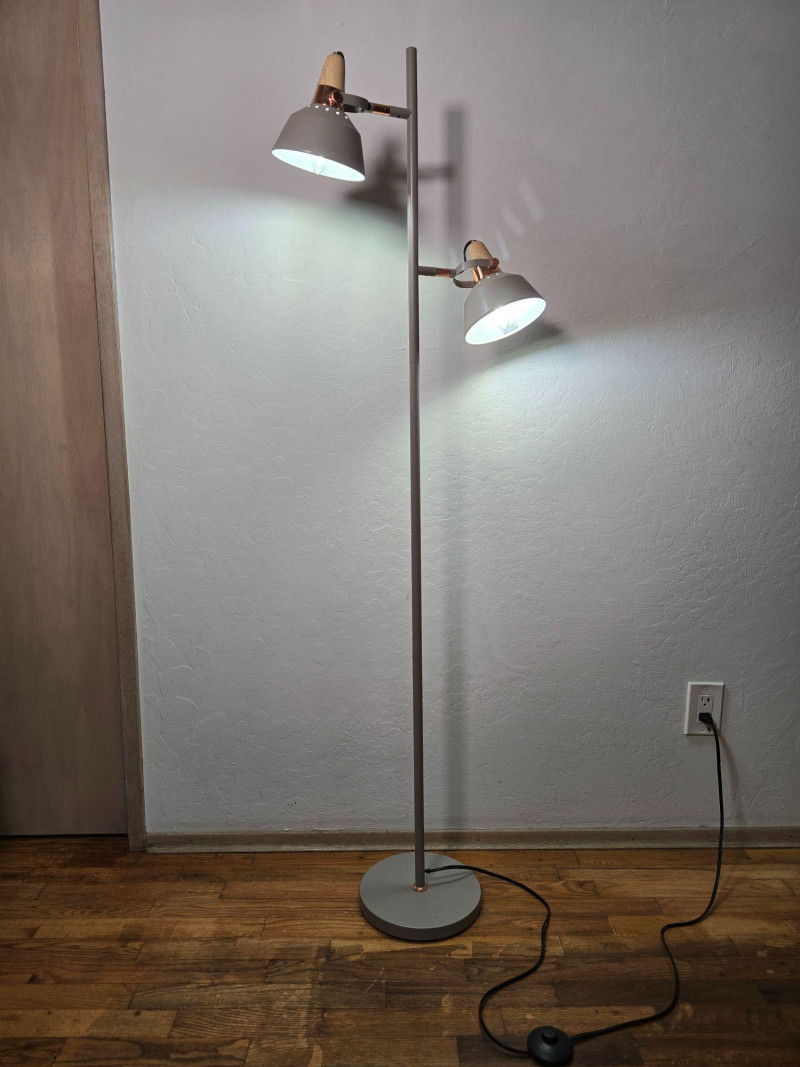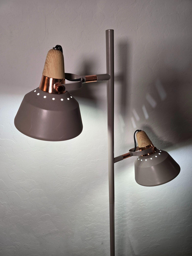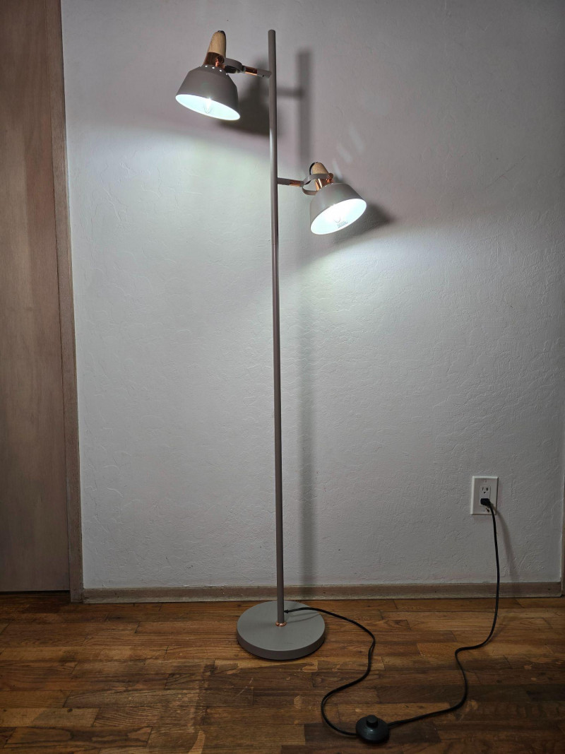 Modern floor lamp featuring two independently adjustable light heads with warm wood accent collars and a brushed metal finish. Slim vertical column with round weighted base. Each light pivots and tilts for directional illumination. Inline cord switch. This lamp shows typical surface wear from use, including light scuffs and finish marks. Tested and working at time of cataloging. Please review all photos for condition and details. NOTES