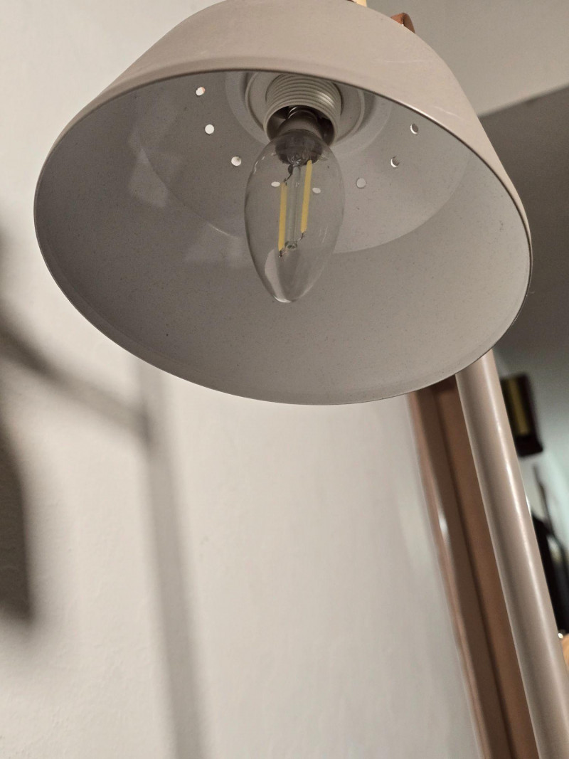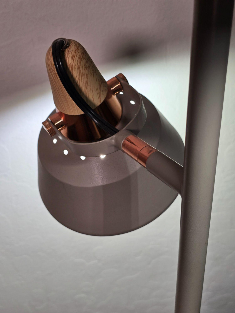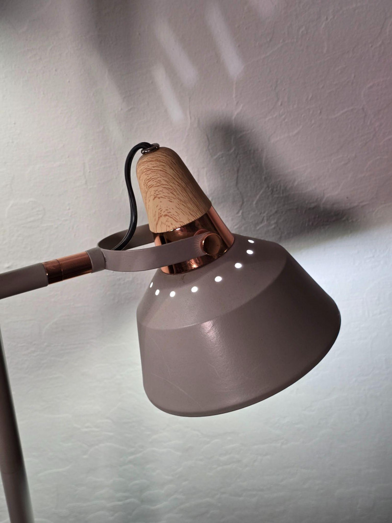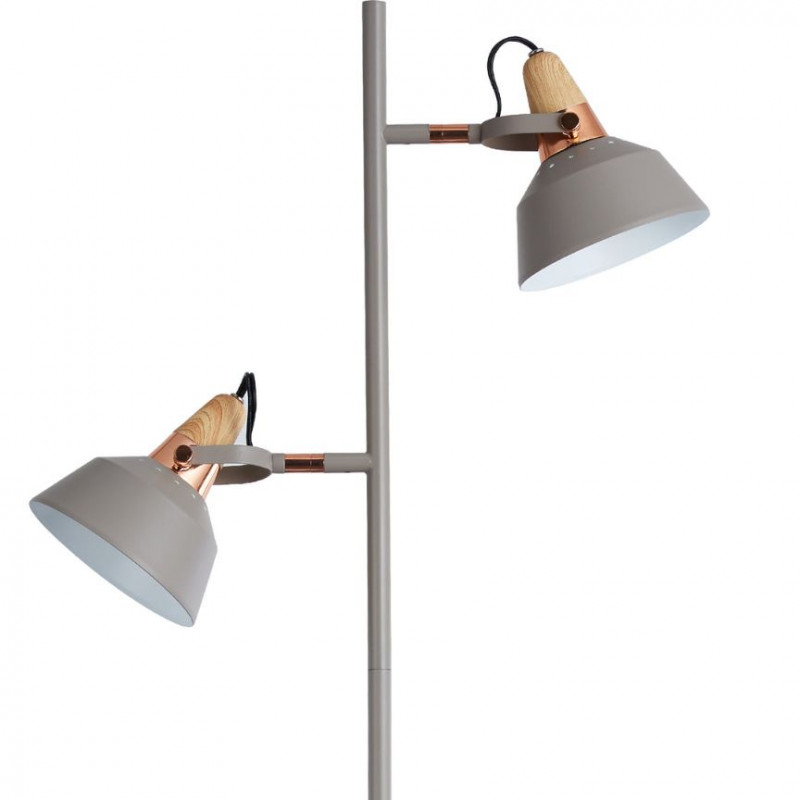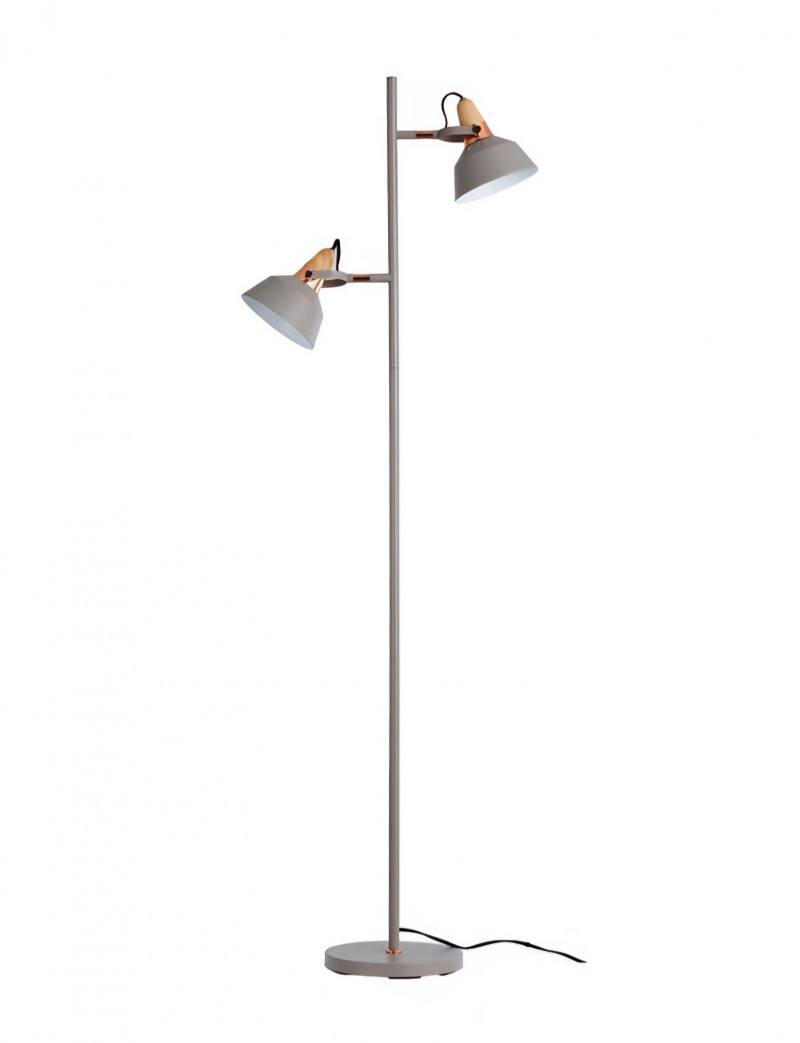 Modern floor lamp featuring two independently adjustable light heads with warm wood accent collars and a brushed metal finish. Slim vertical column with round weighted base. Each light pivots and tilts for directional illumination. Inline cord switch. This lamp shows typical surface wear from use, including light scuffs and finish marks. Tested and working at time of cataloging. Please review all photos for condition and details. NOTES