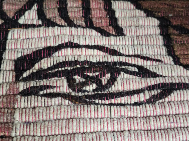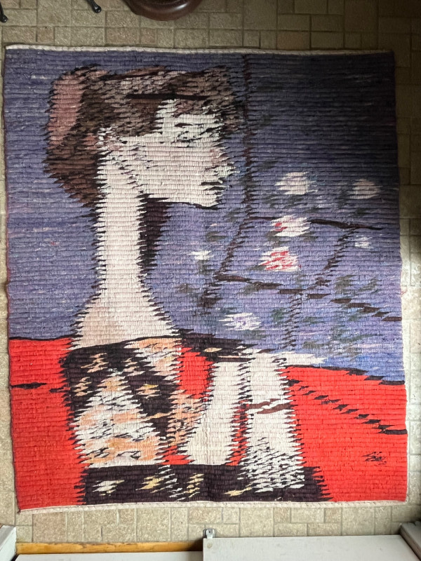 Striking hand‑woven Peruvian wool textile depicting Pablo Picasso’s Jacqueline With Flowers. Created in the tradition of artisan workshop weavings that translated modernist artworks into richly textured wool tapestries, this piece captures the bold geometry, stylized portraiture, and saturated palette associated with both Picasso’s original composition and Peruvian textile craftsmanship. Acquired from the Julie Ann Gallery in Gearhart, Oregon in the 1980s, the work remains vibrant and structurally sound. The lower corner of the weaving includes what may be the maker’s initials, though the exact artist is unknown. Details & Notes