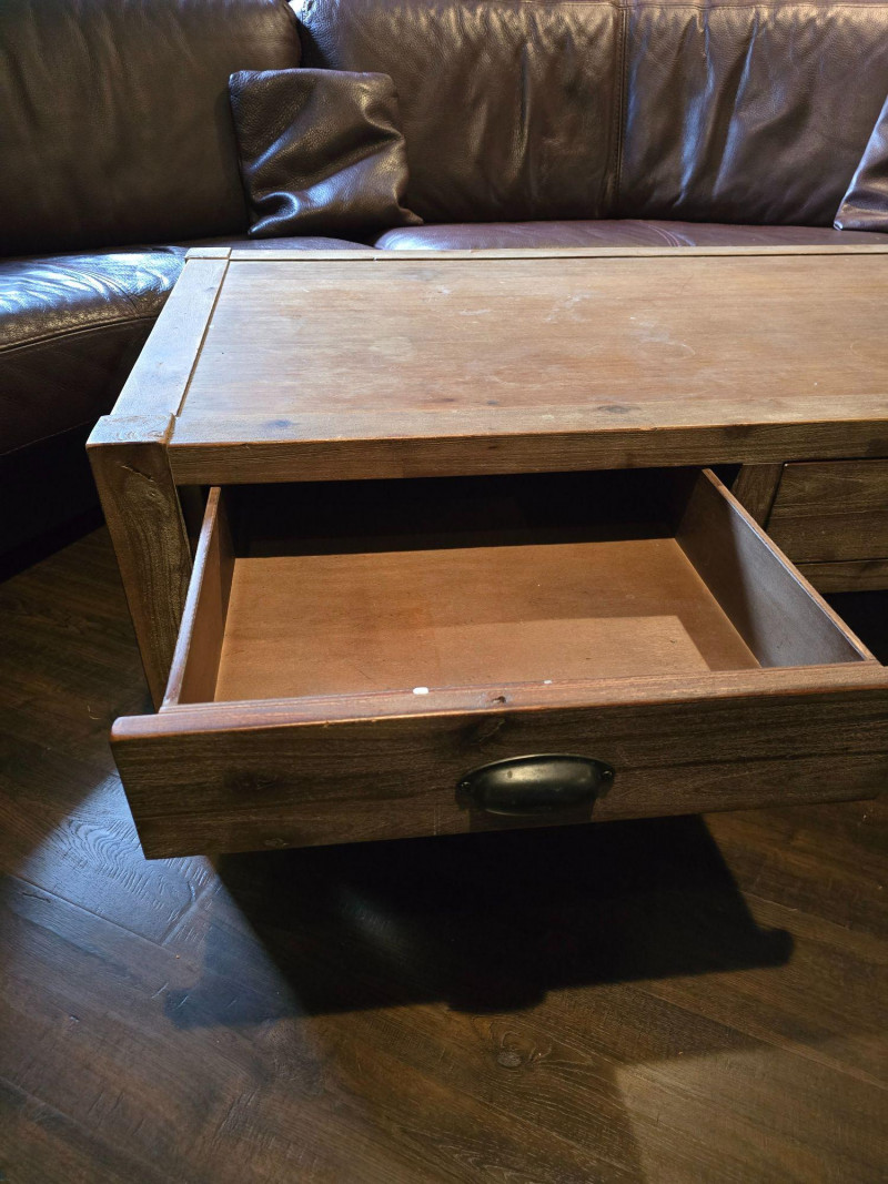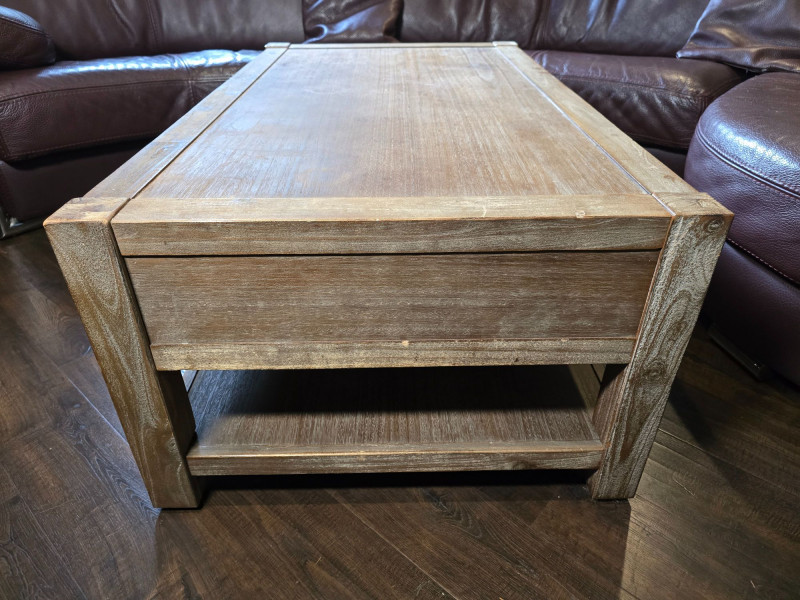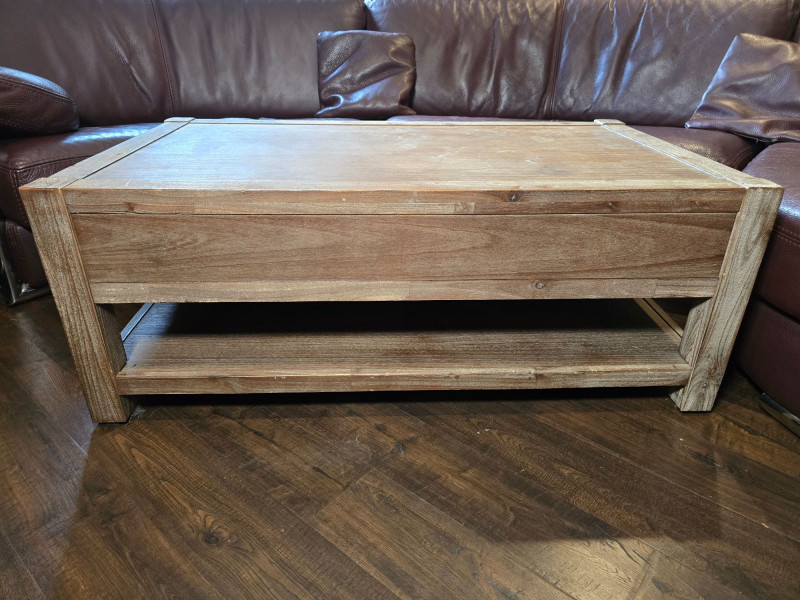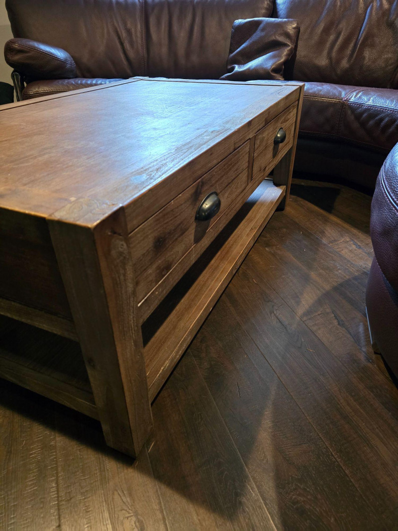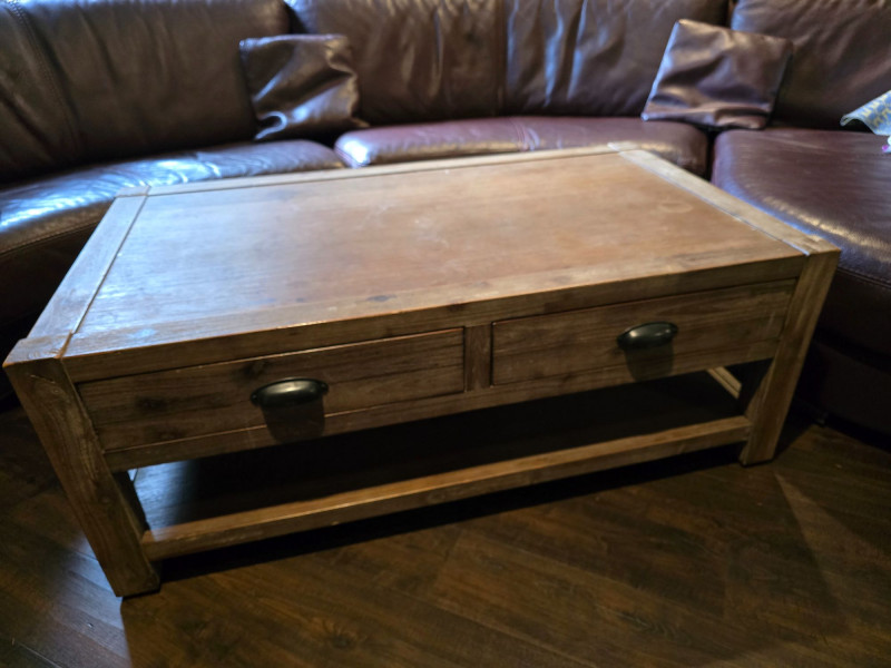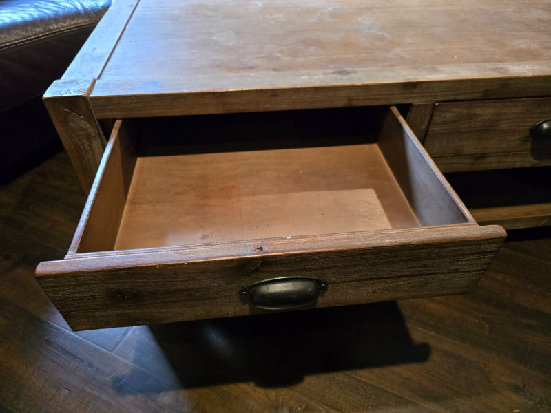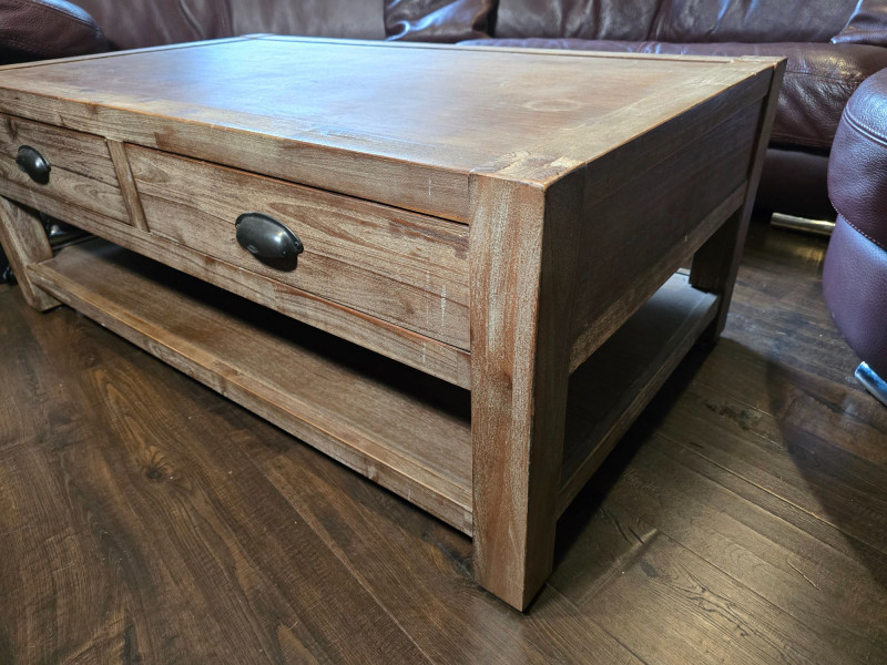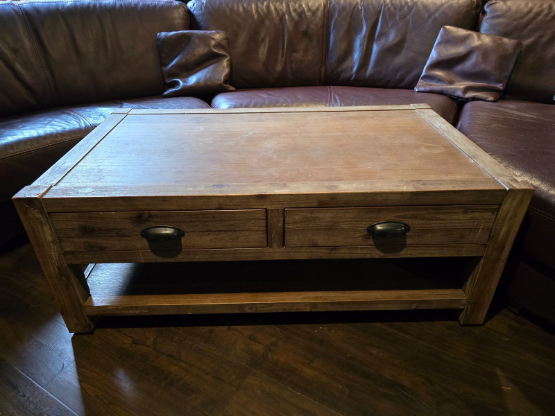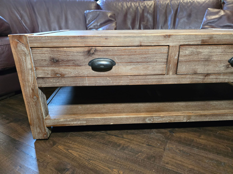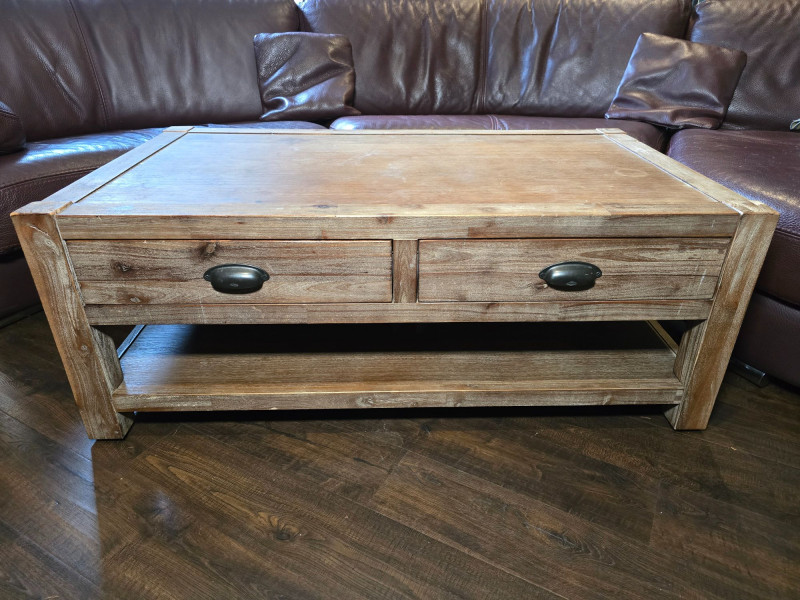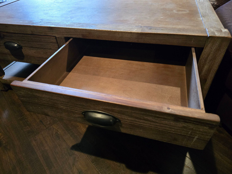 Well‑made solid wood coffee table featuring two front drawers with metal pulls and a full lower shelf for added storage. Warm, rustic finish with visible grain and sturdy construction. Ideal for living rooms, dens, or cabin‑style interiors. Drawers open and close smoothly. Surface shows light wear consistent with normal household use. A functional, attractive piece with classic lines and practical storage. CONDITION: