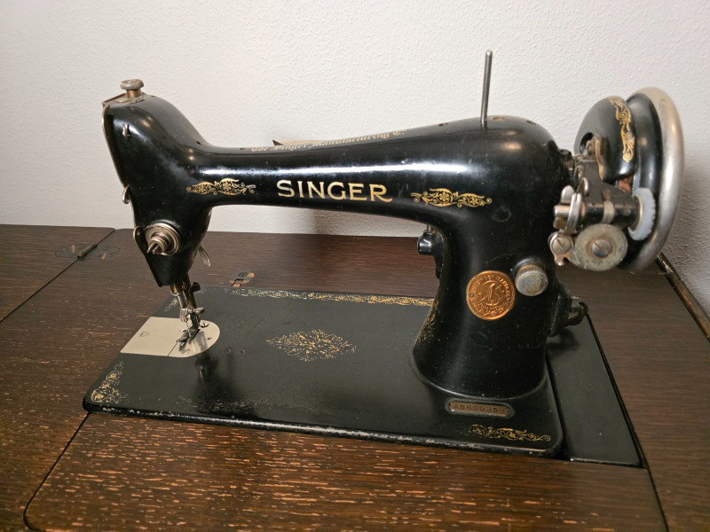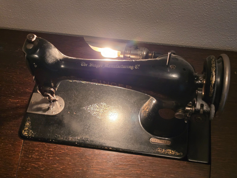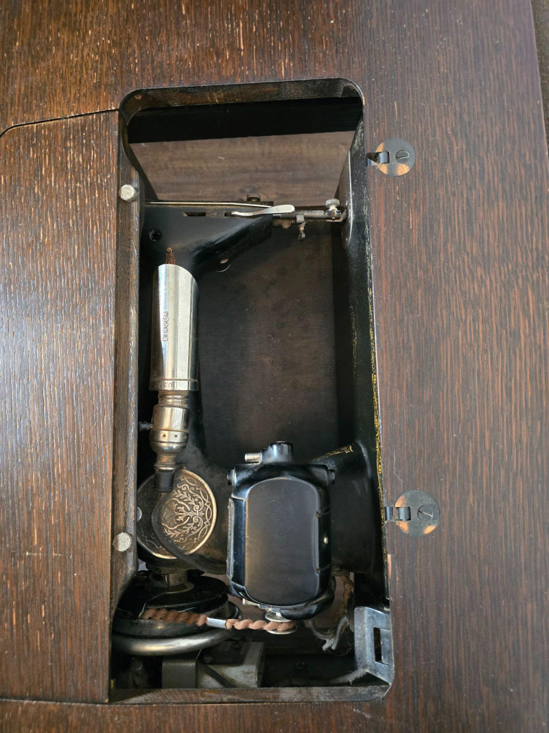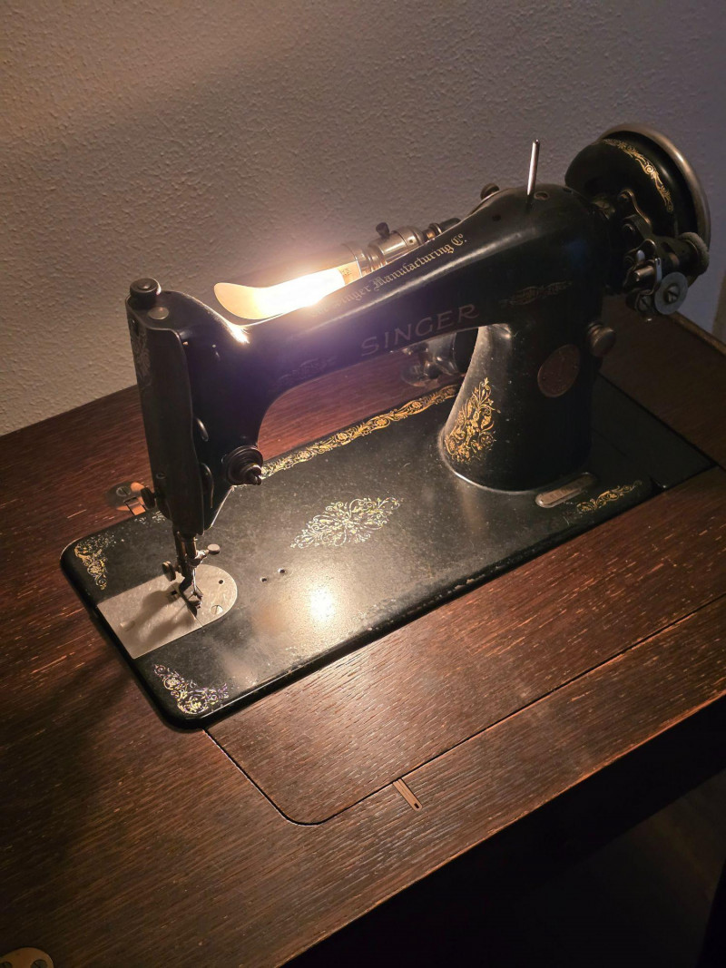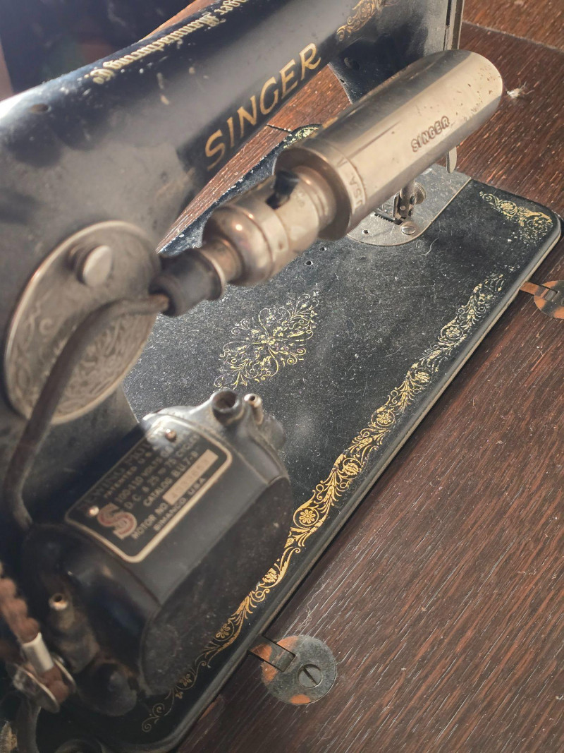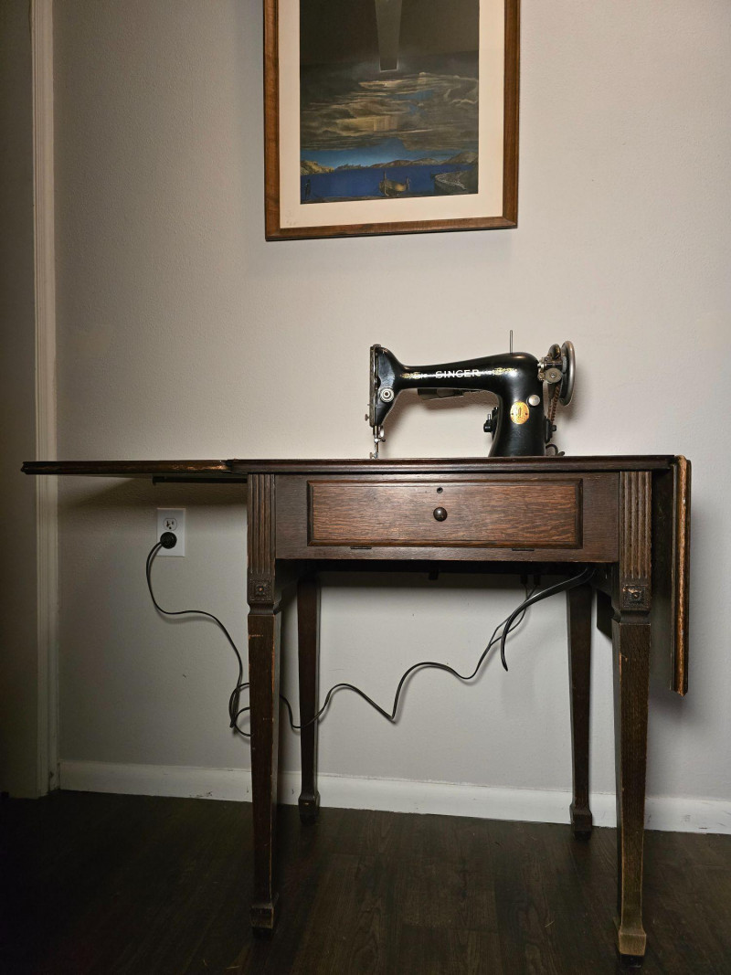 Singer Model 66, manufactured in 1927, offered here with its original wooden sewing table and period electric motor assembly. This example retains its classic black finish with gold decal work, emblem, and matching hardware—hallmarks sought after by collectors of early electric Singer machines. The motor and built‑in light both power on, confirming the integrity of the electrical components; the machine will require a new belt before use. The cabinet includes the original fold‑away compartment and single drawer, with wear consistent with age and long‑term household use. A solid, largely intact Model 66 pairing, well‑suited for collectors, restorers, or those preserving early 20th‑century Singer craftsmanship.
