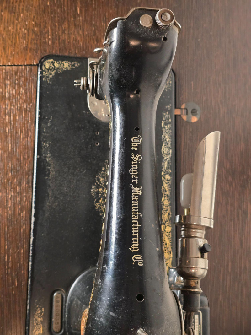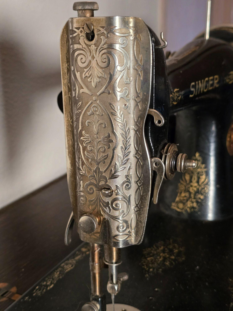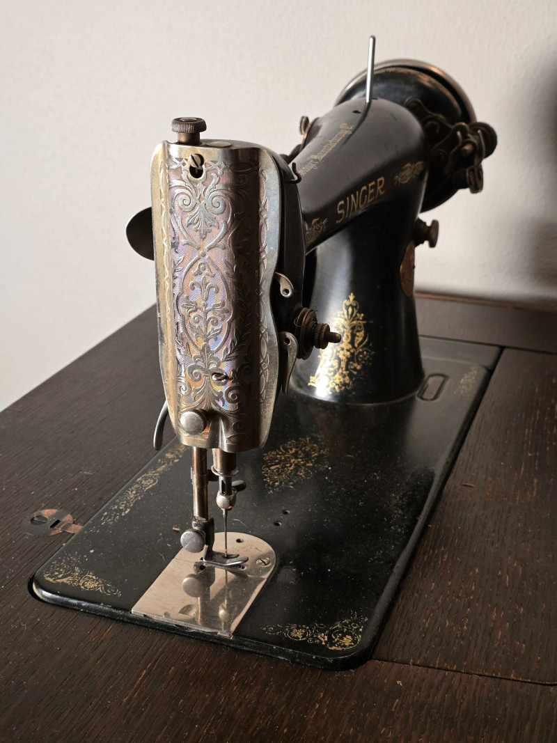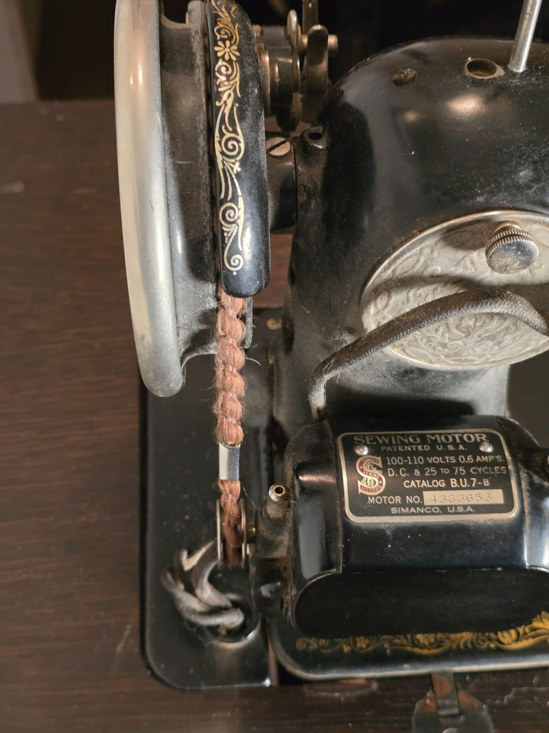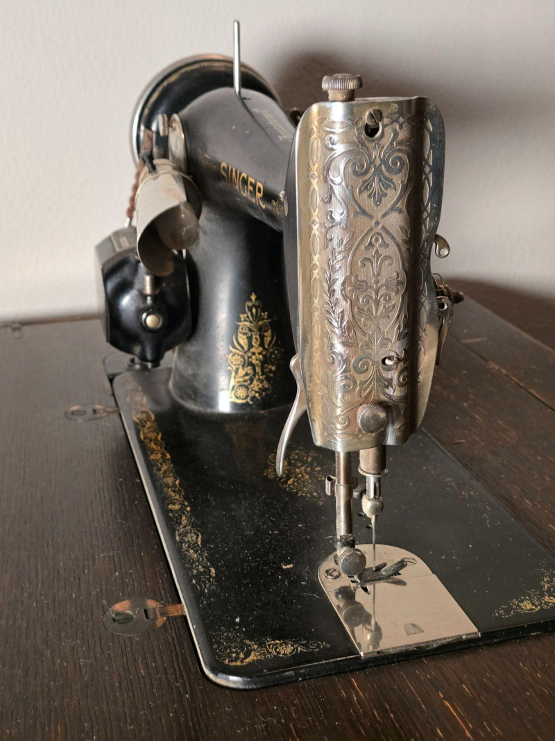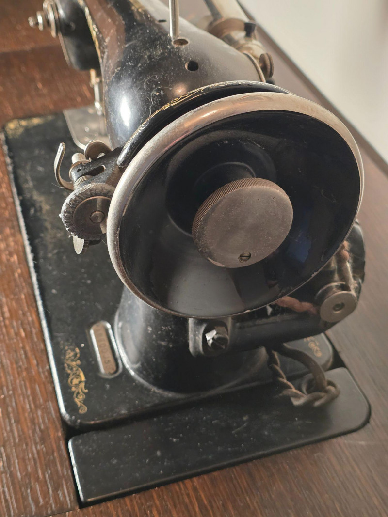 Singer Model 66, manufactured in 1927, offered here with its original wooden sewing table and period electric motor assembly. This example retains its classic black finish with gold decal work, emblem, and matching hardware—hallmarks sought after by collectors of early electric Singer machines. The motor and built‑in light both power on, confirming the integrity of the electrical components; the machine will require a new belt before use. The cabinet includes the original fold‑away compartment and single drawer, with wear consistent with age and long‑term household use. A solid, largely intact Model 66 pairing, well‑suited for collectors, restorers, or those preserving early 20th‑century Singer craftsmanship.