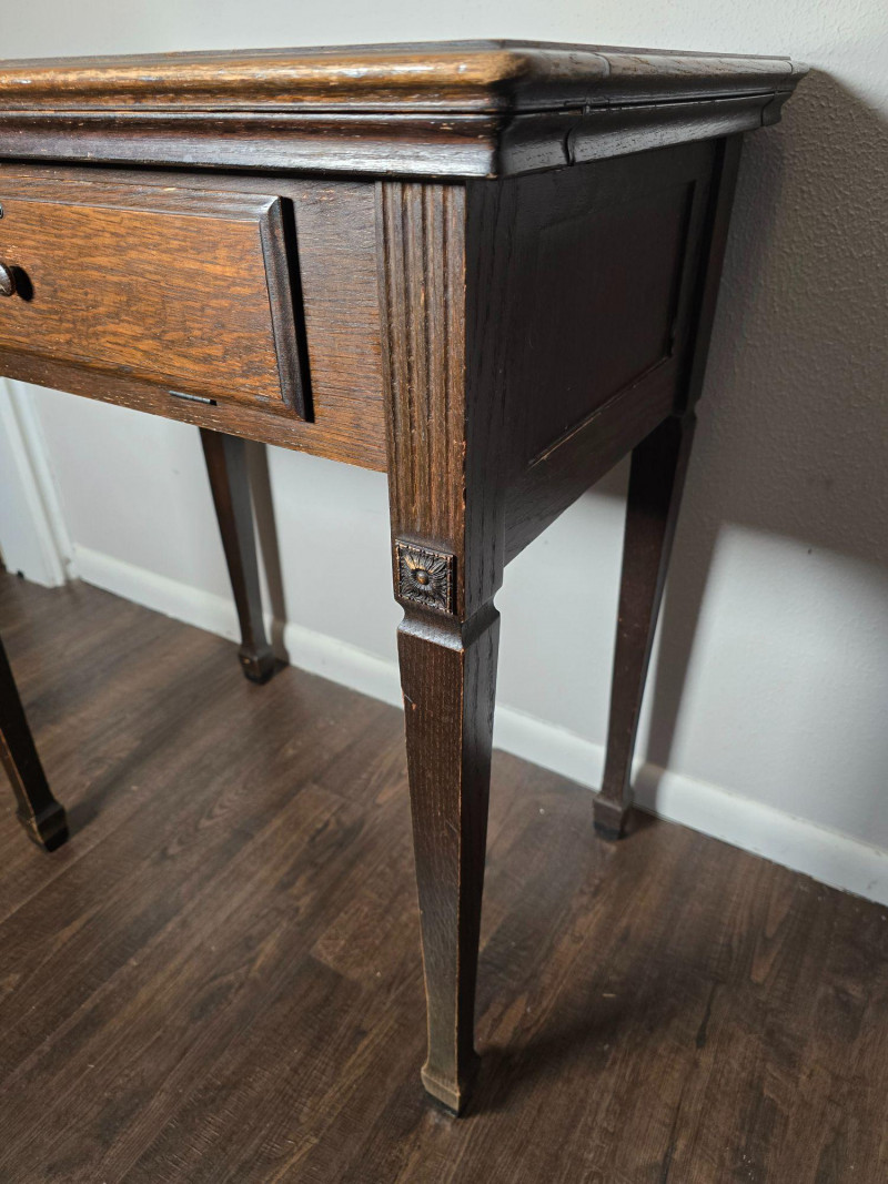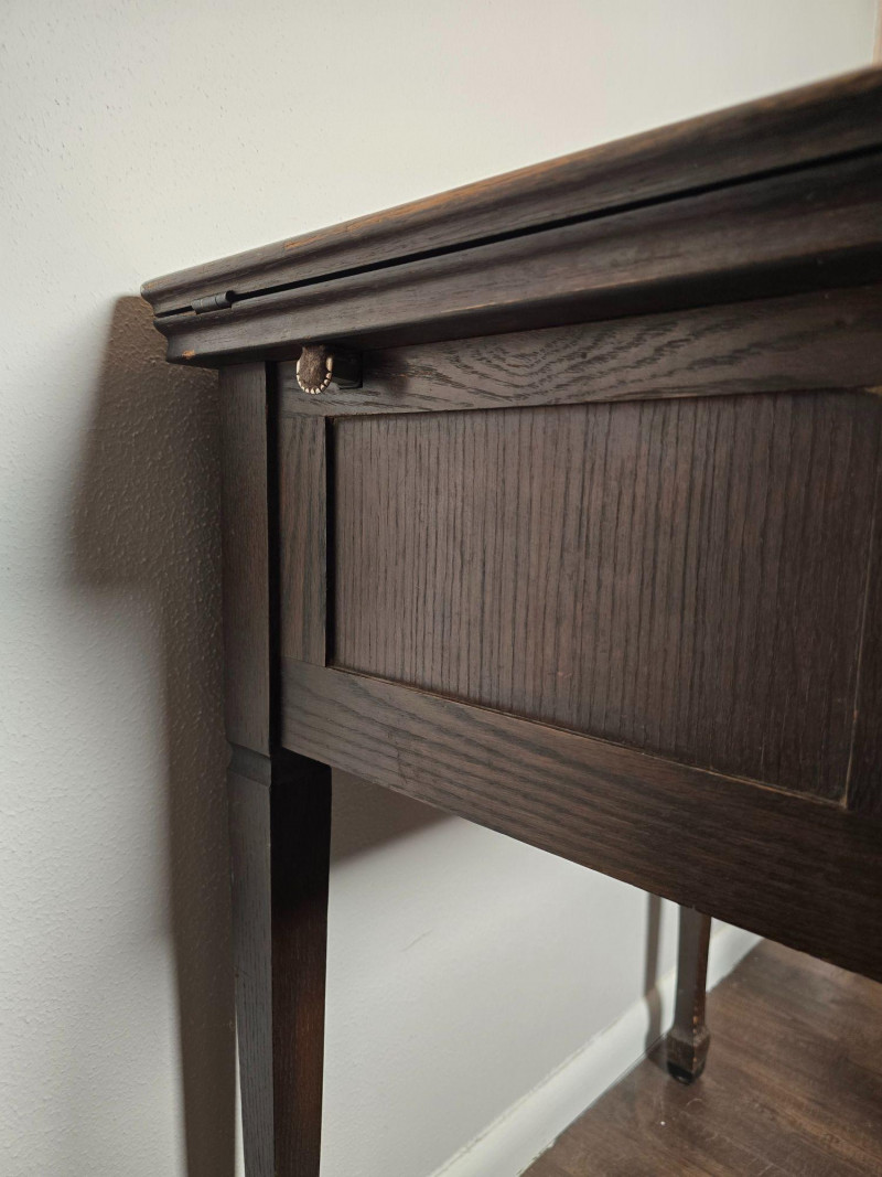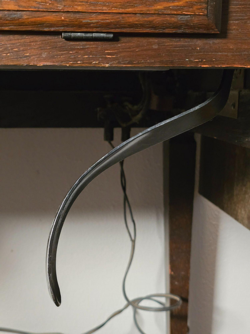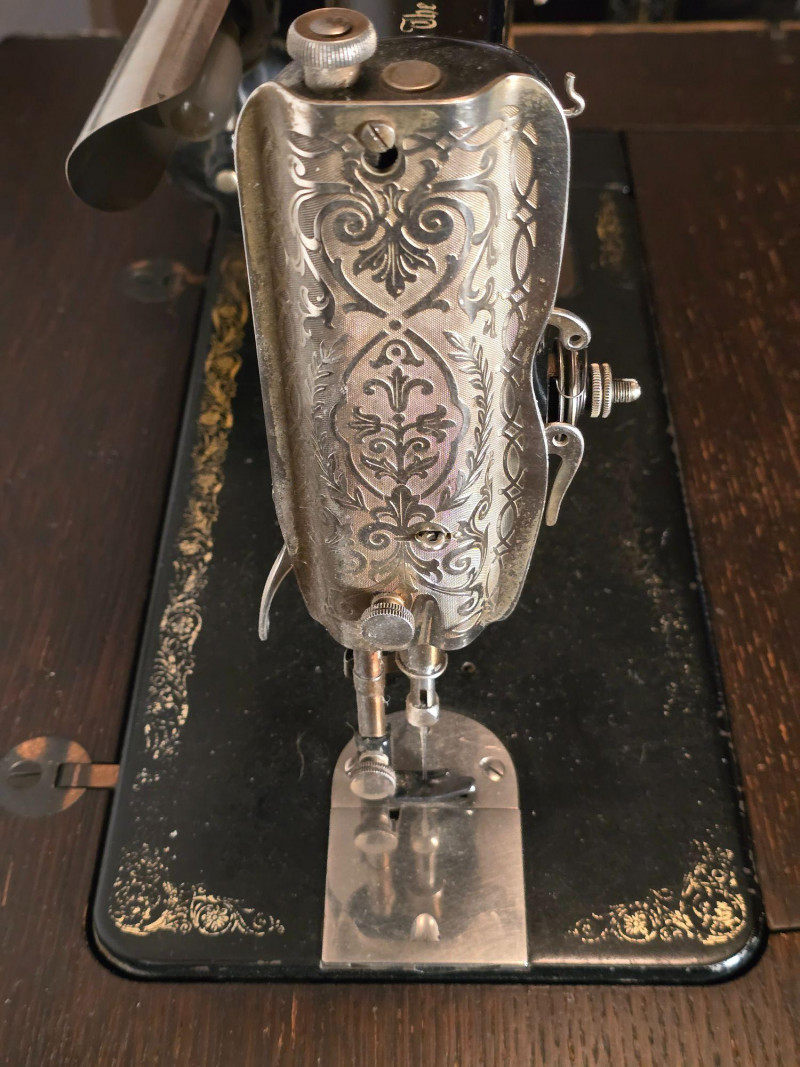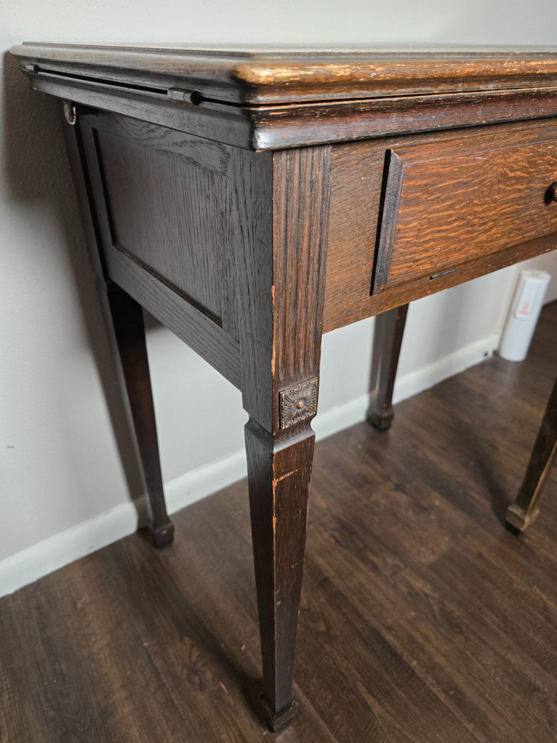 Singer Model 66, manufactured in 1927, offered here with its original wooden sewing table and period electric motor assembly. This example retains its classic black finish with gold decal work, emblem, and matching hardware—hallmarks sought after by collectors of early electric Singer machines. The motor and built‑in light both power on, confirming the integrity of the electrical components; the machine will require a new belt before use. The cabinet includes the original fold‑away compartment and single drawer, with wear consistent with age and long‑term household use. A solid, largely intact Model 66 pairing, well‑suited for collectors, restorers, or those preserving early 20th‑century Singer craftsmanship.
