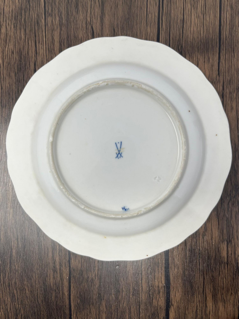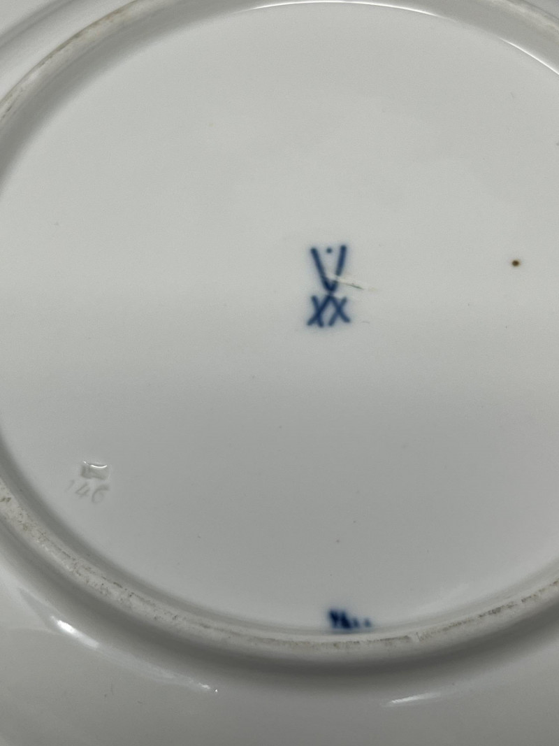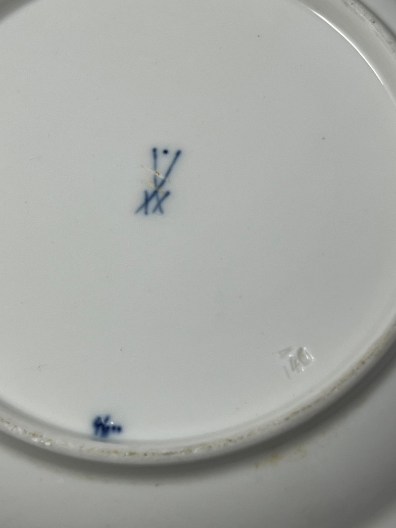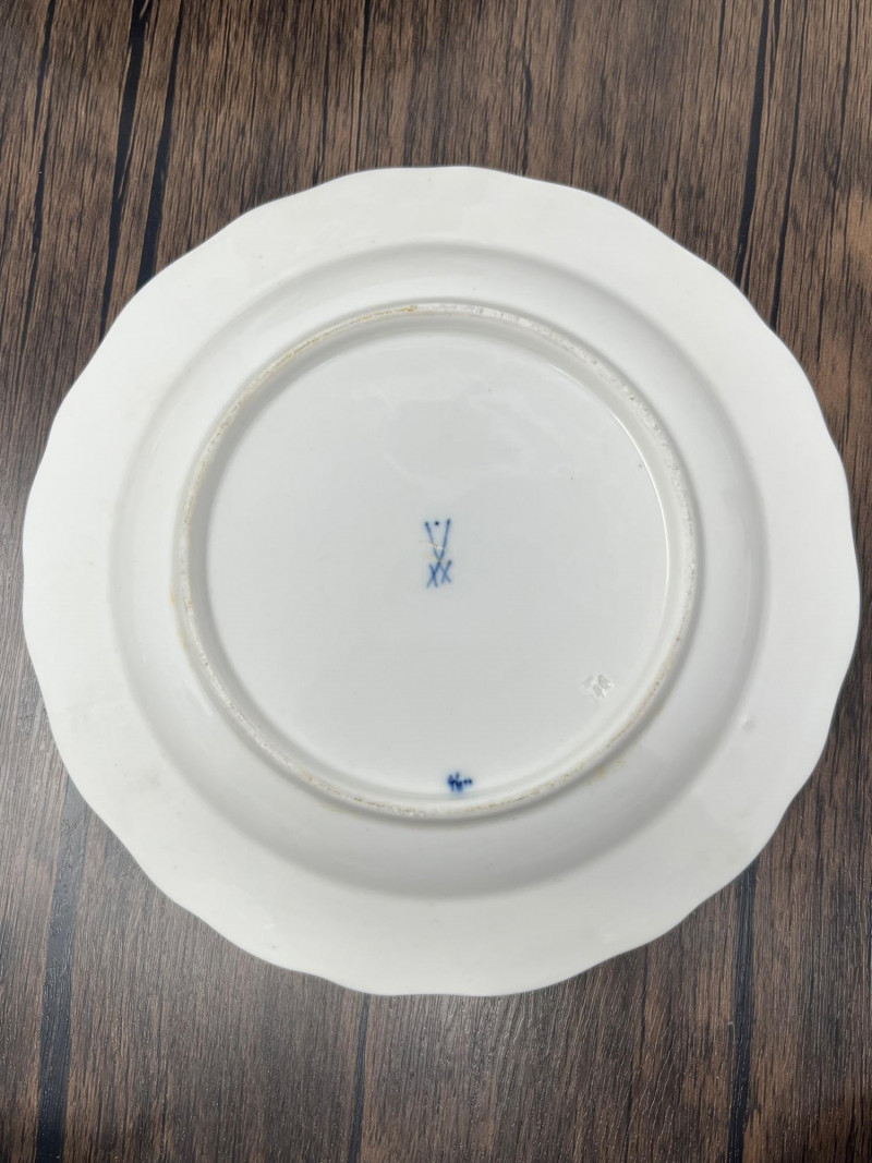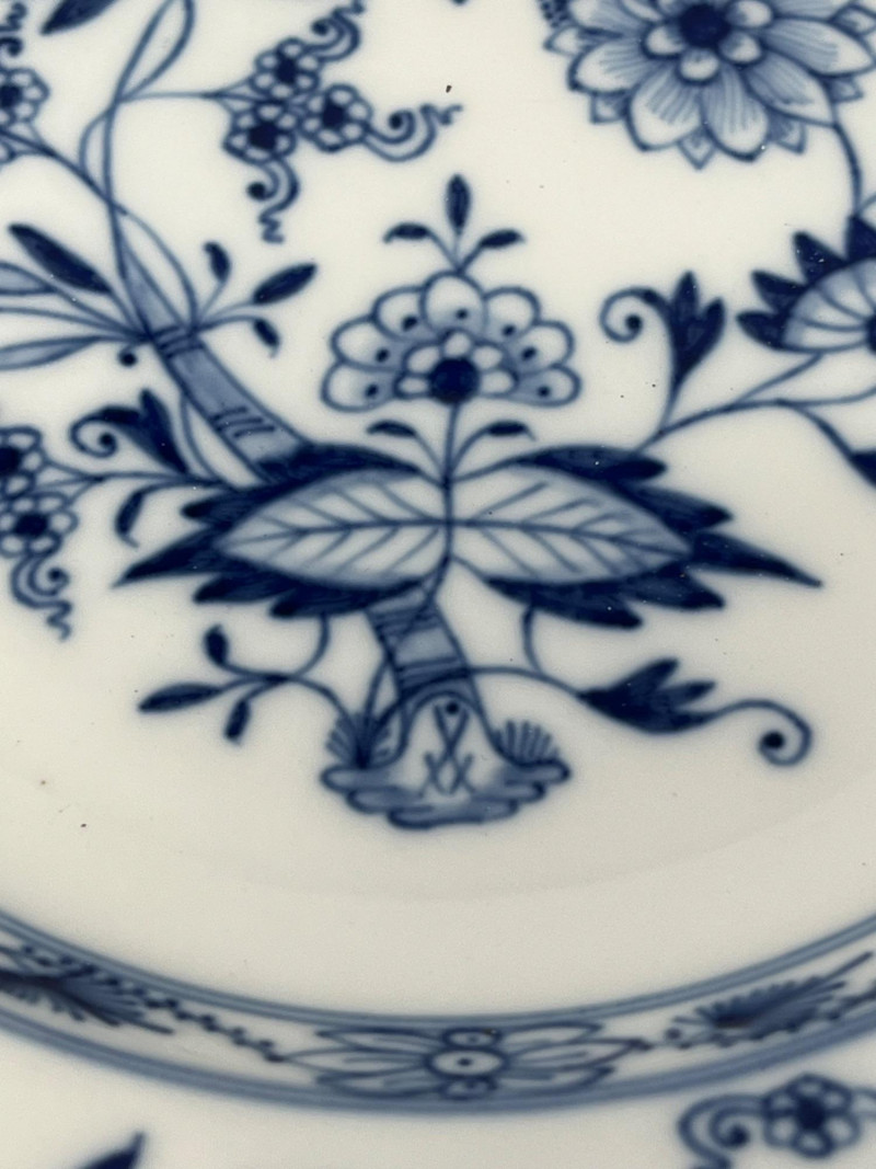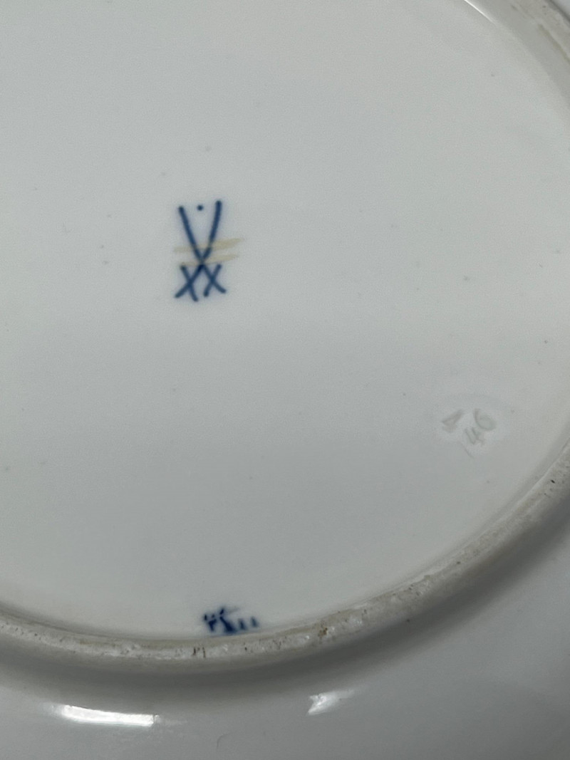 Set of five Meissen blue‑and‑white porcelain plates featuring the crossed‑swords motif on the face, surrounded by traditional cobalt floral decoration. Each plate displays hand‑painted detailing consistent with Meissen’s long‑running blue‑and‑white production. The undersides show the Meissen crossed‑swords trademark with a dot between the swords and two strike marks through the blades. These elements have specific, documented meanings within Meissen’s marking system: Crossed Swords: Meissen’s primary trademark, in continuous use since the early 18th century and recognized as one of the oldest registered porcelain marks in Europe. Dot Between the Swords: A documented variation used by Meissen in certain production periods to distinguish specific workshops or decorative lines. Two Strike Marks: Factory‑applied cancellation marks indicating second‑quality pieces. Meissen used strike marks to denote items with minor imperfections that still met factory standards for sale. These marks do not indicate later damage; they were applied at the factory prior to distribution. These characteristics align with authenticated Meissen second‑quality wares produced from the late 19th century into the early 20th century. Light age‑appropriate wear across the set. Some plates show small rim imperfections typical of vintage Meissen tableware. Decoration remains clear and well‑defined on all five pieces.Mark Details