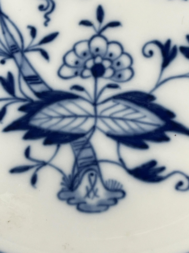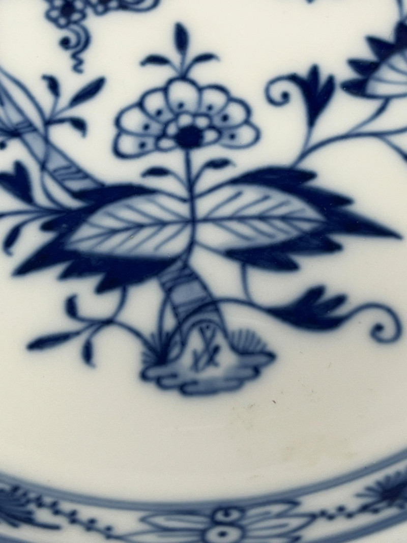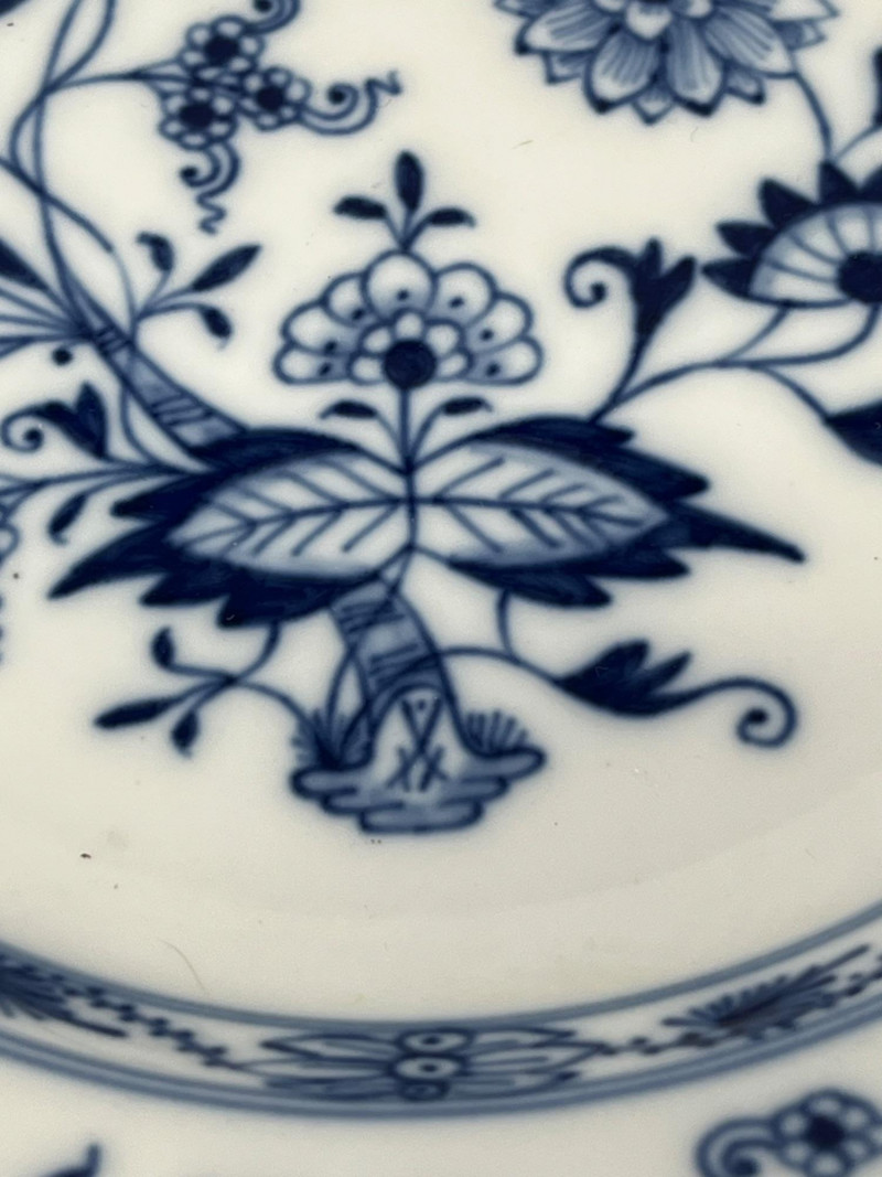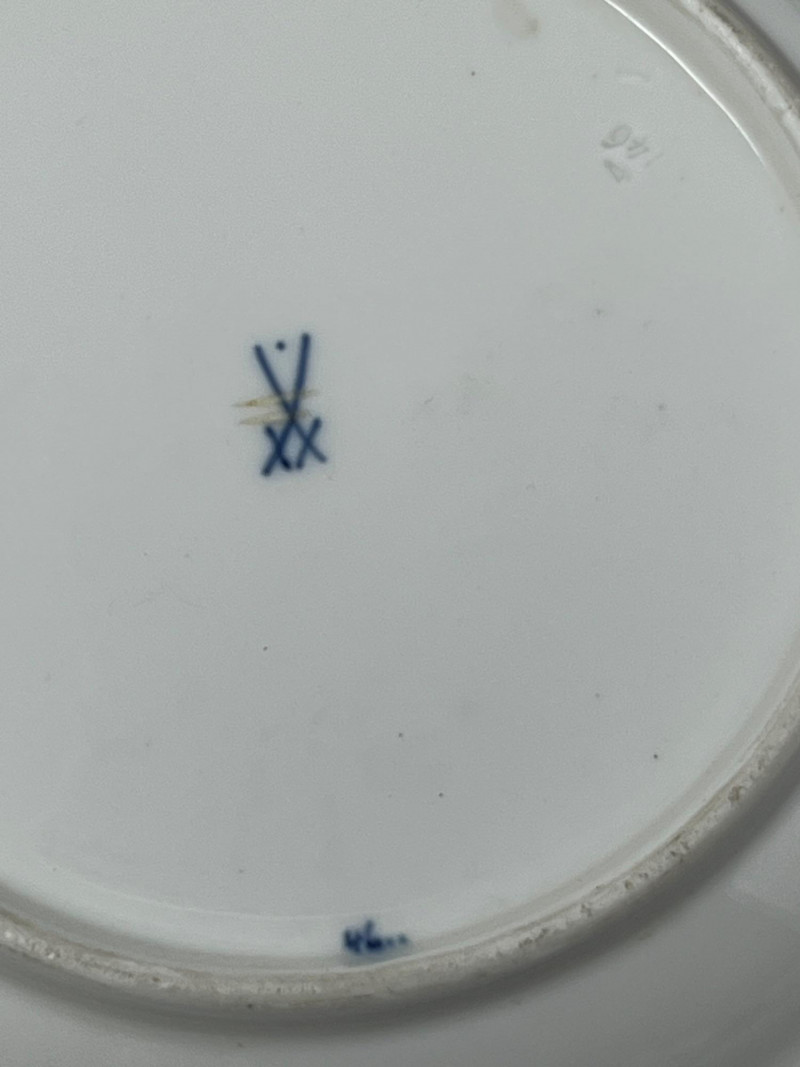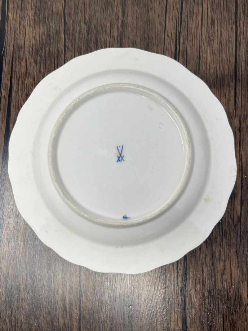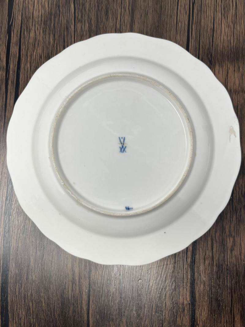 Set of five Meissen blue‑and‑white porcelain plates featuring the crossed‑swords motif on the face, surrounded by traditional cobalt floral decoration. Each plate displays hand‑painted detailing consistent with Meissen’s long‑running blue‑and‑white production. The undersides show the Meissen crossed‑swords trademark with a dot between the swords and two strike marks through the blades. These elements have specific, documented meanings within Meissen’s marking system: Crossed Swords: Meissen’s primary trademark, in continuous use since the early 18th century and recognized as one of the oldest registered porcelain marks in Europe. Dot Between the Swords: A documented variation used by Meissen in certain production periods to distinguish specific workshops or decorative lines. Two Strike Marks: Factory‑applied cancellation marks indicating second‑quality pieces. Meissen used strike marks to denote items with minor imperfections that still met factory standards for sale. These marks do not indicate later damage; they were applied at the factory prior to distribution. These characteristics align with authenticated Meissen second‑quality wares produced from the late 19th century into the early 20th century. Light age‑appropriate wear across the set. Some plates show small rim imperfections typical of vintage Meissen tableware. Decoration remains clear and well‑defined on all five pieces.Mark Details