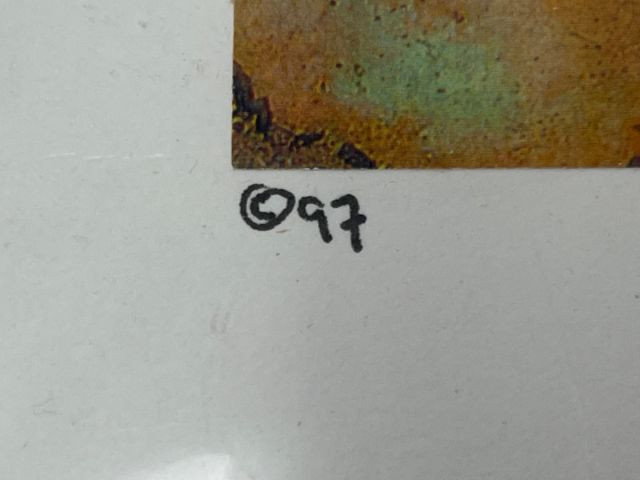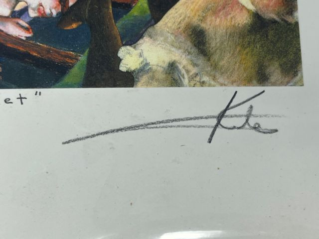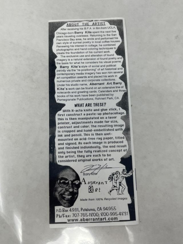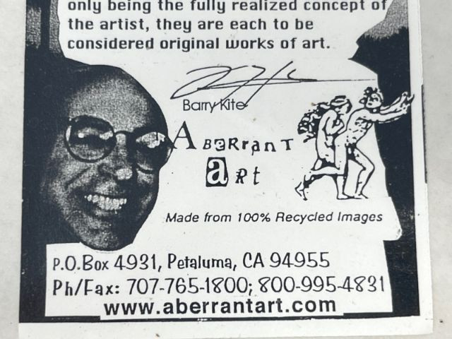 Print from Aberrant Art titled “The Bad Ballet,” signed by artist Barry Kite and dated ©1997. Aberrant Art is known for its collage‑style conceptual prints created from 100% recycled imagery, blending humor, cultural commentary, and layered visual narratives. This piece includes the original Aberrant Art promotional card with studio information and artist background. The imagery features the bold, chaotic, and satirical composition characteristic of Kite’s work from the late 1990s, making it a strong example of his early Aberrant Art period. Artist: Barry Kite (Aberrant Art, Petaluma, CA) Title: The Bad Ballet Type: Signed print Date: ©1997 Signature: Hand‑signed by Barry Kite Included: Original Aberrant Art promotional card Medium: Printed artwork based on mixed‑media collage concepts Condition: Good overall with light handling wear appropriate for age; no noted damage to the print surface Dimensions: Add if needed A distinctive and collectible signed print from Barry Kite, offering the satirical, collage‑driven style that defines Aberrant Art’s work.Item Details