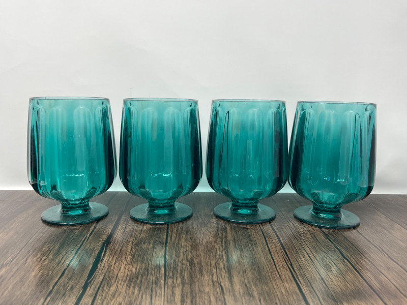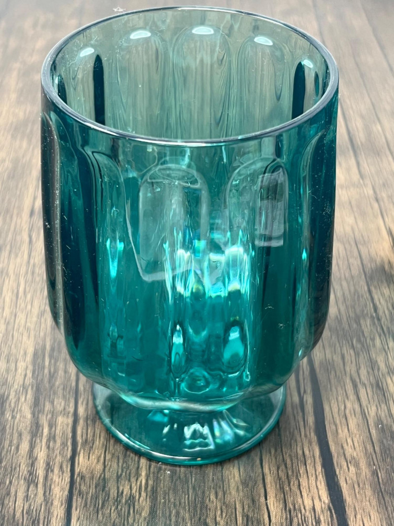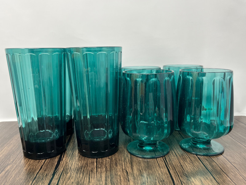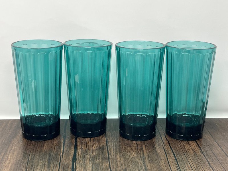 Attractive pair of acrylic drinkware sets from Anthropologie, including four Lucia goblets and four coordinating highball glasses in a rich teal tone. Lightweight, durable, and ideal for indoor or outdoor use. Subtle faceted styling adds a modern decorative touch. Details & Features