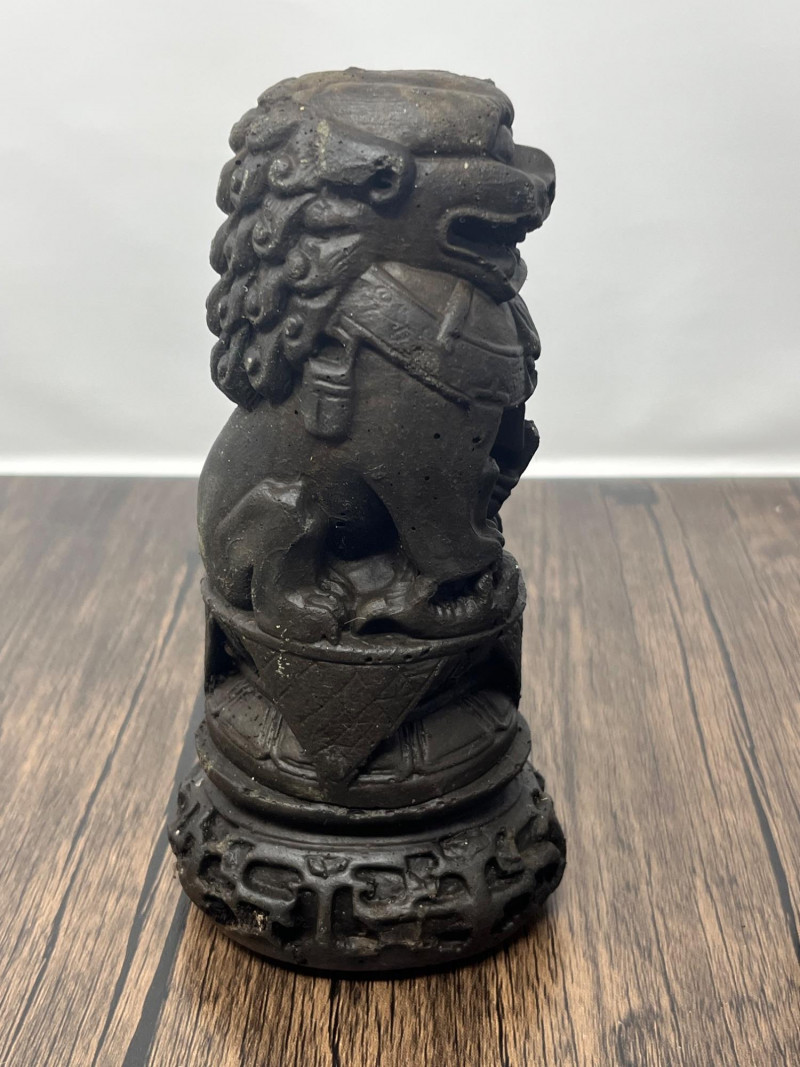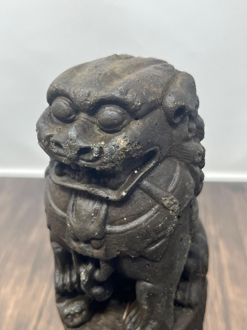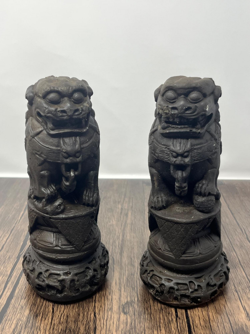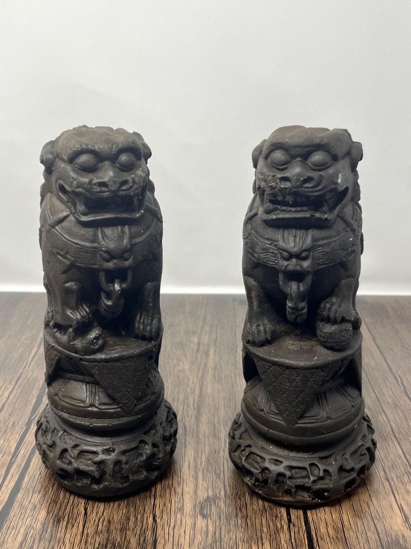 Pair of vintage Chinese Foo Dog guardian statues crafted from solid clay. These protective figures draw from the long tradition of shishi (guardian lions), which have been used in China for centuries to symbolize protection, prosperity, and authority. By the mid‑20th century, smaller domestic versions like this pair became popular decorative pieces, echoing the forms historically placed at temple gates, family compounds, and important civic buildings. This pair shows classic stylistic cues of mid‑century export-era craftsmanship: expressive faces, stylized manes, and compact, weighty forms meant for home altars, entry tables, or bookshelf display. Surfaces show scattered vintage wear consistent with age, including rubbing, small edge wear, and natural clay irregularities. Both pieces are heavy for their size and remain structurally sound. Condition: Vintage wear throughout; structurally solid.