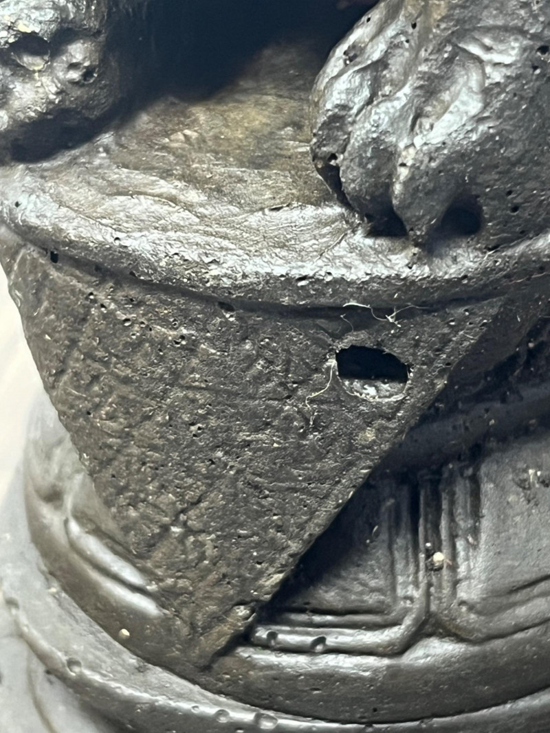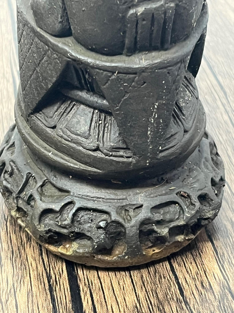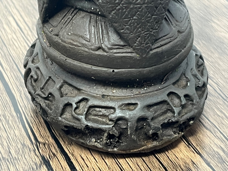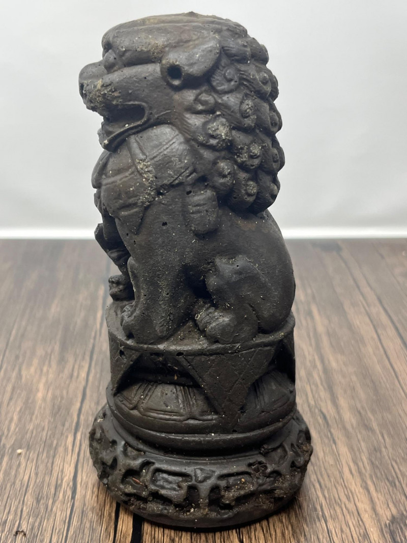 Pair of vintage Chinese Foo Dog guardian statues crafted from solid clay. These protective figures draw from the long tradition of shishi (guardian lions), which have been used in China for centuries to symbolize protection, prosperity, and authority. By the mid‑20th century, smaller domestic versions like this pair became popular decorative pieces, echoing the forms historically placed at temple gates, family compounds, and important civic buildings. This pair shows classic stylistic cues of mid‑century export-era craftsmanship: expressive faces, stylized manes, and compact, weighty forms meant for home altars, entry tables, or bookshelf display. Surfaces show scattered vintage wear consistent with age, including rubbing, small edge wear, and natural clay irregularities. Both pieces are heavy for their size and remain structurally sound. Condition: Vintage wear throughout; structurally solid.