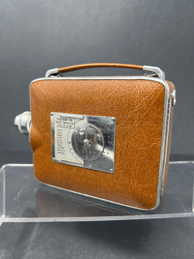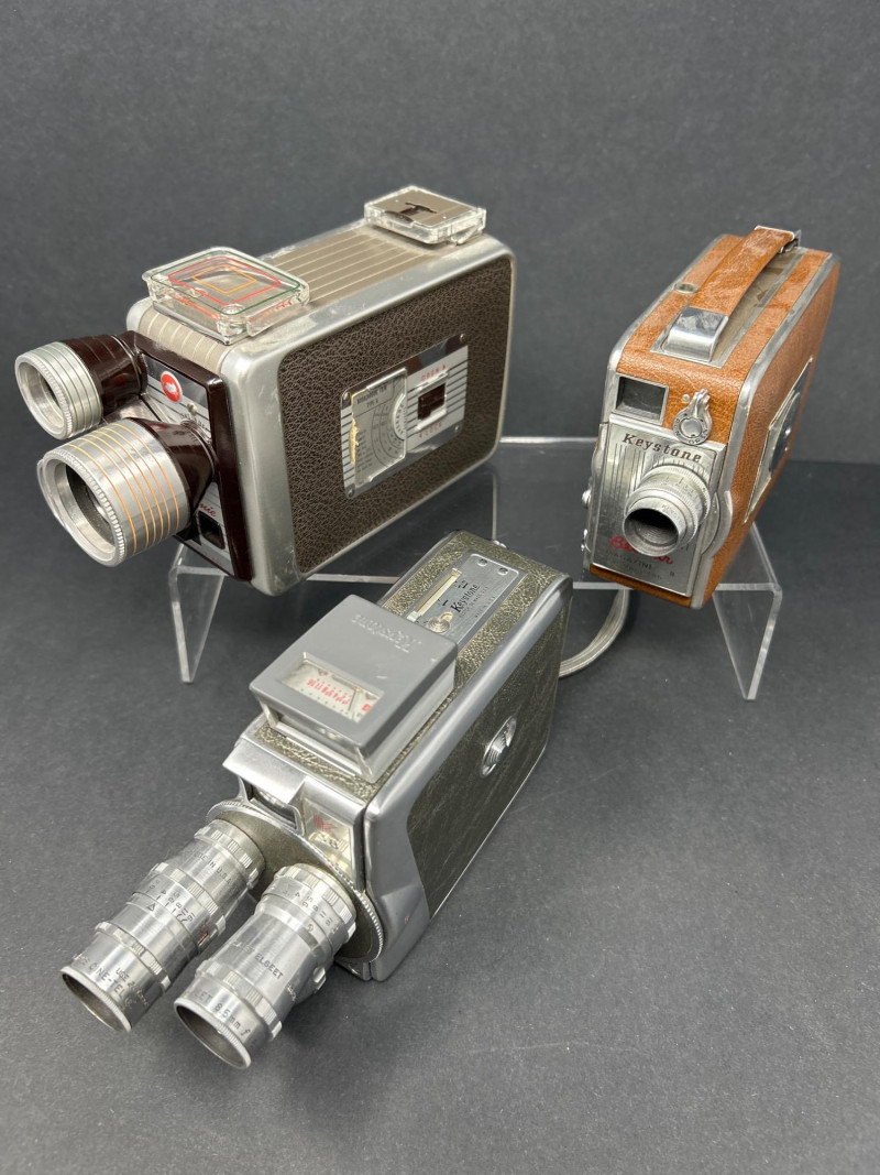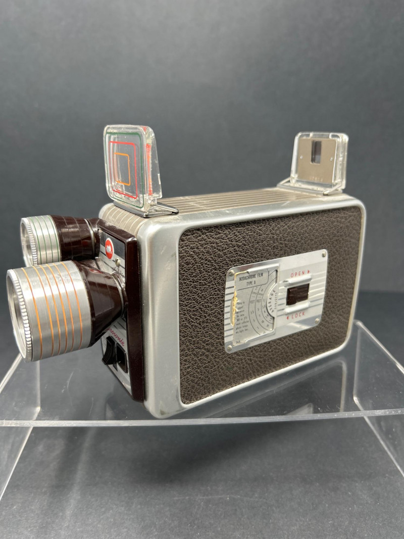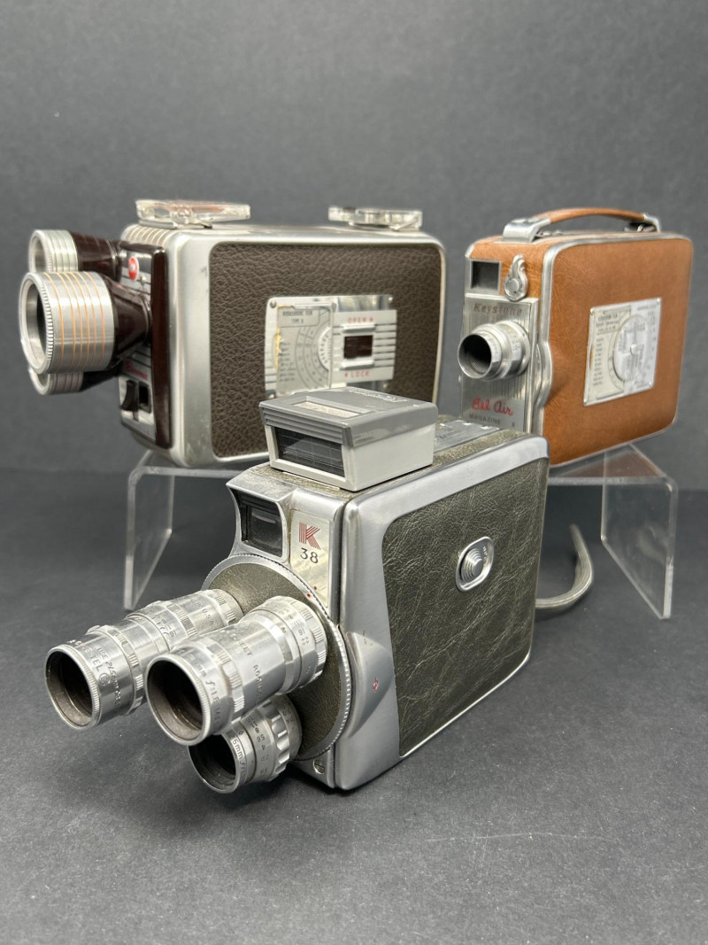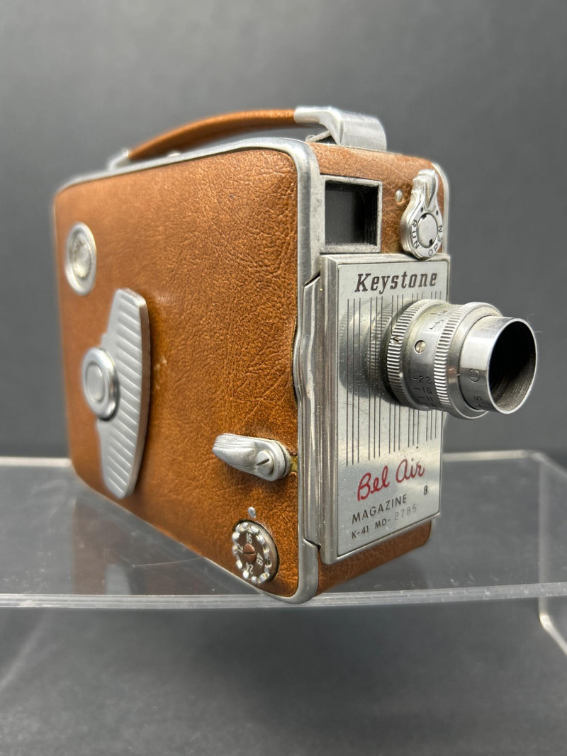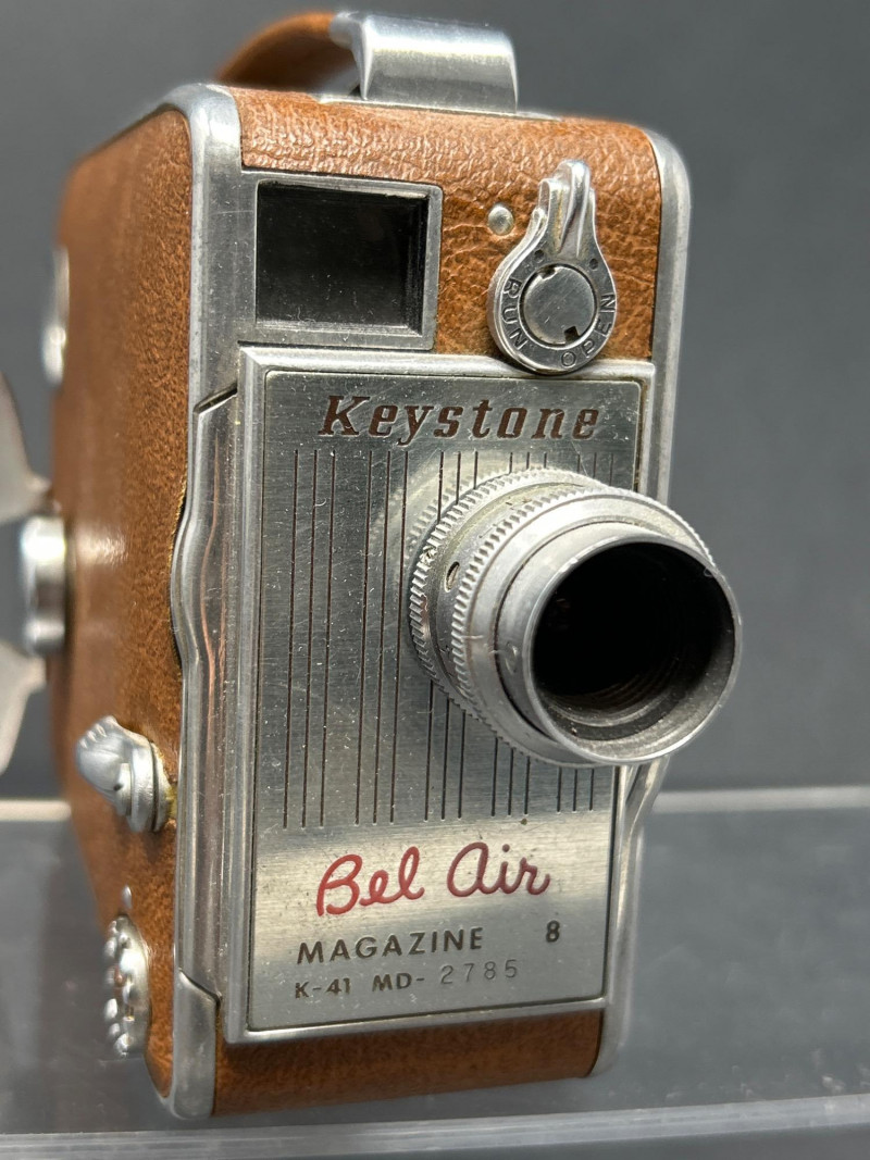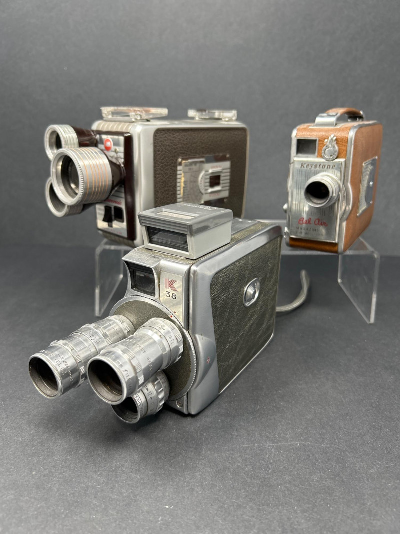 Finish: Warm brown leatherette with brushed metal faceplate and chrome accents Film Type: 8 mm magazine load (Kodachrome daylight type with Wratten filter No. 80B) Design: Compact mid-century 8 mm movie camera with fixed lens, manual wind, exposure guide dial, and clean streamlined styling Style Notes: A charming 1950s portable home-movie camera—sleek, collectible, and display-ready for vintage film enthusiasts Finish: Gray textured leatherette with satin-chrome edges and top-mounted viewfinder Lens System: Triple-lens rotating turret (f/1.8 Keystone-Elgeet lenses) for fast switching between focal lengths Design: Manual exposure controls, side-mounted film speed/exposure guide plate, robust metal body made in Boston, Massachusetts Style Notes: A classic 1950s–60s semi-pro home-movie camera—sturdy and purposeful, ideal for collectors of mechanical film equipment Finish: Brown leatherette with brushed metal faceplate and “Brownie” script logo Lens System: Triple-lens turret with color-coded rings (wide/normal/telephoto), f/1.9 lenses Film Type: 8 mm Kodachrome Type A (rear exposure chart included) Design: Pop-up sports finder, smooth wind key, and iconic Kodak engineering for reliable home filmmaking Style Notes: Perhaps the most recognizable mid-century Kodak movie camera—nostalgic, highly displayable, and a great conversation pieceCamera A – Keystone “Bel Air” Magazine 8 (Model K-41 MD-2785)