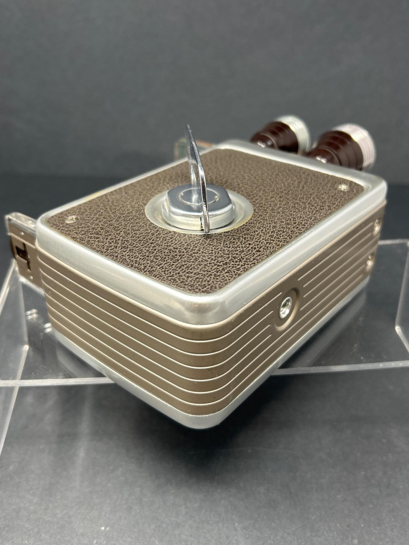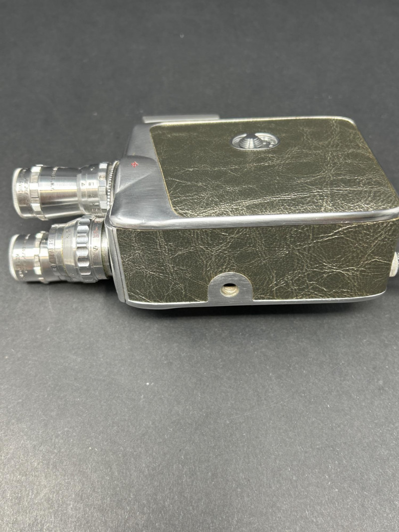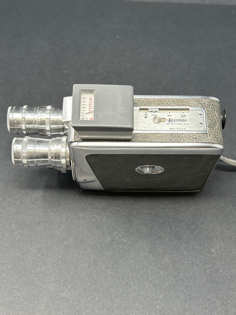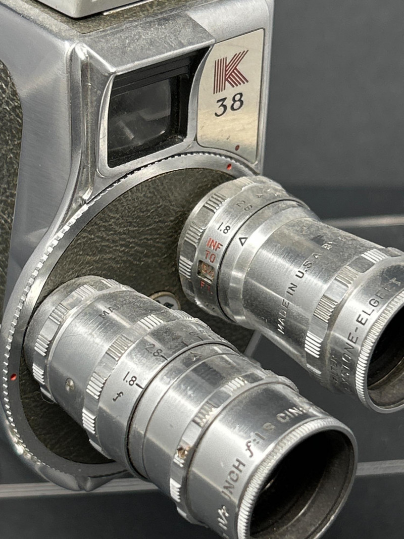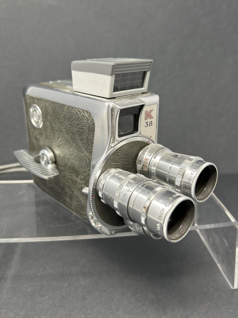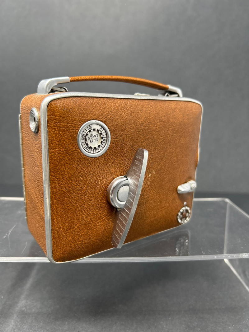 Finish: Warm brown leatherette with brushed metal faceplate and chrome accents Film Type: 8 mm magazine load (Kodachrome daylight type with Wratten filter No. 80B) Design: Compact mid-century 8 mm movie camera with fixed lens, manual wind, exposure guide dial, and clean streamlined styling Style Notes: A charming 1950s portable home-movie camera—sleek, collectible, and display-ready for vintage film enthusiasts Finish: Gray textured leatherette with satin-chrome edges and top-mounted viewfinder Lens System: Triple-lens rotating turret (f/1.8 Keystone-Elgeet lenses) for fast switching between focal lengths Design: Manual exposure controls, side-mounted film speed/exposure guide plate, robust metal body made in Boston, Massachusetts Style Notes: A classic 1950s–60s semi-pro home-movie camera—sturdy and purposeful, ideal for collectors of mechanical film equipment Finish: Brown leatherette with brushed metal faceplate and “Brownie” script logo Lens System: Triple-lens turret with color-coded rings (wide/normal/telephoto), f/1.9 lenses Film Type: 8 mm Kodachrome Type A (rear exposure chart included) Design: Pop-up sports finder, smooth wind key, and iconic Kodak engineering for reliable home filmmaking Style Notes: Perhaps the most recognizable mid-century Kodak movie camera—nostalgic, highly displayable, and a great conversation pieceCamera A – Keystone “Bel Air” Magazine 8 (Model K-41 MD-2785)