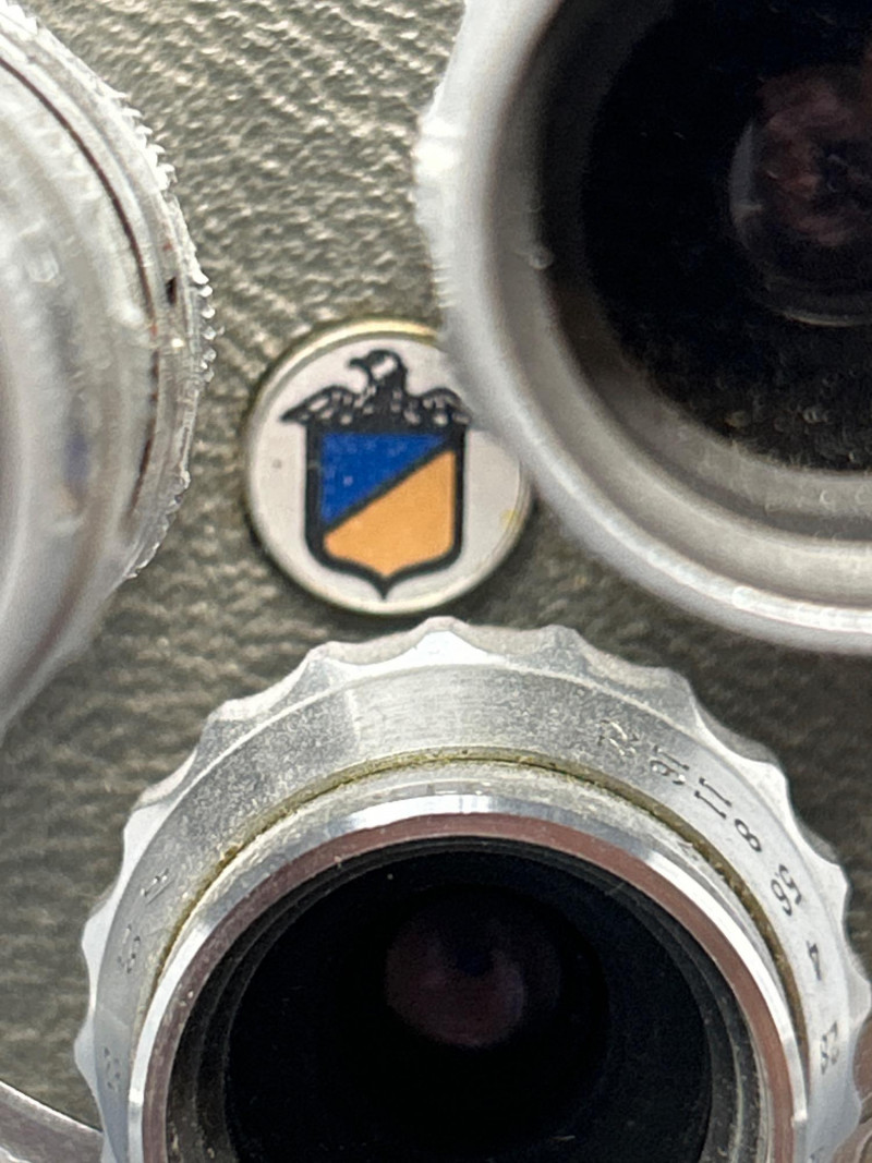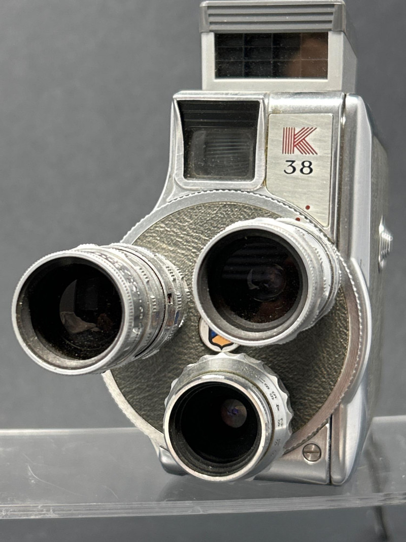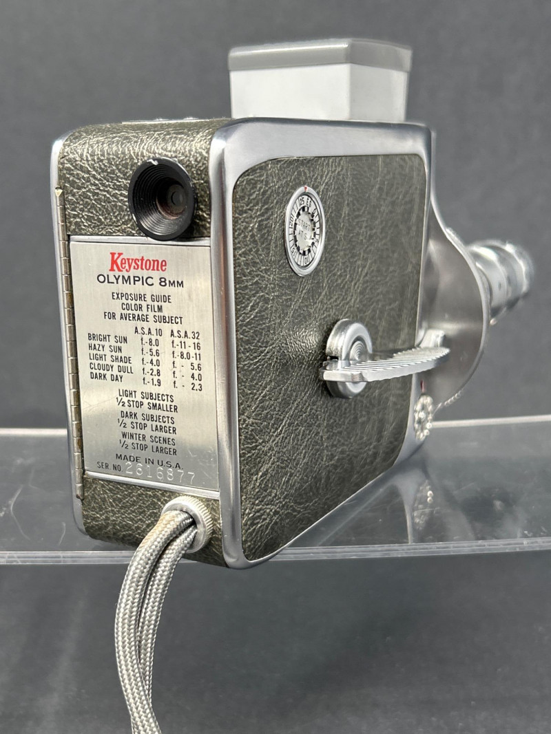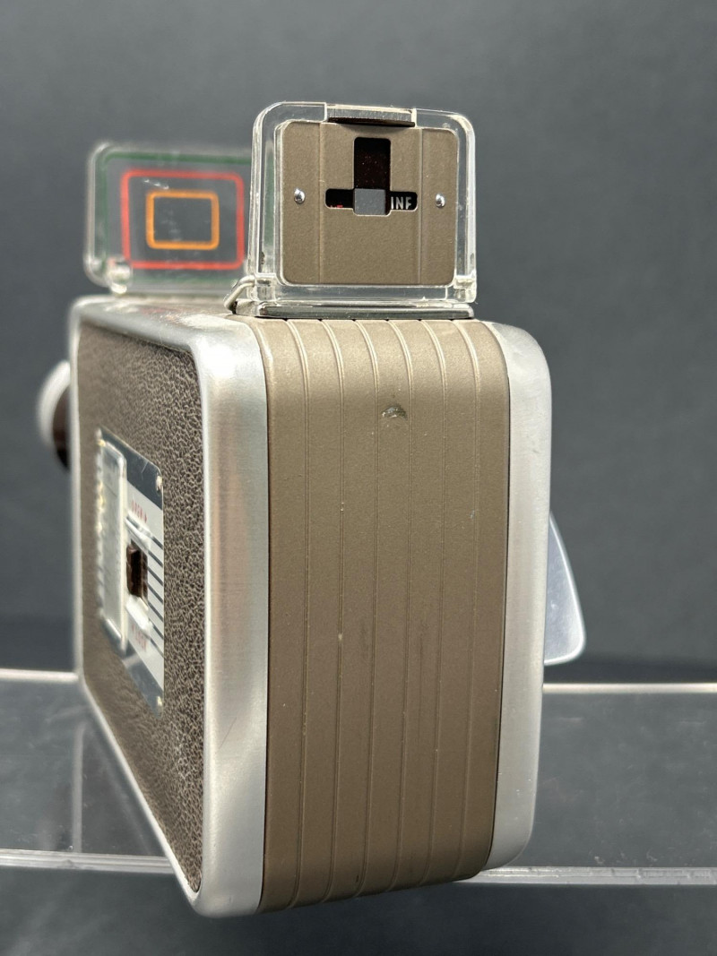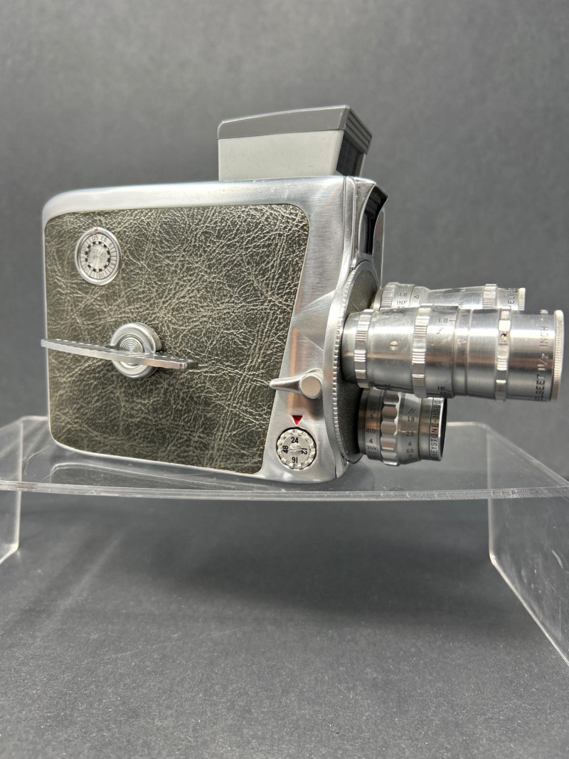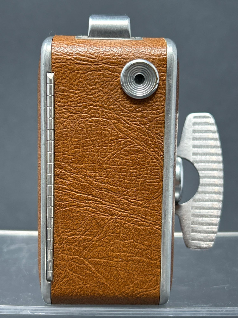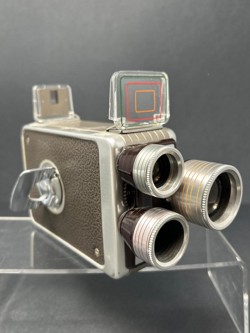 Finish: Warm brown leatherette with brushed metal faceplate and chrome accents Film Type: 8 mm magazine load (Kodachrome daylight type with Wratten filter No. 80B) Design: Compact mid-century 8 mm movie camera with fixed lens, manual wind, exposure guide dial, and clean streamlined styling Style Notes: A charming 1950s portable home-movie camera—sleek, collectible, and display-ready for vintage film enthusiasts Finish: Gray textured leatherette with satin-chrome edges and top-mounted viewfinder Lens System: Triple-lens rotating turret (f/1.8 Keystone-Elgeet lenses) for fast switching between focal lengths Design: Manual exposure controls, side-mounted film speed/exposure guide plate, robust metal body made in Boston, Massachusetts Style Notes: A classic 1950s–60s semi-pro home-movie camera—sturdy and purposeful, ideal for collectors of mechanical film equipment Finish: Brown leatherette with brushed metal faceplate and “Brownie” script logo Lens System: Triple-lens turret with color-coded rings (wide/normal/telephoto), f/1.9 lenses Film Type: 8 mm Kodachrome Type A (rear exposure chart included) Design: Pop-up sports finder, smooth wind key, and iconic Kodak engineering for reliable home filmmaking Style Notes: Perhaps the most recognizable mid-century Kodak movie camera—nostalgic, highly displayable, and a great conversation pieceCamera A – Keystone “Bel Air” Magazine 8 (Model K-41 MD-2785)