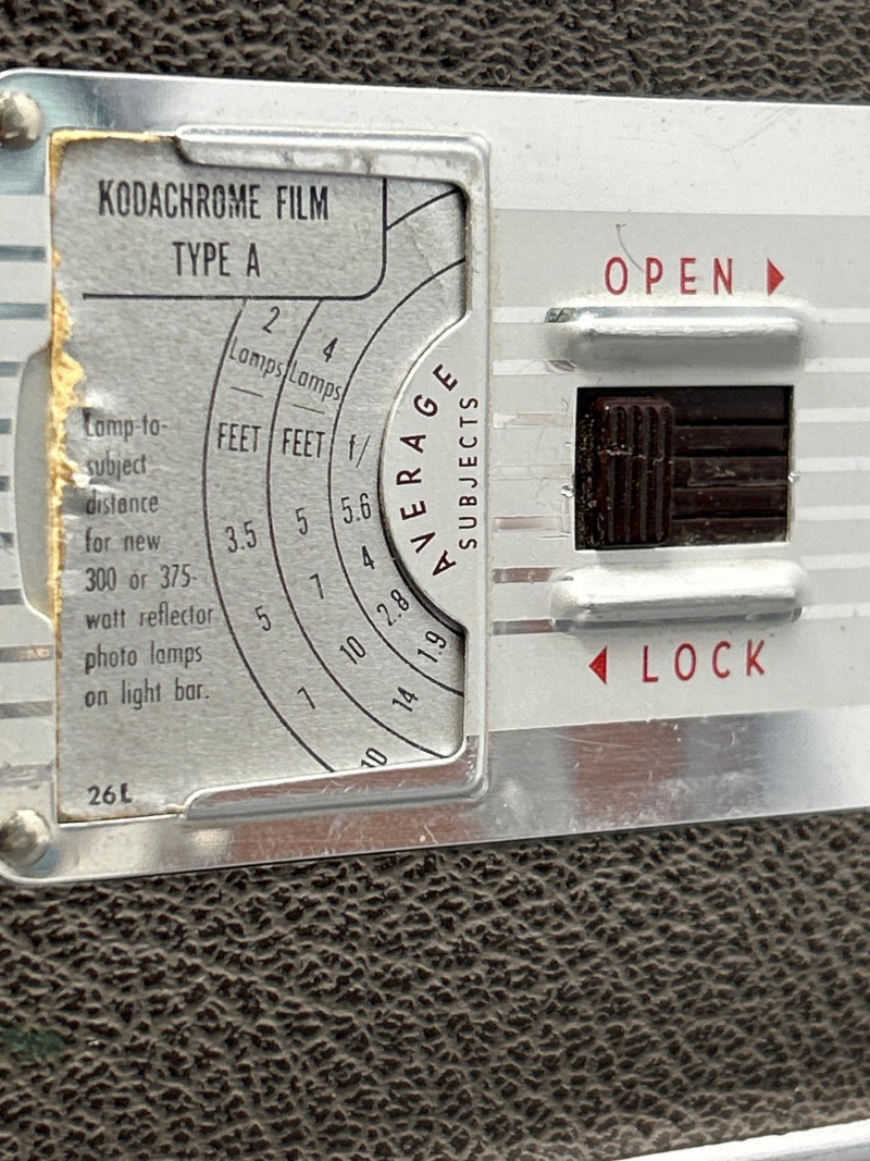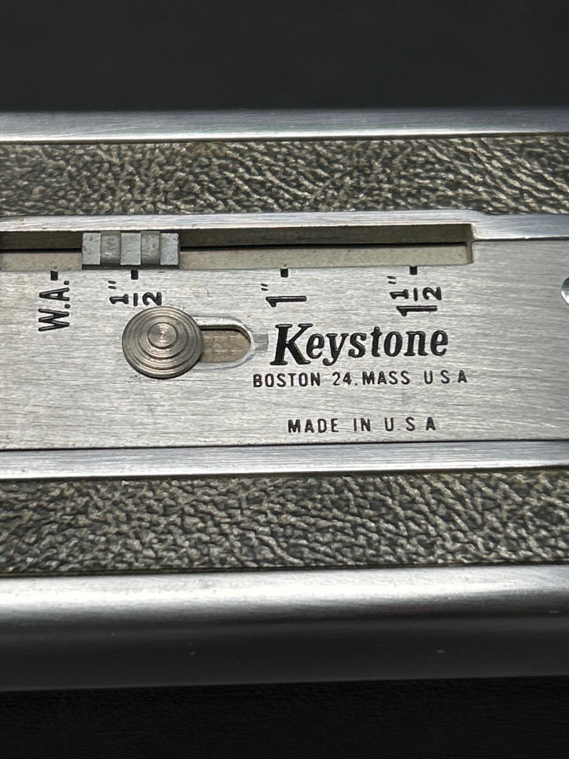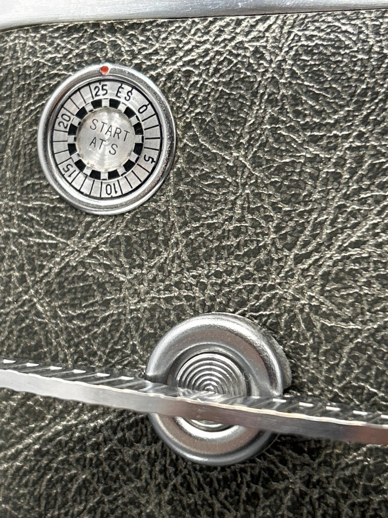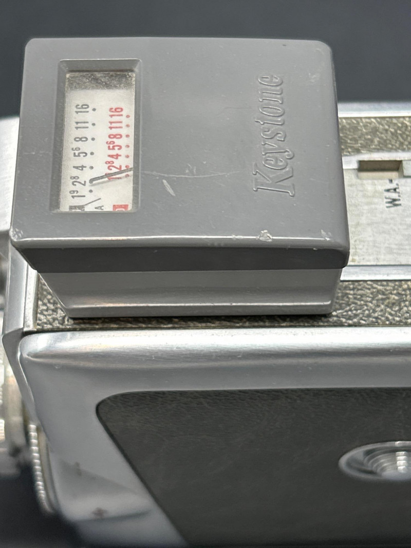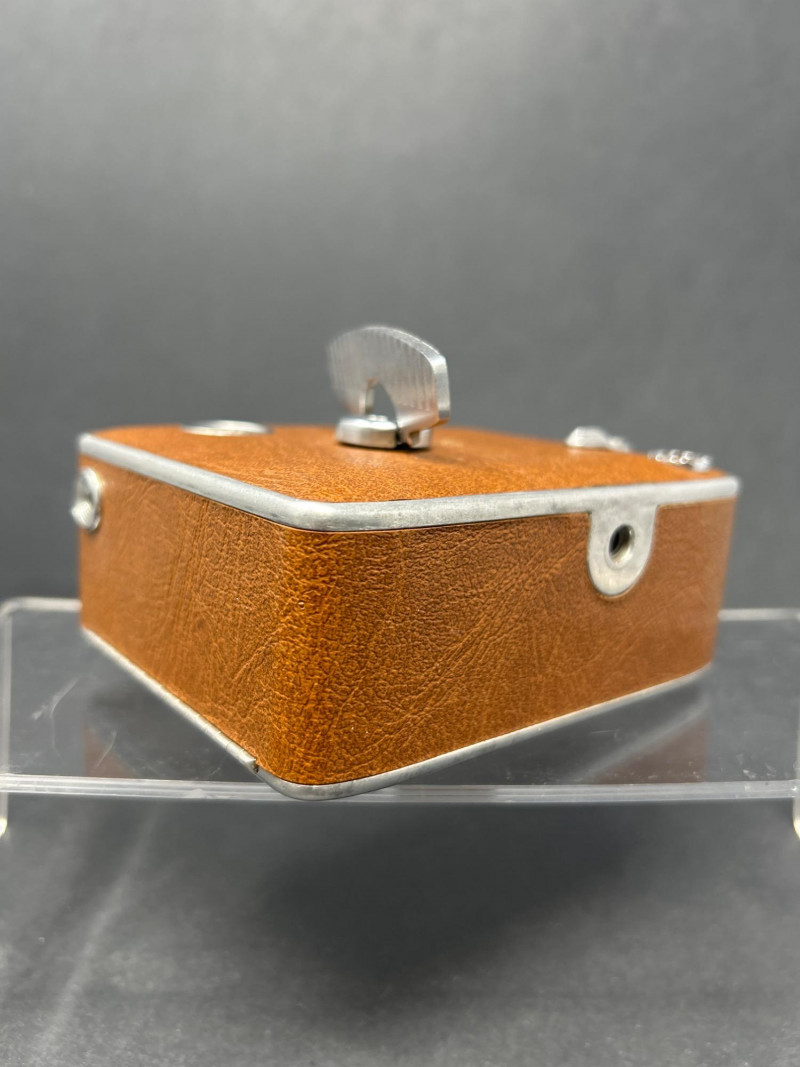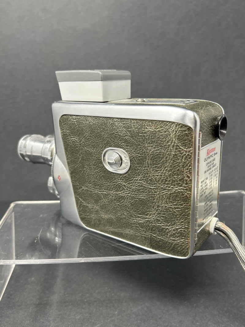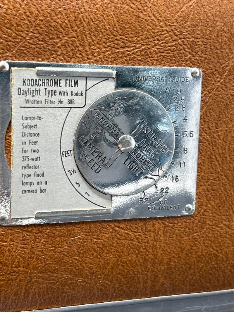 Finish: Warm brown leatherette with brushed metal faceplate and chrome accents Film Type: 8 mm magazine load (Kodachrome daylight type with Wratten filter No. 80B) Design: Compact mid-century 8 mm movie camera with fixed lens, manual wind, exposure guide dial, and clean streamlined styling Style Notes: A charming 1950s portable home-movie camera—sleek, collectible, and display-ready for vintage film enthusiasts Finish: Gray textured leatherette with satin-chrome edges and top-mounted viewfinder Lens System: Triple-lens rotating turret (f/1.8 Keystone-Elgeet lenses) for fast switching between focal lengths Design: Manual exposure controls, side-mounted film speed/exposure guide plate, robust metal body made in Boston, Massachusetts Style Notes: A classic 1950s–60s semi-pro home-movie camera—sturdy and purposeful, ideal for collectors of mechanical film equipment Finish: Brown leatherette with brushed metal faceplate and “Brownie” script logo Lens System: Triple-lens turret with color-coded rings (wide/normal/telephoto), f/1.9 lenses Film Type: 8 mm Kodachrome Type A (rear exposure chart included) Design: Pop-up sports finder, smooth wind key, and iconic Kodak engineering for reliable home filmmaking Style Notes: Perhaps the most recognizable mid-century Kodak movie camera—nostalgic, highly displayable, and a great conversation pieceCamera A – Keystone “Bel Air” Magazine 8 (Model K-41 MD-2785)