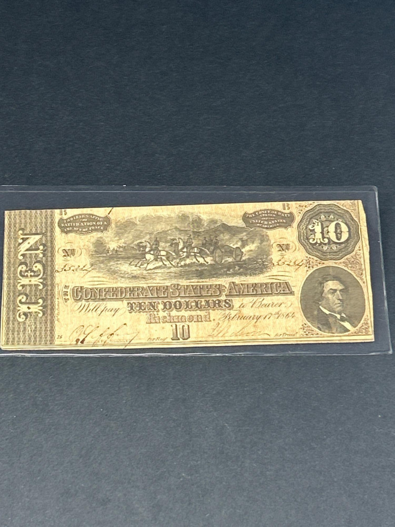 A poignant relic from the final year of the Confederacy, this 1864 ten-dollar banknote issued in Richmond, Virginia, carries the weight of a nation in turmoil. Encased in a protective sleeve, the note features: