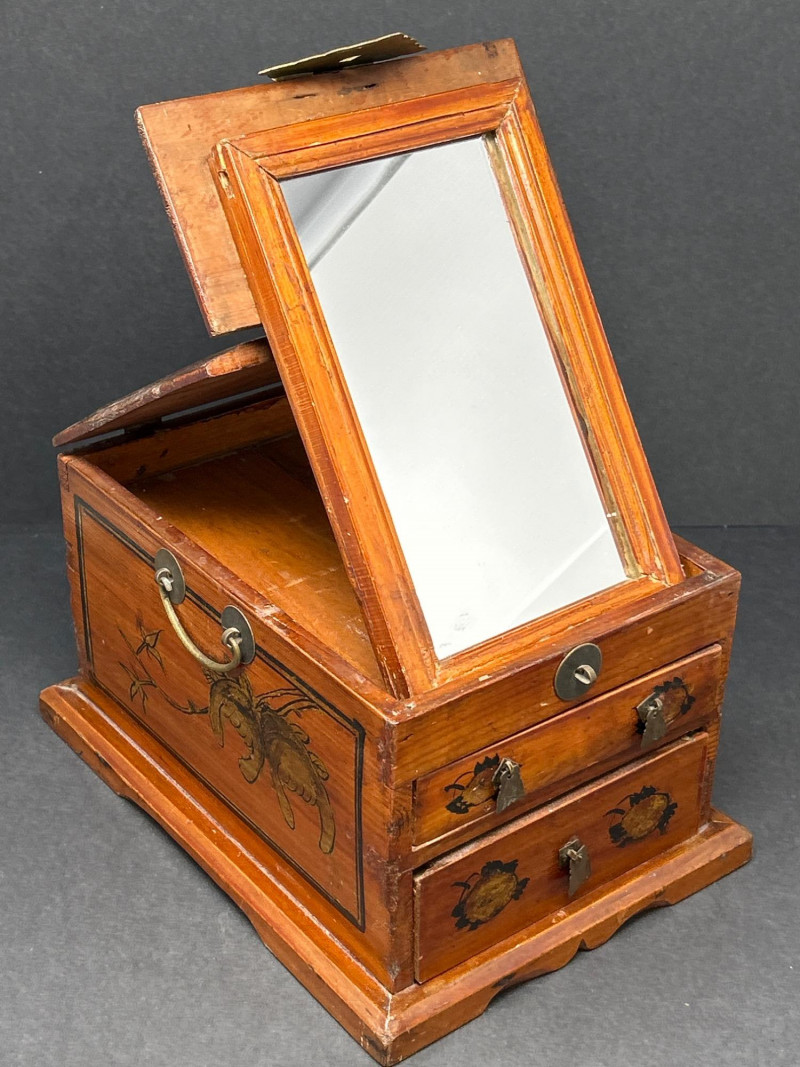 A vintage Asian wooden vanity box featuring a hinged fold-up mirror, two pull-out drawers, and hand-painted floral and bamboo motifs. Crafted from solid wood and accented with decorative brass hardware, including side handles and a lock plate. The top opens to reveal a compartment ideal for small accessories or keepsakes. Dimensions (approx.):
