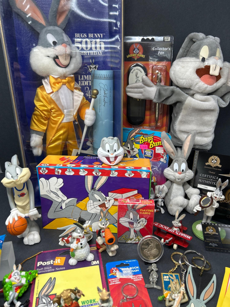 An expansive, officially licensed Bugs Bunny collection spanning plush toys, figurines, novelty items, and rare commemoratives — ideal for animation enthusiasts, Looney Tunes fans, or pop-culture collectors seeking a ready-made showcase. Limited Edition 50th Birthday Plush