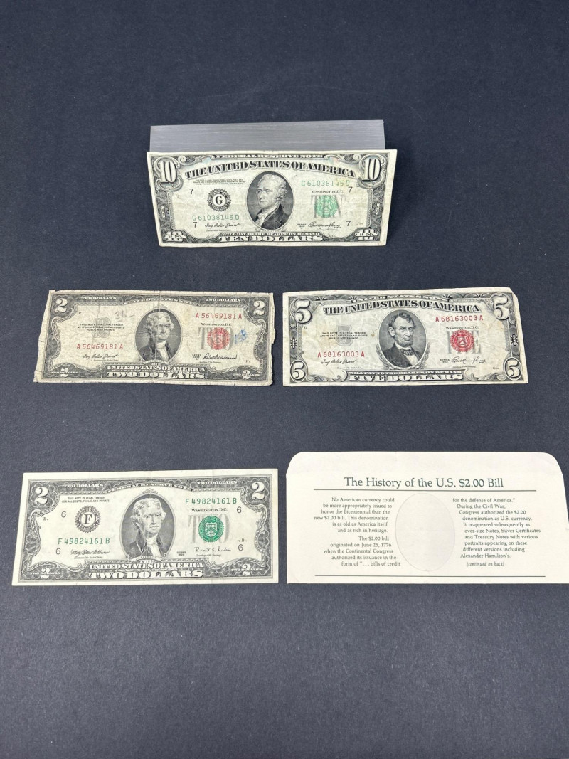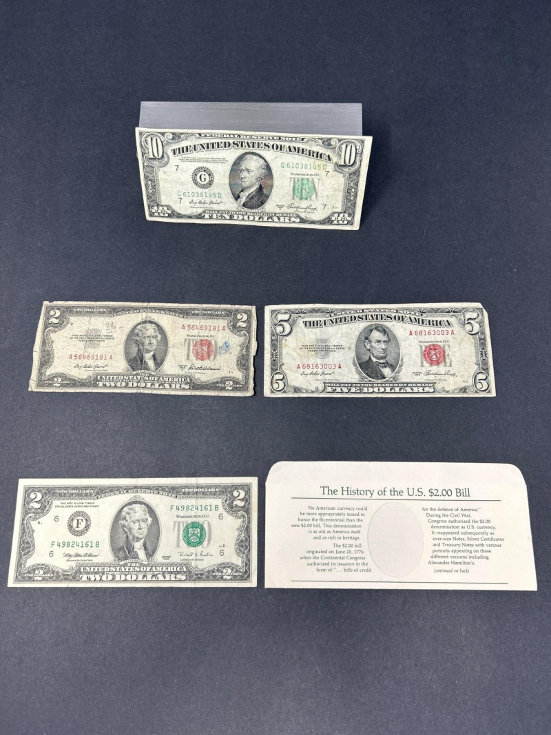 This group showcases the transition from red seal Legal Tender Notes to modern Federal Reserve issues, including a commemorative Bicentennial $2 bill with its original educational card. Collector Insight: Ideal for entry-level collectors or those seeking historical variety across denominations and seal types.