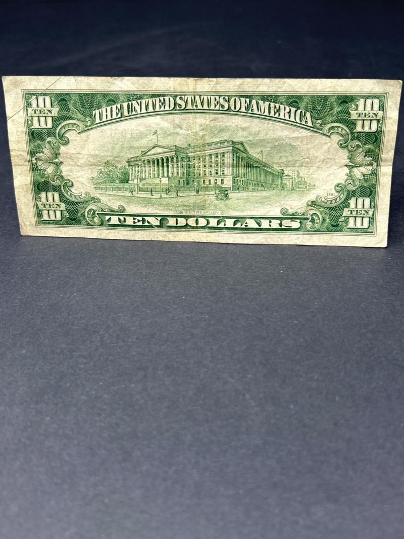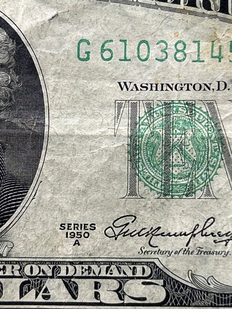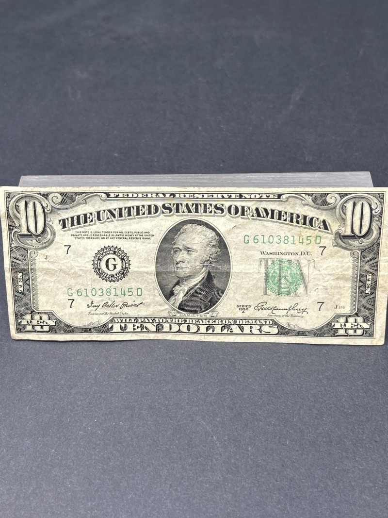 A four-piece group of circulated U.S. banknotes spanning mid-century and Bicentennial-era issues: $10 Federal Reserve Note – Series 1950 A