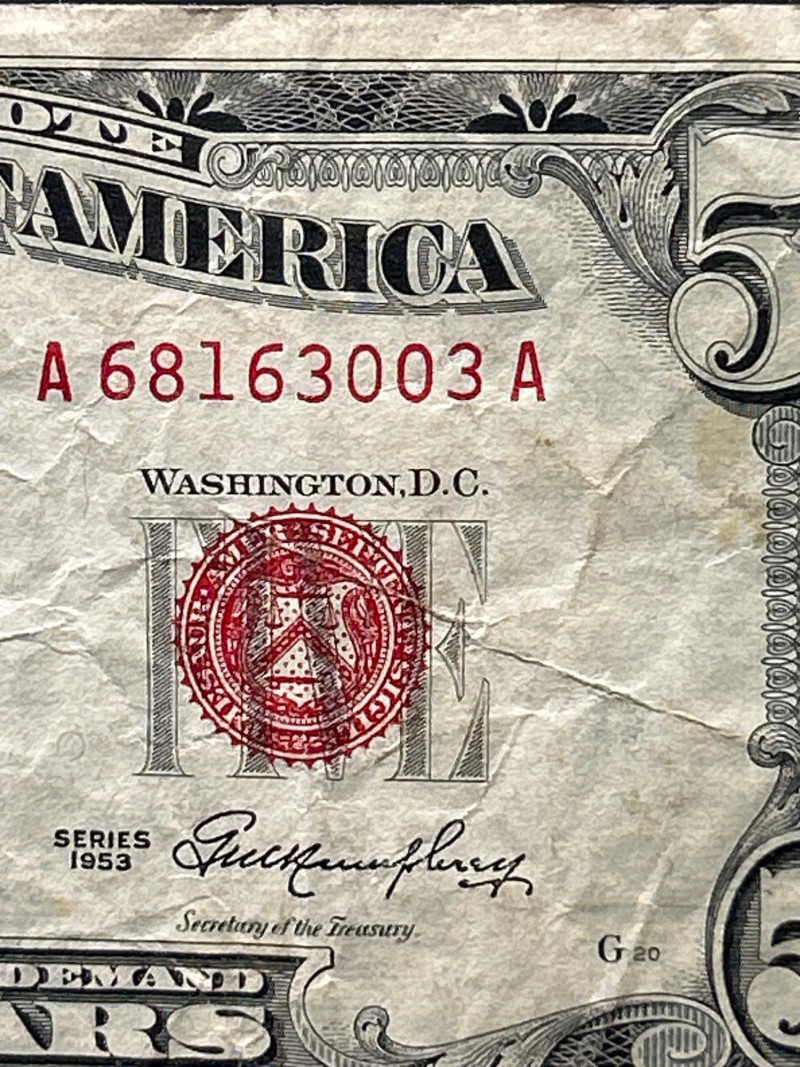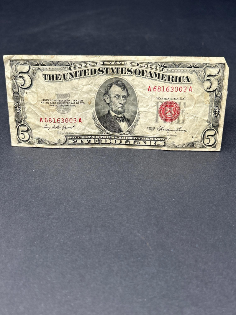 Circulated with folds and creases; typical wear consistent with age. $5 United States Note – Series 1953 A