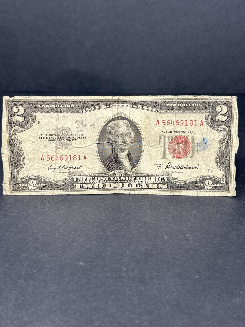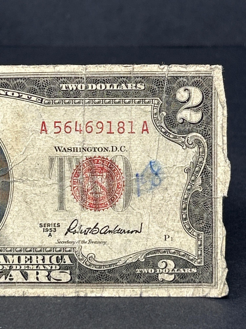 Classic Legal Tender note with visible wear and soft folds. $2 United States Note – Series 1953 A