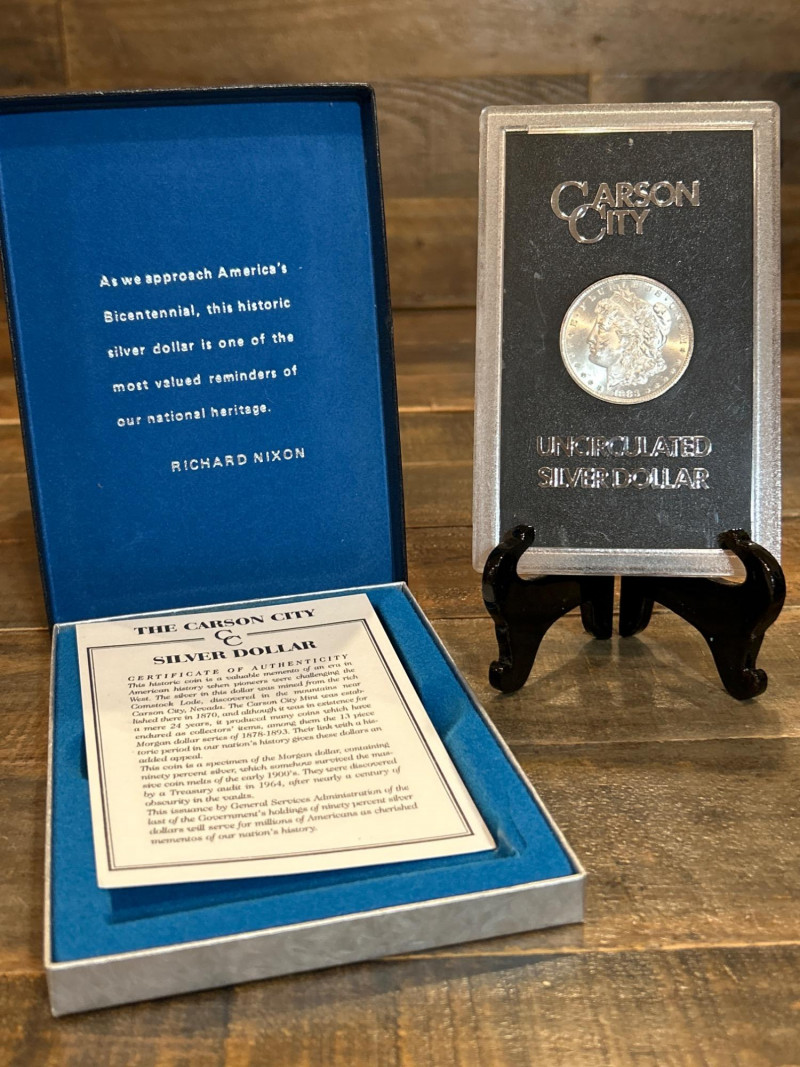Morgan dollars from the Carson City Mint are prized for their limited mintage and ties to the Wild West and Comstock Lode. The 1883-CC is especially favored for its sharp strike and cartwheel luster. GSA-hoard examples with full original packaging and COA remain highly desirable among numismatists.