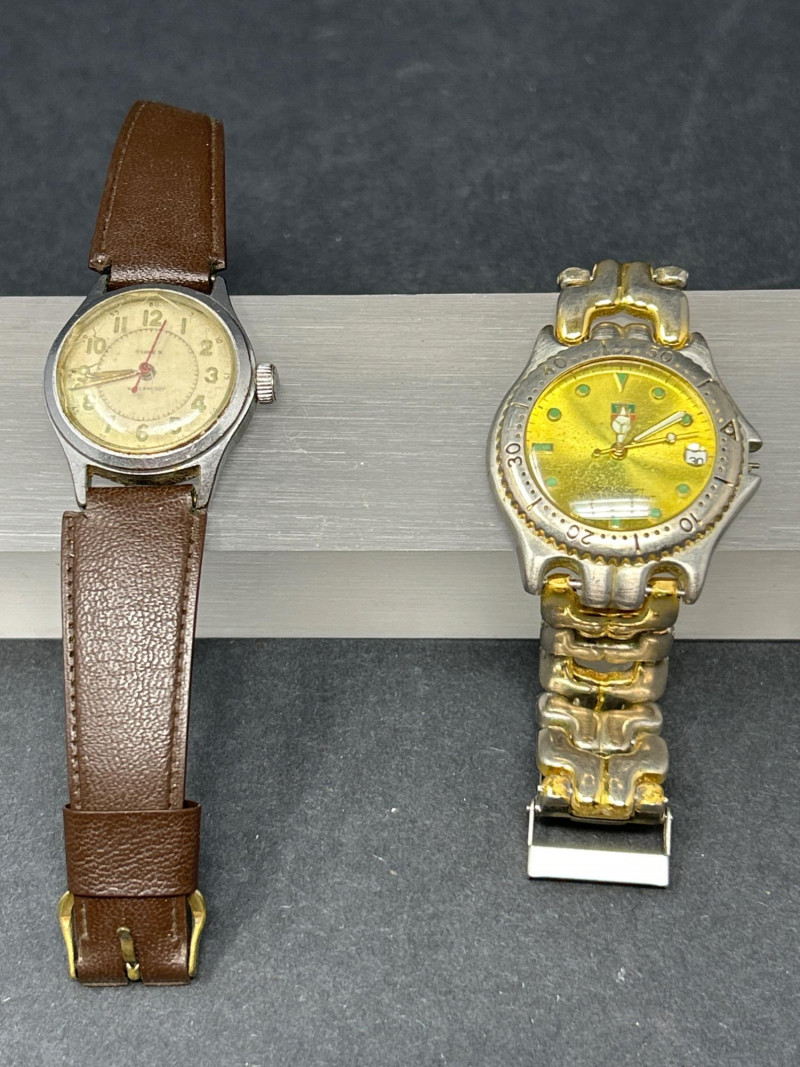TAG Heuer 2000 Series Quartz Diver (c. 1980s–1990s) Dial: Gold-tone with luminous hour markers, Mercedes-style hands, and date window at 3 o’clock. Case & Bezel: Stainless steel with gold-tone accents; unidirectional diver-style bezel marked 10–50. Bracelet: Two-tone link bracelet; clasp stamped TAG Heuer. Markings: TAG Heuer shield logo on dial and caseback. Specs: Rated “200 M / 660 FT Water Resistant” on dial. Condition: Missing winding piece. Vintage Timex Manual-Wind (U.S. Time Corp., 1950s–early 1960s) Dial: Aged cream with luminous Arabic numerals and red seconds hand. Caseback: Stamped “U.S. Time Corporation – Dustproof Waterproof Shock Resistant Stainless Steel Back.” Movement: Likely manual-wind (pre-1962 Timex branding). Strap: Replacement brown faux leather strap