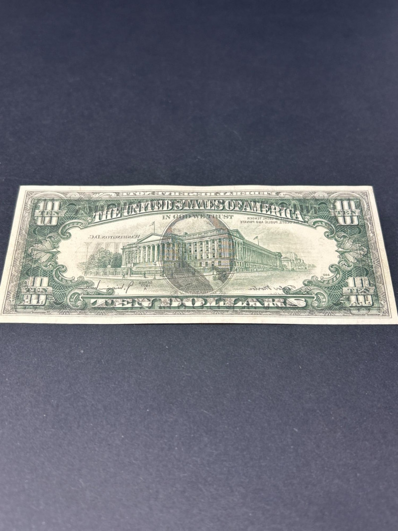 A dramatic and highly collectible 1977 $10 Federal Reserve Note showcasing a rare full back-to-front offset printing error. This error occurs when freshly printed sheets stack before the ink fully dries, creating a mirror image transfer of the back design onto the front of the note. Unlike light smudges or partial transfers, this example shows a full, extra-dark ghost image that is sharp and highly visible. Series: 1977 Denomination: Ten Dollars
