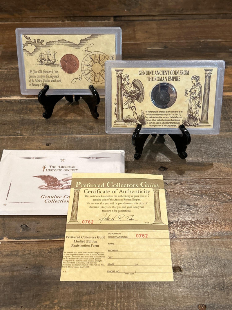 A striking pair of authenticated ancient coins presented in commemorative display cards, each backed by provenance documentation. This lot includes: 1600-Year-Old Shipwreck Coin: Housed in a maritime-themed card featuring a ship and map motif, this coin is described as recovered from a historical shipwreck. Its encrusted surface and irregular patina suggest long-term submersion, adding to its mystique and collector value. Genuine Roman Empire Coin: Displayed with an illustration of a Roman soldier and empire map, this coin is attributed to the Roman Empire era. The embedded coin shows wear consistent with circulation and age, with partial inscriptions and classic Roman iconography. Documentation Included: Certificate of Authenticity from the Preferred Collectors Guild (Serial No. 0762) Limited Edition Registration Form Envelope from The American Historic Society, labeled “Genuine Coin Collection” Highlights: Authenticated and serialized certificate Professionally mounted for display and preservation Ideal for collectors of ancient coins, maritime relics, and Roman history