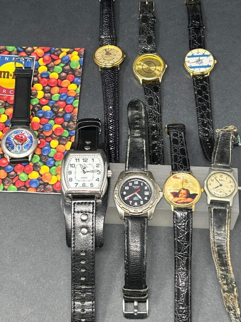 A vibrant mix of eight wristwatches featuring leather or synthetic straps, spanning commemorative, promotional, and dress styles. This lot includes quartz and solar-powered models, each with distinct dial themes and case finishes. Included Watches: Bulova gold-tone quartz wristwatch, engraved “B. Wolfe 801 9/04/96” on case back; black leather strap Pulsar Solar 60M diver-style watch with black dial, compass bezel, and date window Beverly Hills Polo Club quartz watch, oversized rectangular case with bold numeral dial Infinity Quartz gold-tone dress watch with classic styling ABC Centennial 800 Series commemorative watch (1895–1995) with historical motif Angel/Cherub-themed gold-tone dress watch featuring classical artwork dial Star of David novelty watch with musical notes and cultural symbolism M&M’s Inner Circle promotional watch with red M&M character dial; includes colorful branded backing card Condition Report: