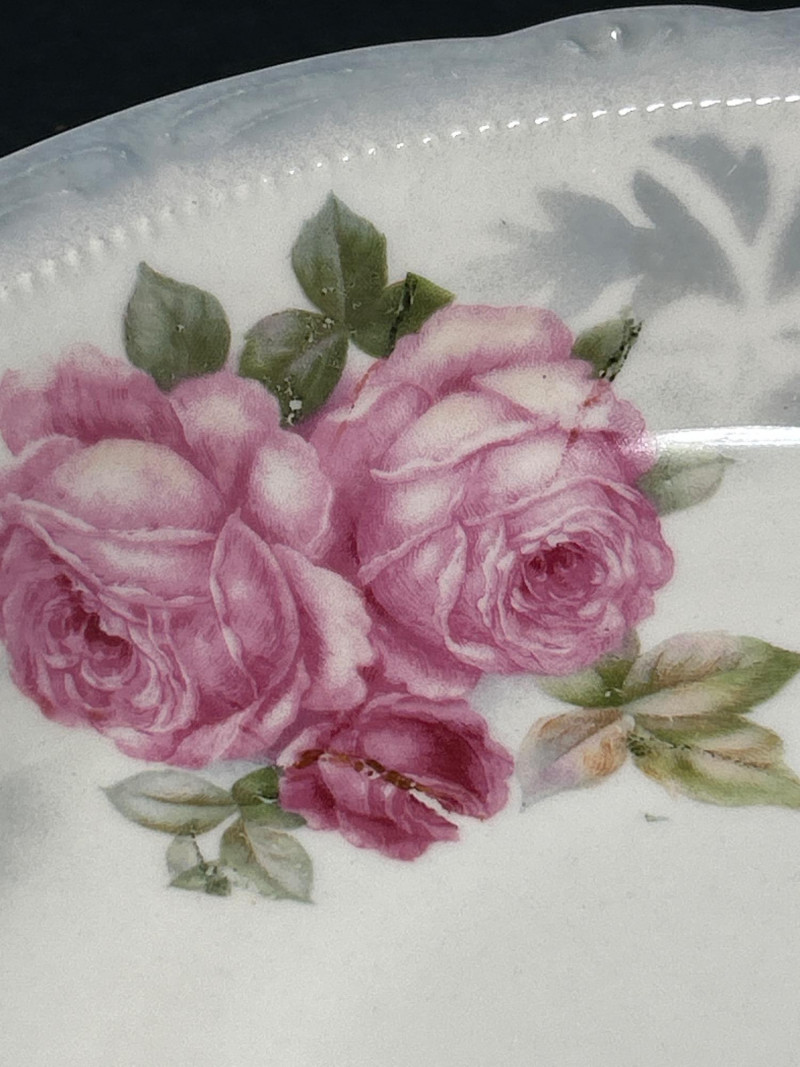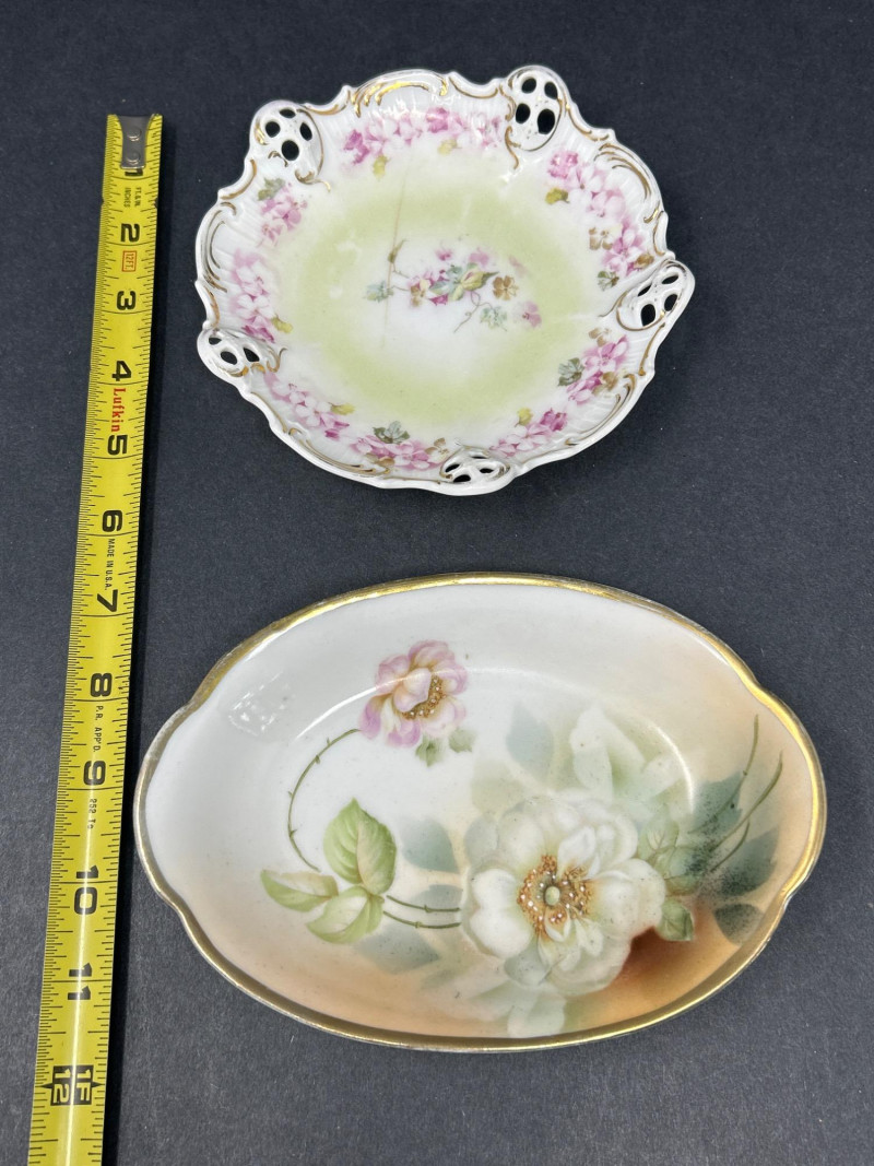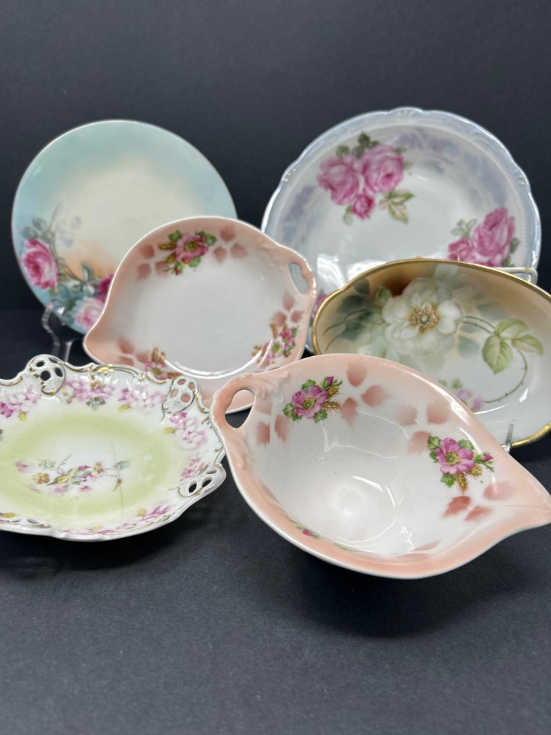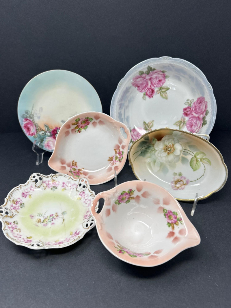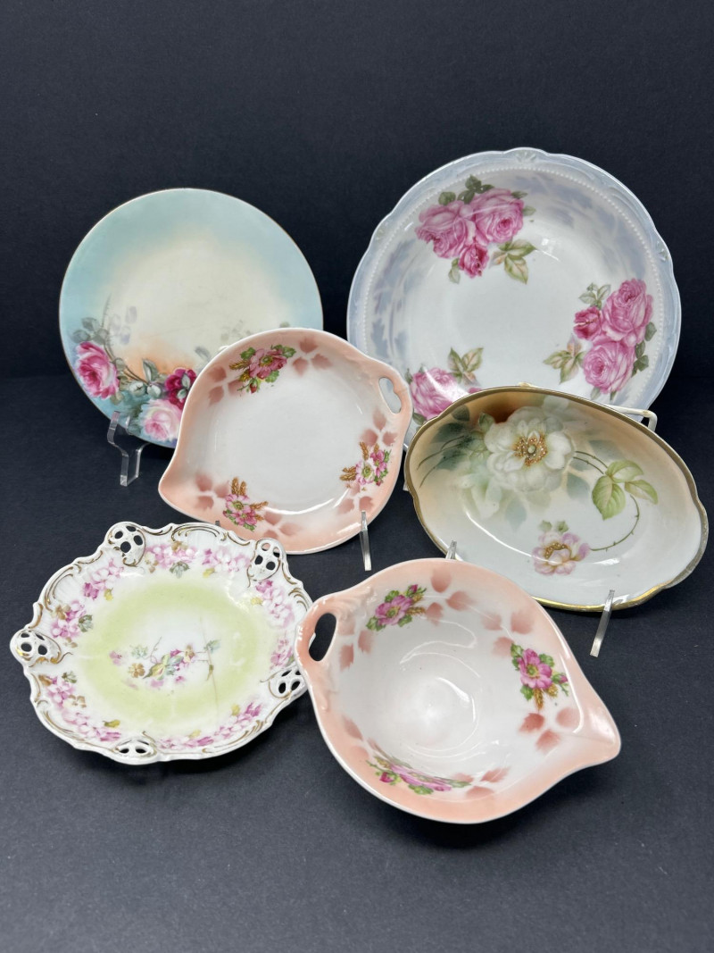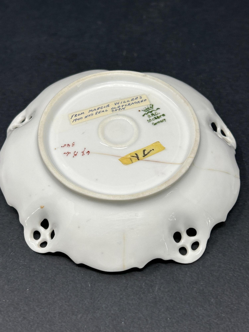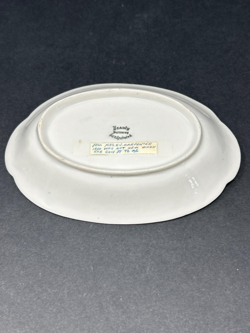 A lovely group of six hand-painted porcelain dishes from late 19th to early 20th century Europe, each featuring delicate floral decoration, soft pastel grounds, and gilt accents. Several pieces retain old family provenance labels noting they were already “old” when gifted in the 1930s–40s, adding sentimental depth and historical continuity. Oval Dish: Decorated with white and pink wild roses and a gilded rim. Stamped Beauty Germany Hand painted. Approx. 7½" × 5". Round Plate: Features pink and magenta roses on a misty blue ground. Marked T&V Limoges France. Approx. 7¼" dia. Round Shallow Bowl: Embellished with pink rose garlands and a raised beaded rim. German porcelain. Approx. 7¼" dia. Reticulated Plate: Light green ground with pink floral garland and gilt accents. Marked B.R.C. Molière Germany. Approx. 6¾" dia. Two Leaf-Form Handled Nut/Bonbon Dishes: Blush pink with rose sprigs. Both stamped Germany 240. Each approx. 5–6" across. Authentic hand-painted European porcelain spanning c. 1890–1920 Includes pieces from Germany and Limoges, France Retains handwritten provenance notes from the 1930s–40s Ideal for tea tables, vanity trays, or curated display A romantic, cohesive set with decorative and historical appealIncluded Pieces